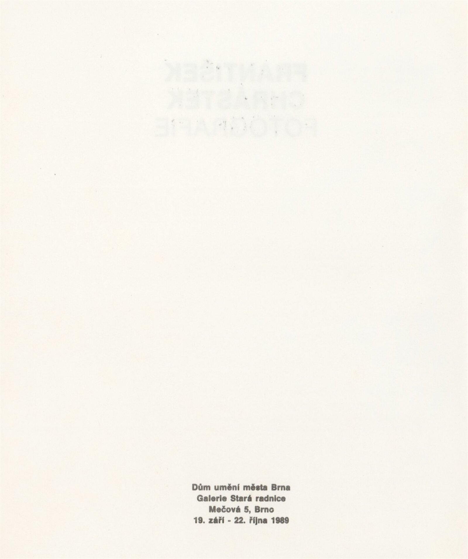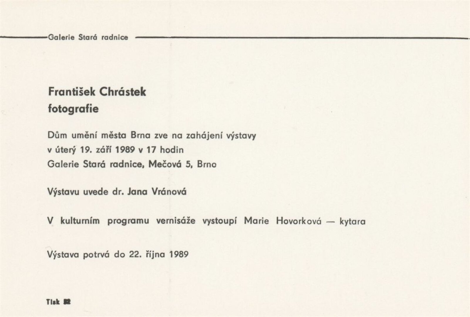 František Chrástek. Fotografie: Galerie Stará radnice , přízemí, 19. 9. – 22. 10. 1989 / Text: Josef Moucha. – Brno: DUmB, 1989. – [12] s., obr., životní data, výstavy, GSR 56. – MZK; MG