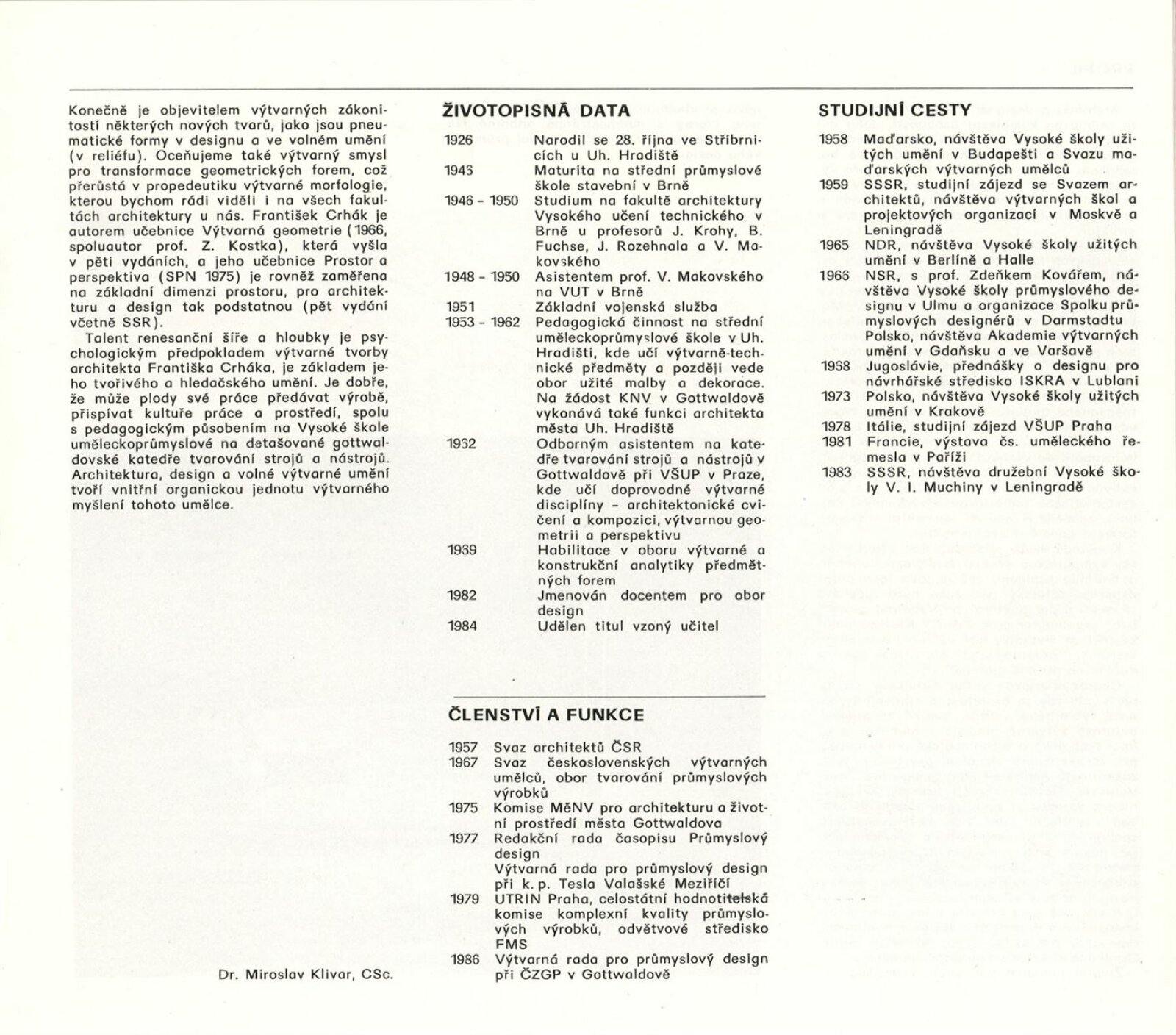František Crhák. Profil architekta-designéra: Dům umění, Galerie Jaroslava Krále, leden–únor [spr. 6. 5. – 24. 5.] 1987 / Texty: Miroslav Klivar, Ľubica Zábranská. – Praha: SČVU, 1987. – [16] s., obr., soupis prací, bibliografie, DU 836. – MZK; MG