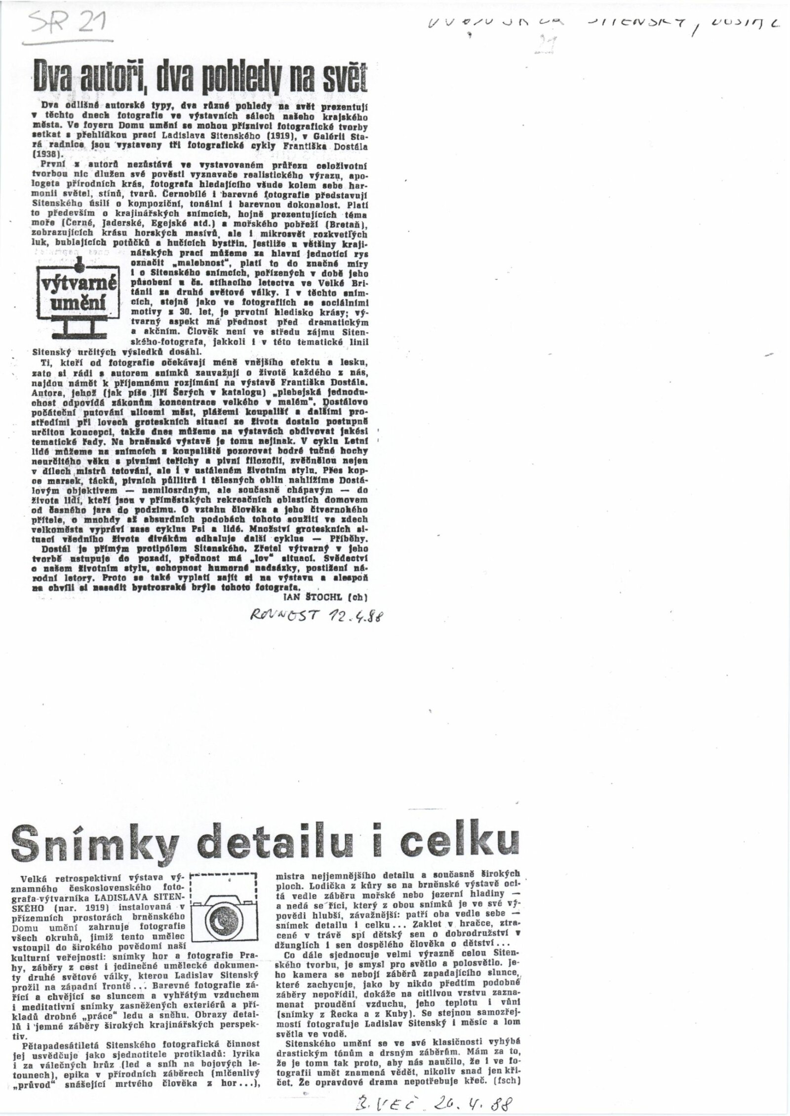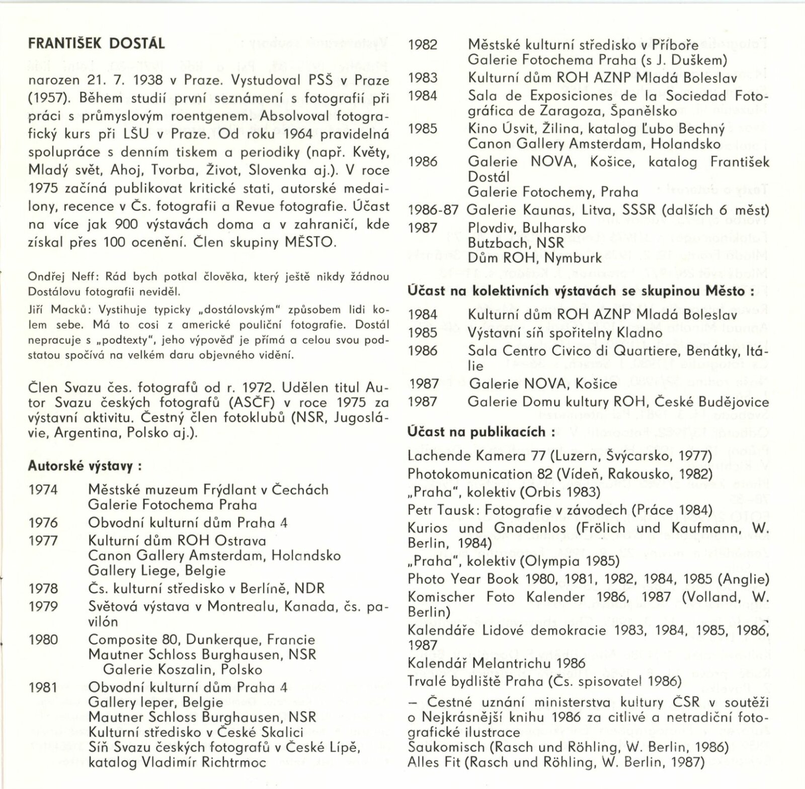 František Dostál. Fotografie: Dům pánů z Kunštátu [spr. Galerie Stará radnice, 17. 3. – 17. 4. 1988] / Texty: Jiří Šerých, Antonín Dufek, autor. – Brno: DUmB, 1988. – [12] s., obr., životní data, výstavy, účast na publikacích, bibliografie, GSR 21. – MZK; MG