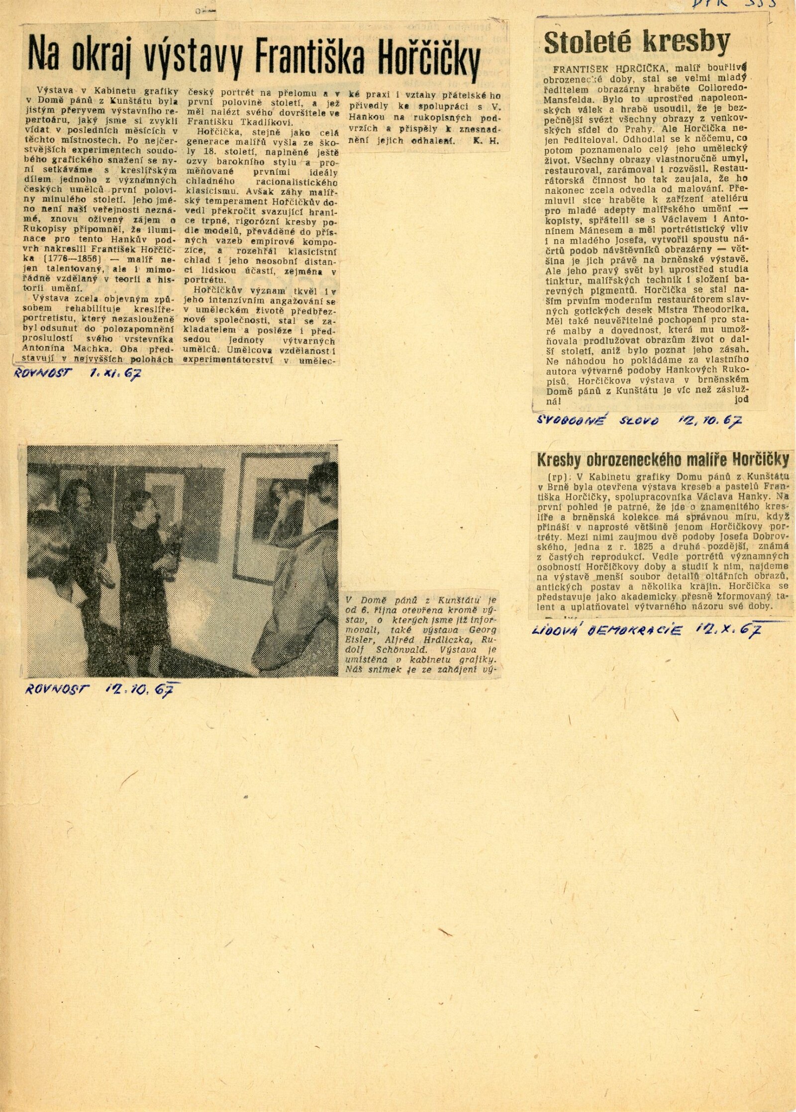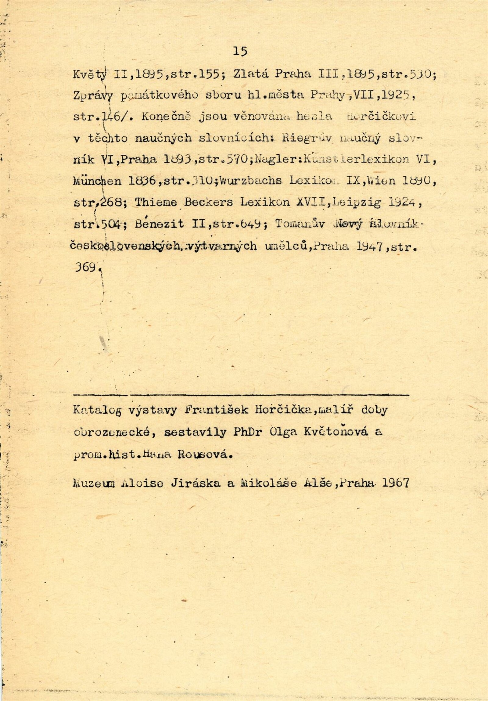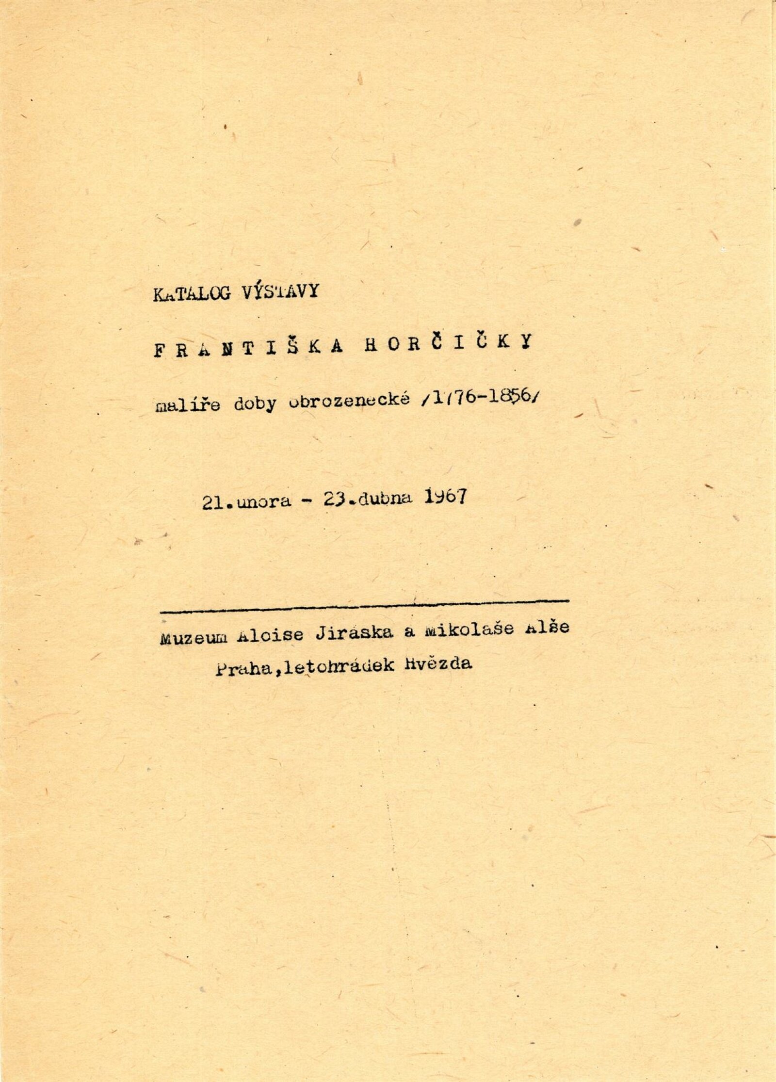 František Horčička: 86. výstava Kabinetu grafiky, Dům umění města Brna/ Dům pánů z Kunštátu, 6. 10. – 29. 10. 1967/ Převzatý katalog. Katalog výstavy Františka Horčičky, malíře doby obrozenské (1776–1856): Muzeum Aloise Jiráska a Mikoláše Alše, Praha, 21. 2. – 23. 4. 1967/ Texty: Olga Květoňová, Hana Rousová. – Praha: Muzeum Aloise Jiráska a Mikoláše Alše, 1967. – 15 s., DPK 355. – MG