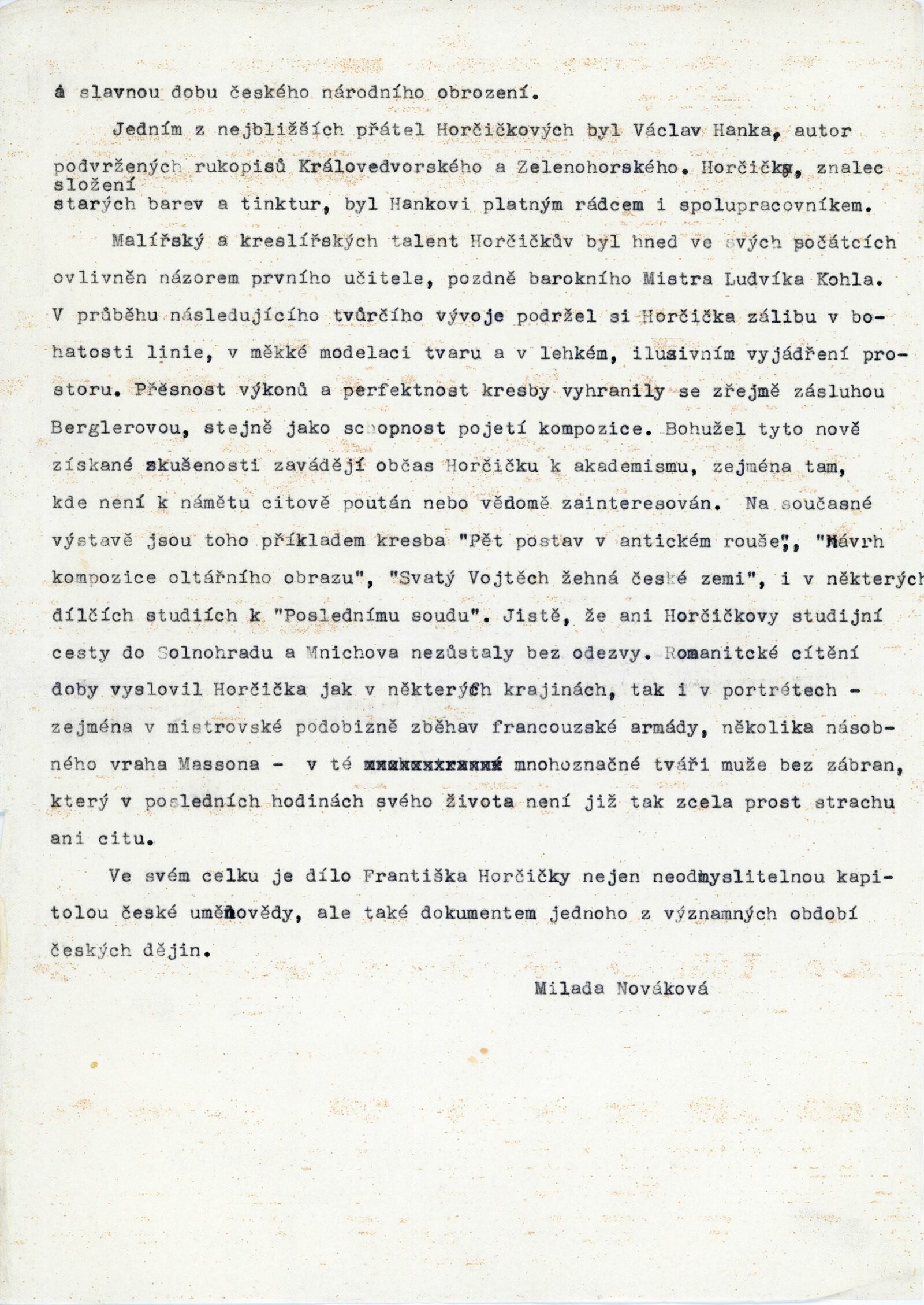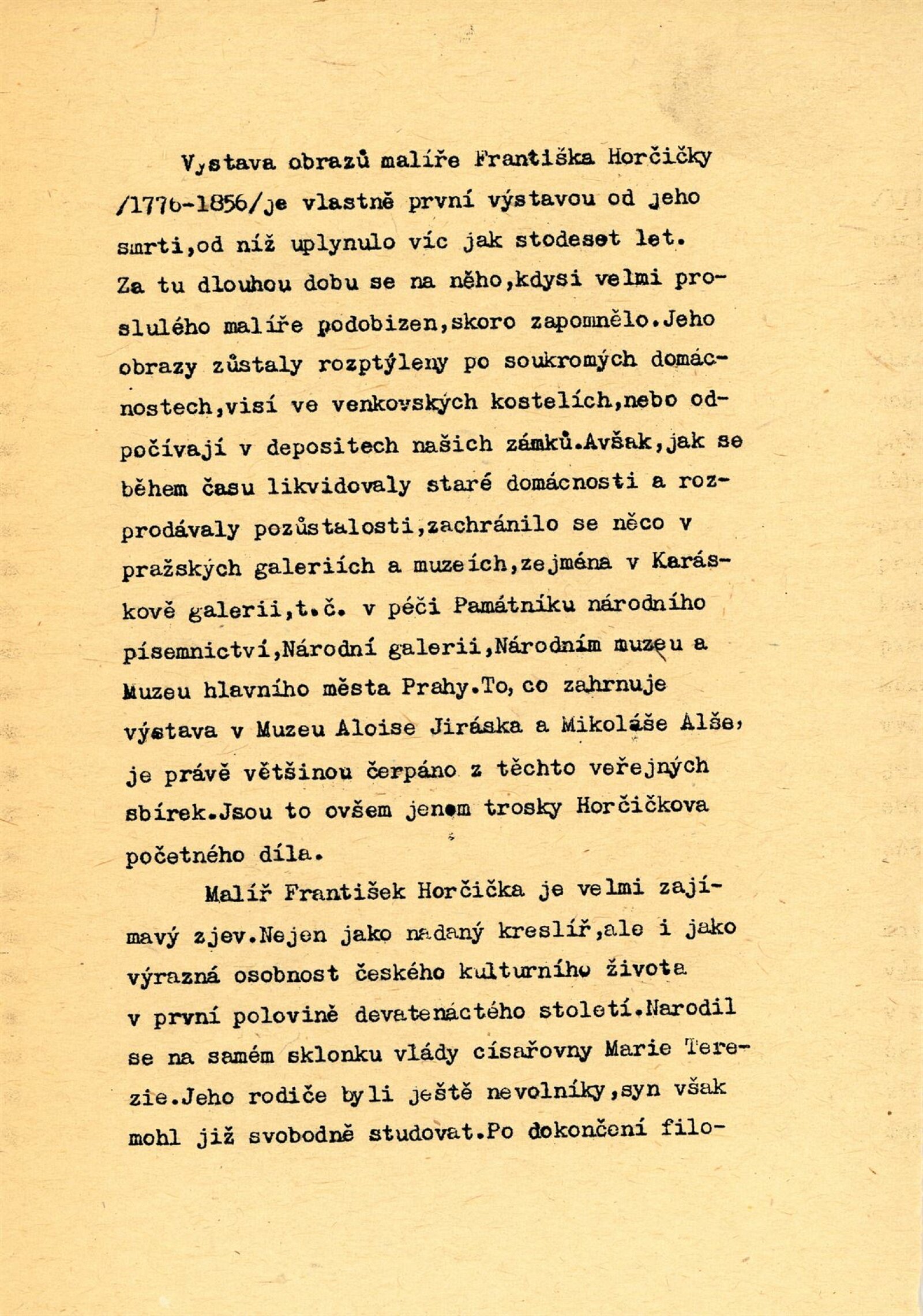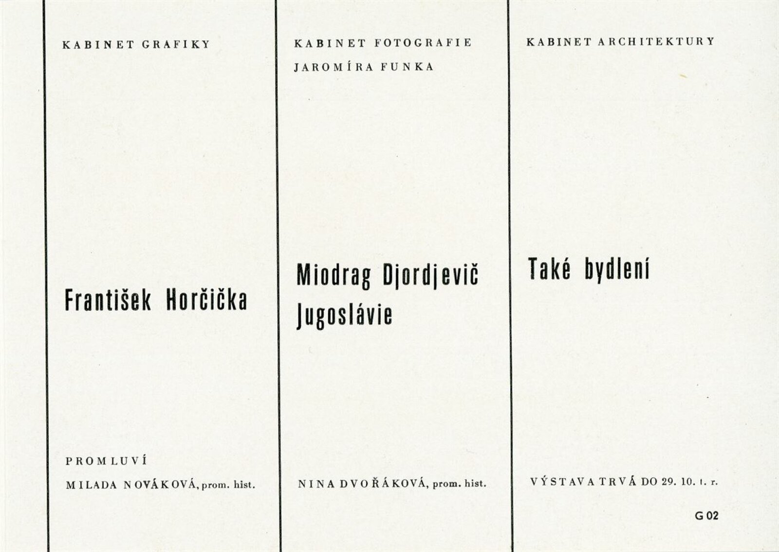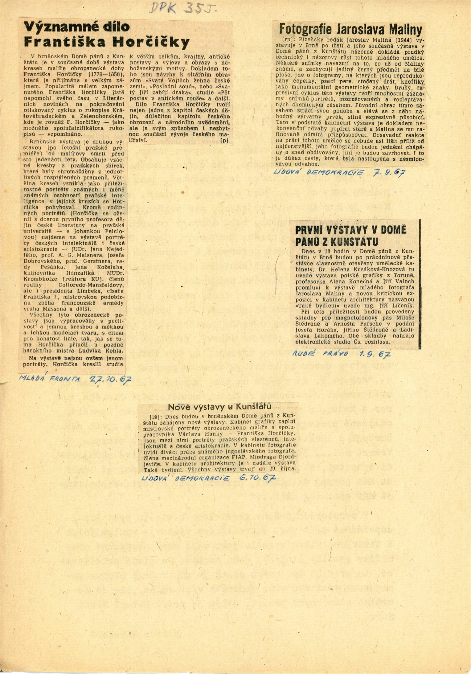 František Horčička: 86. výstava Kabinetu grafiky, Dům umění města Brna/ Dům pánů z Kunštátu, 6. 10. – 29. 10. 1967/ Převzatý katalog. Katalog výstavy Františka Horčičky, malíře doby obrozenské (1776–1856): Muzeum Aloise Jiráska a Mikoláše Alše, Praha, 21. 2. – 23. 4. 1967/ Texty: Olga Květoňová, Hana Rousová. – Praha: Muzeum Aloise Jiráska a Mikoláše Alše, 1967. – 15 s., DPK 355. – MG