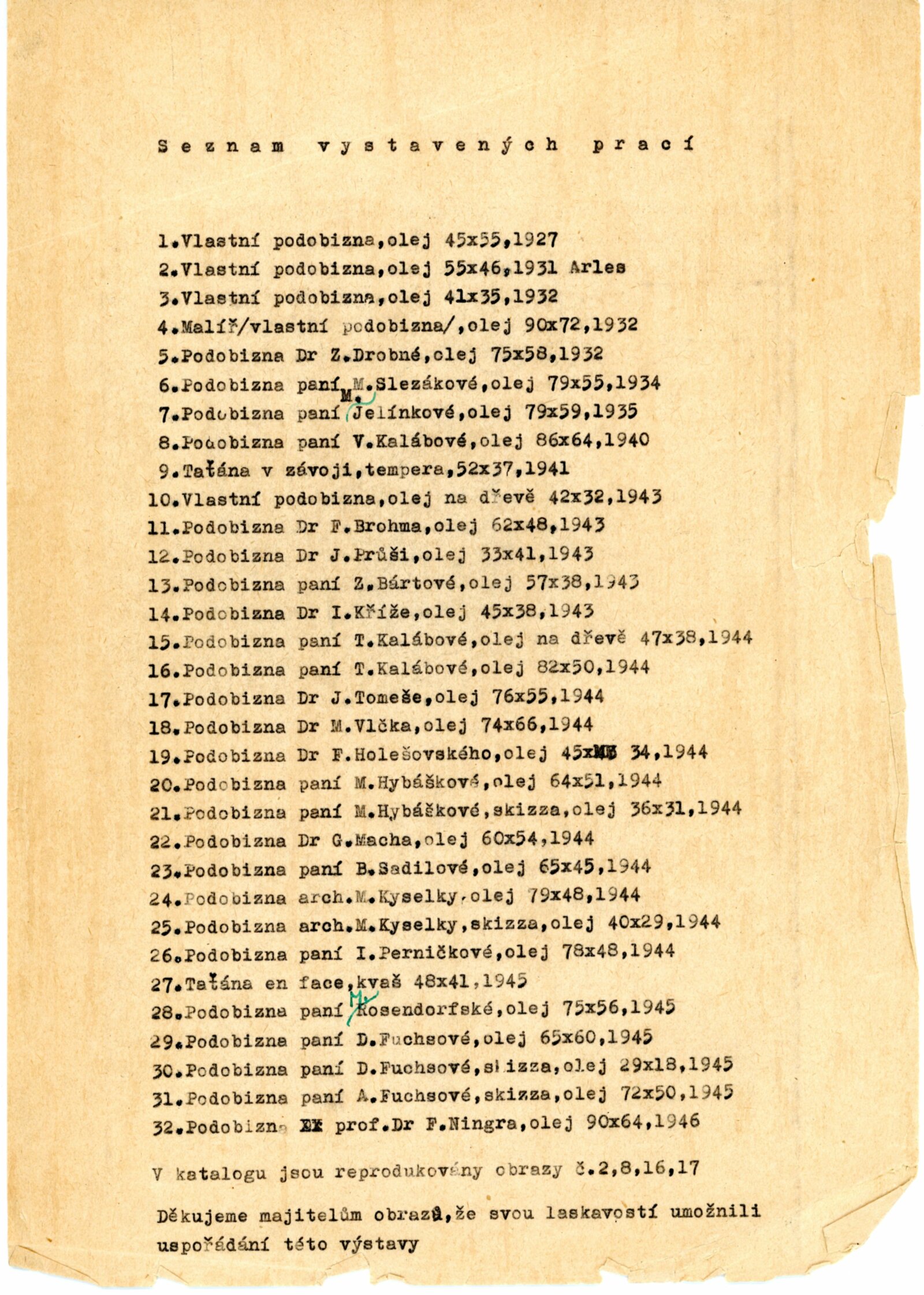 katalog, proslov (Ludvík Kundera, na zahájení výstavy dne 27. 5. 1956), seznam prací, korespondence o zápůjčkách, reversy