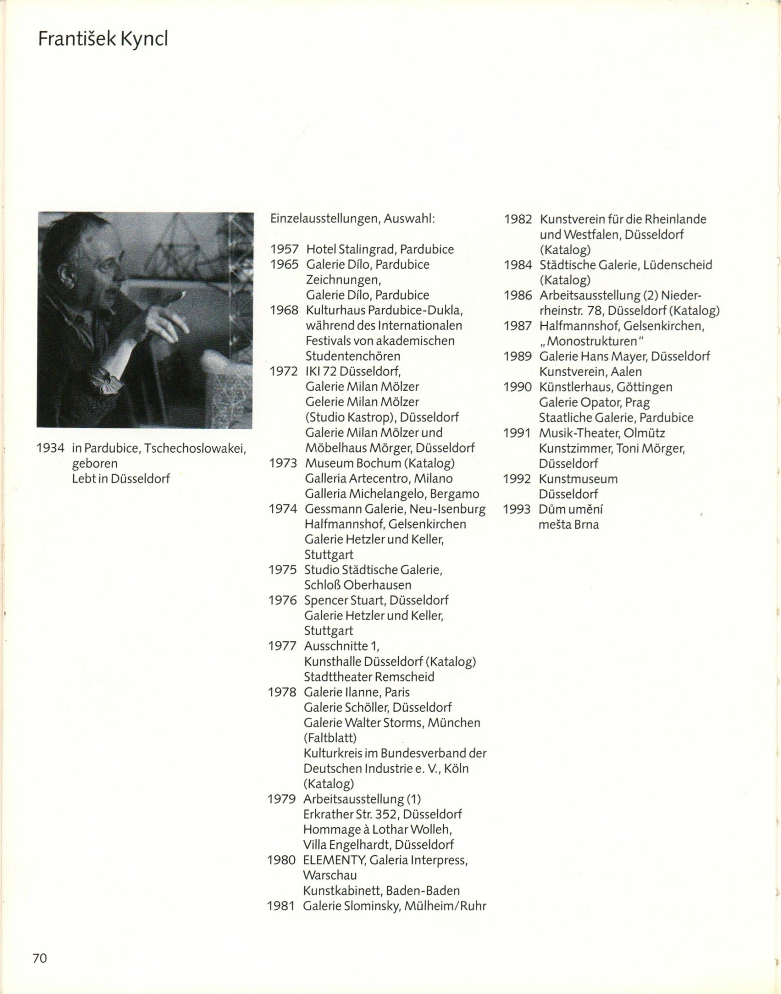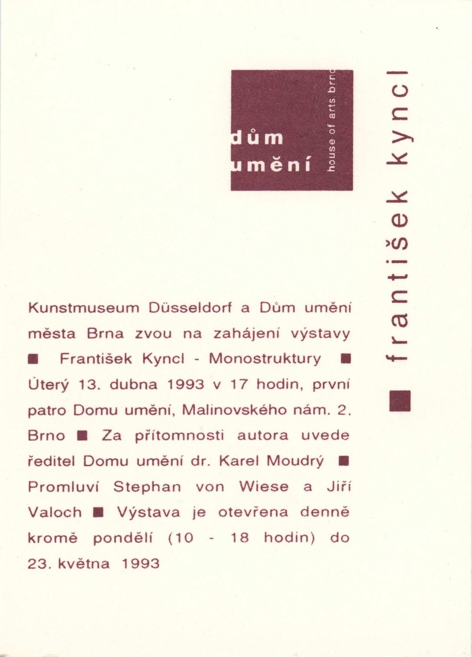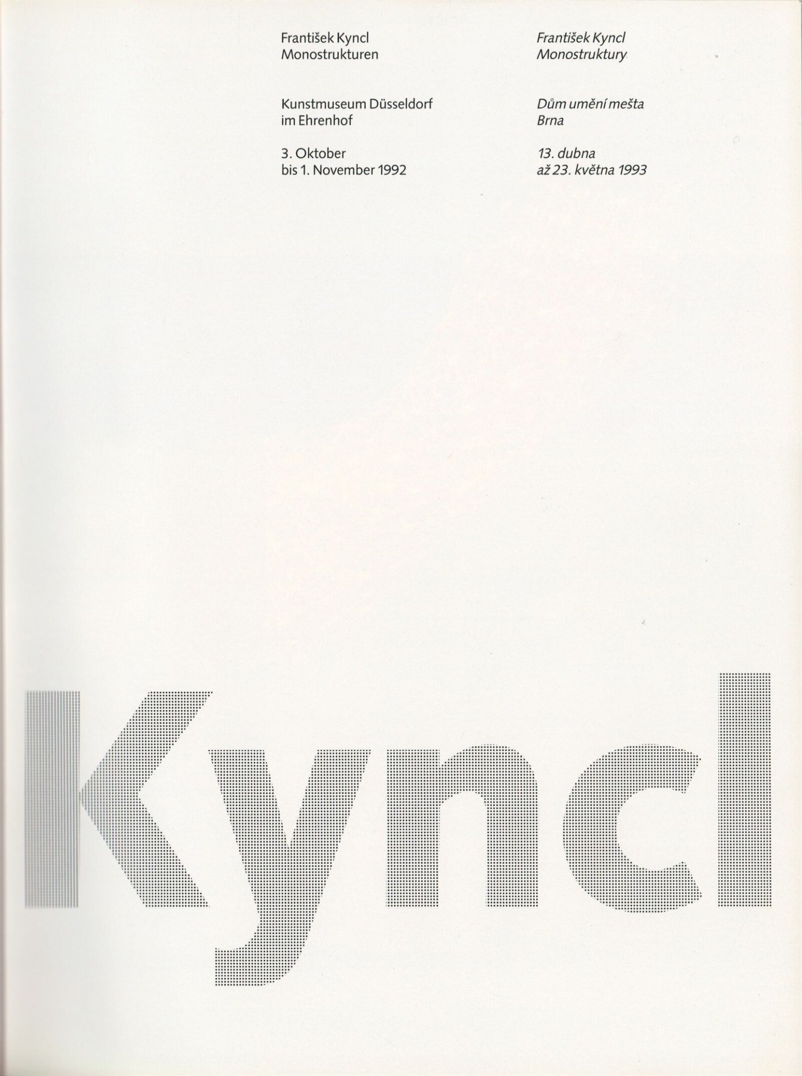 František Kyncl. Monostruktury: ... Dům umění města Brna 13. 4. – 23. 5. 1993 / Text Hans Albers Peters, Karel Moudrý, Stephan von Wiese, Jiří Valoch. - Düsseldorf: Kunstmuseum, - 73 s., obr Portrét, výstavy DU 942; MG