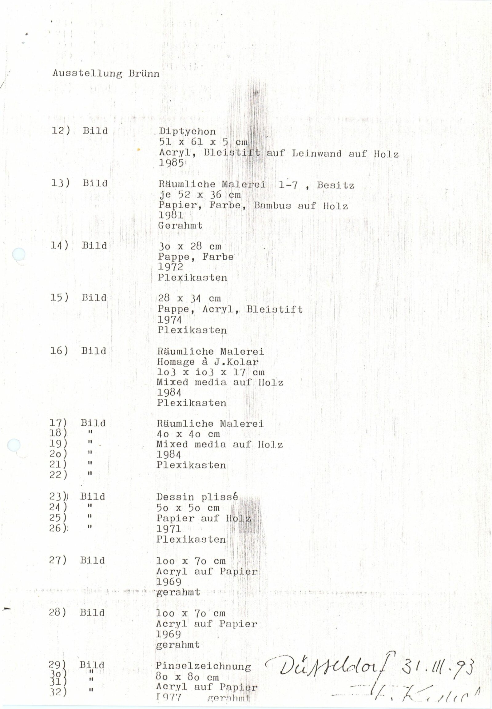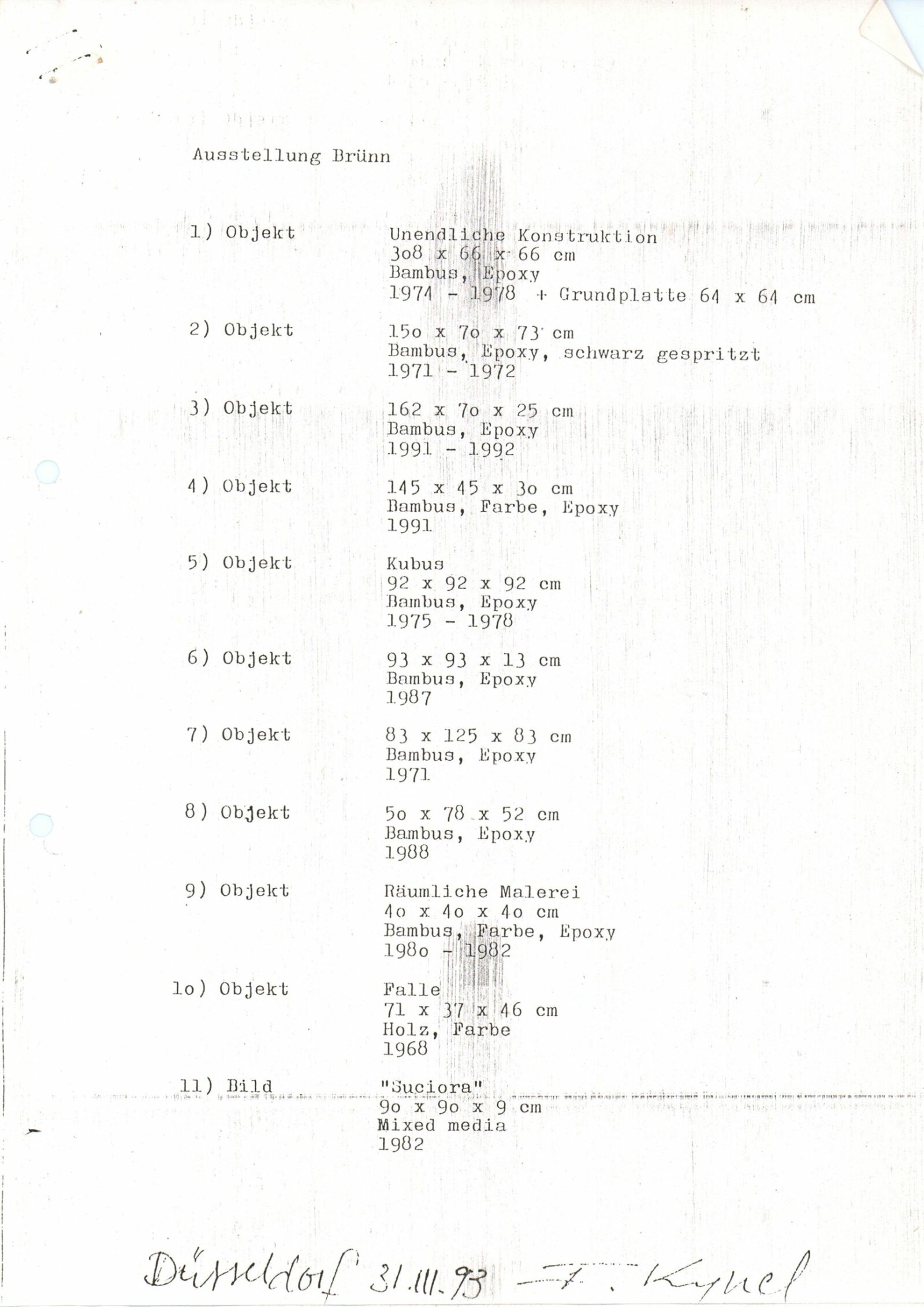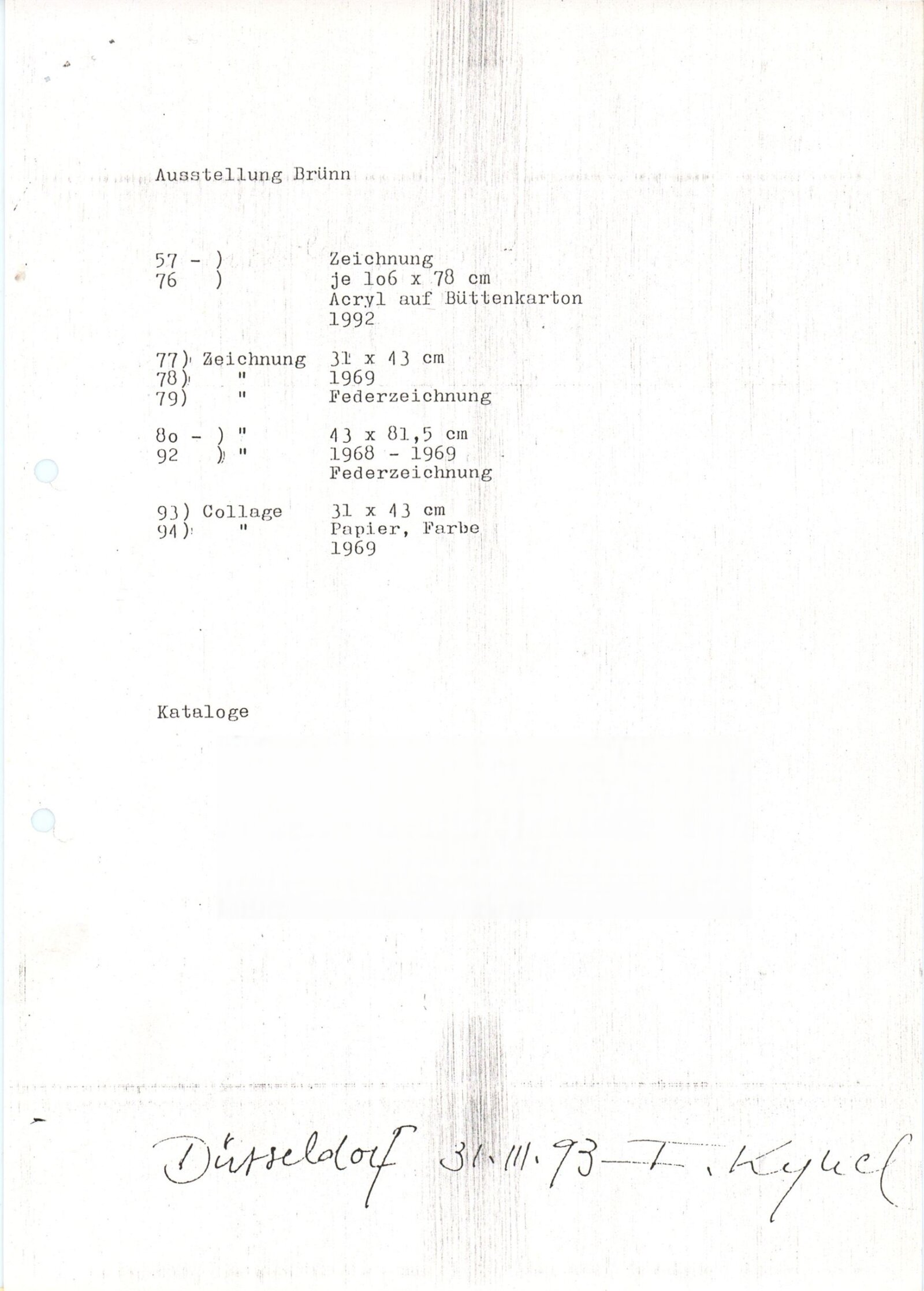 pozvánka, leták, katalog, podklady pro katalog, fotografie díla F. K., korespondence o přípravě výstavy, provozní korespondence, dokumenty o celním řízení se seznamem exponátů, recenze v tisku, poznámky, zpravodaj muzeí v Düsseldorfu (s informací o F. K.), plakát k autorově výstavě v Kunstmuseum Düsseldorf, digitalizovaný videozáznam z výstavy (VHS)