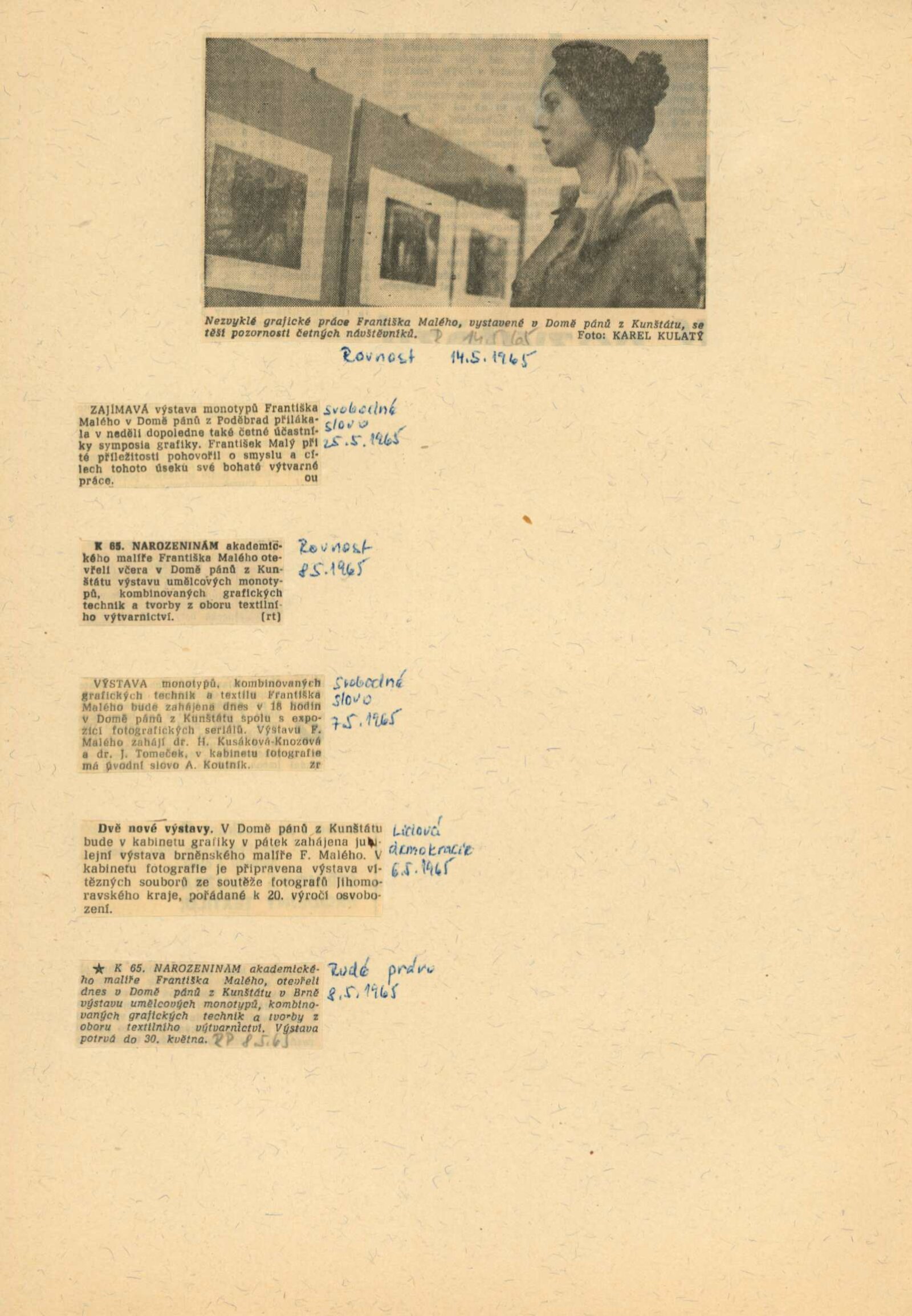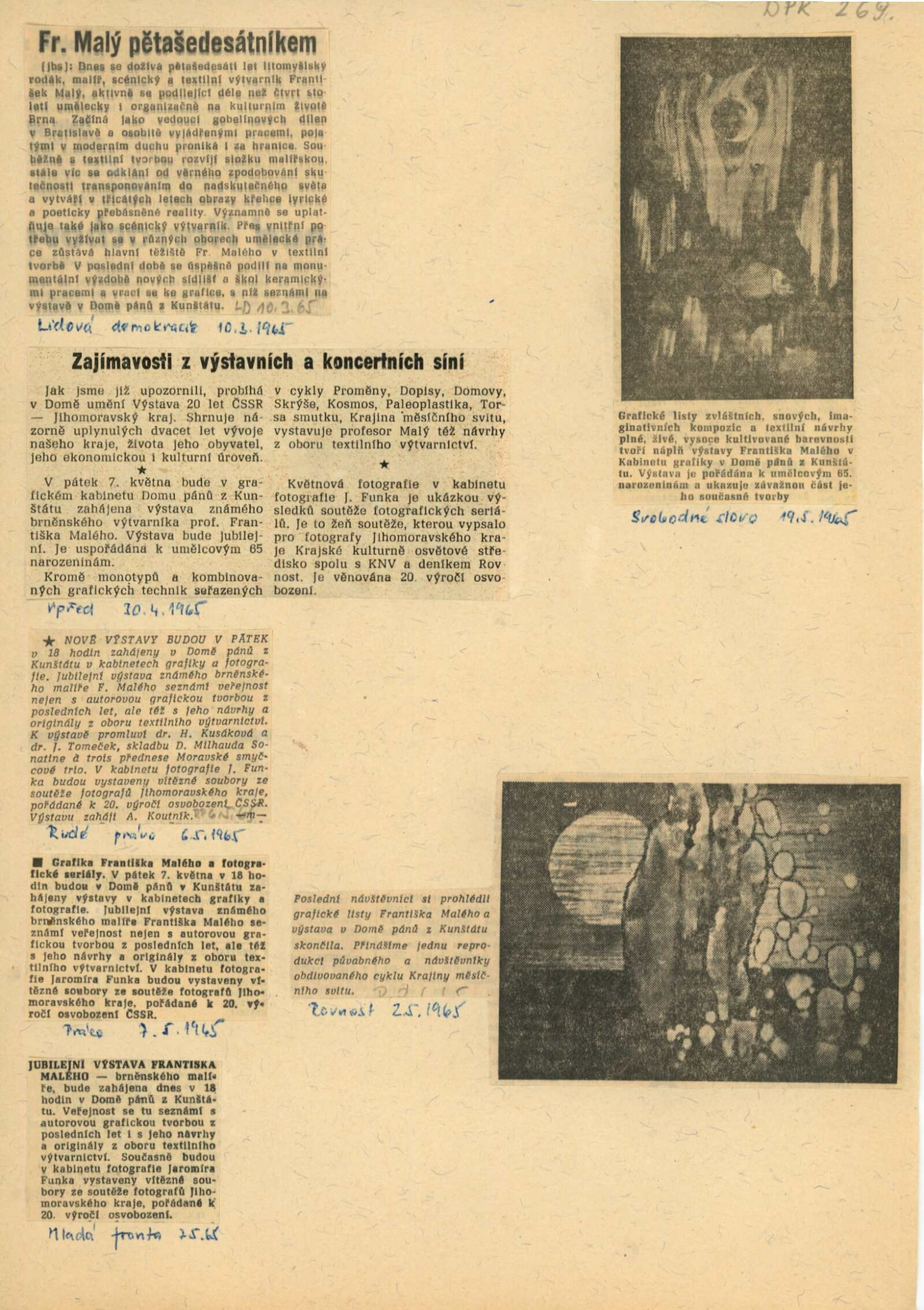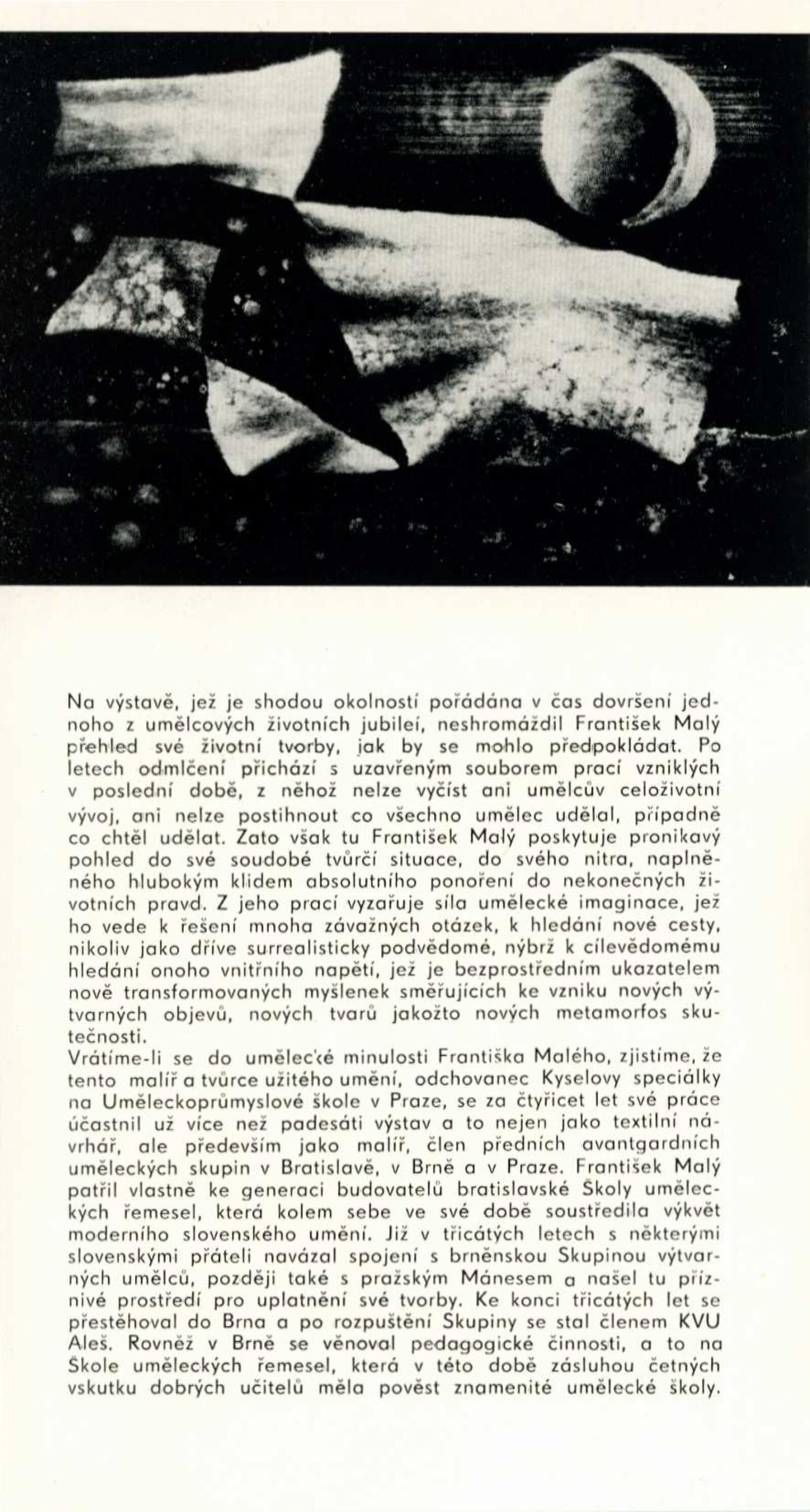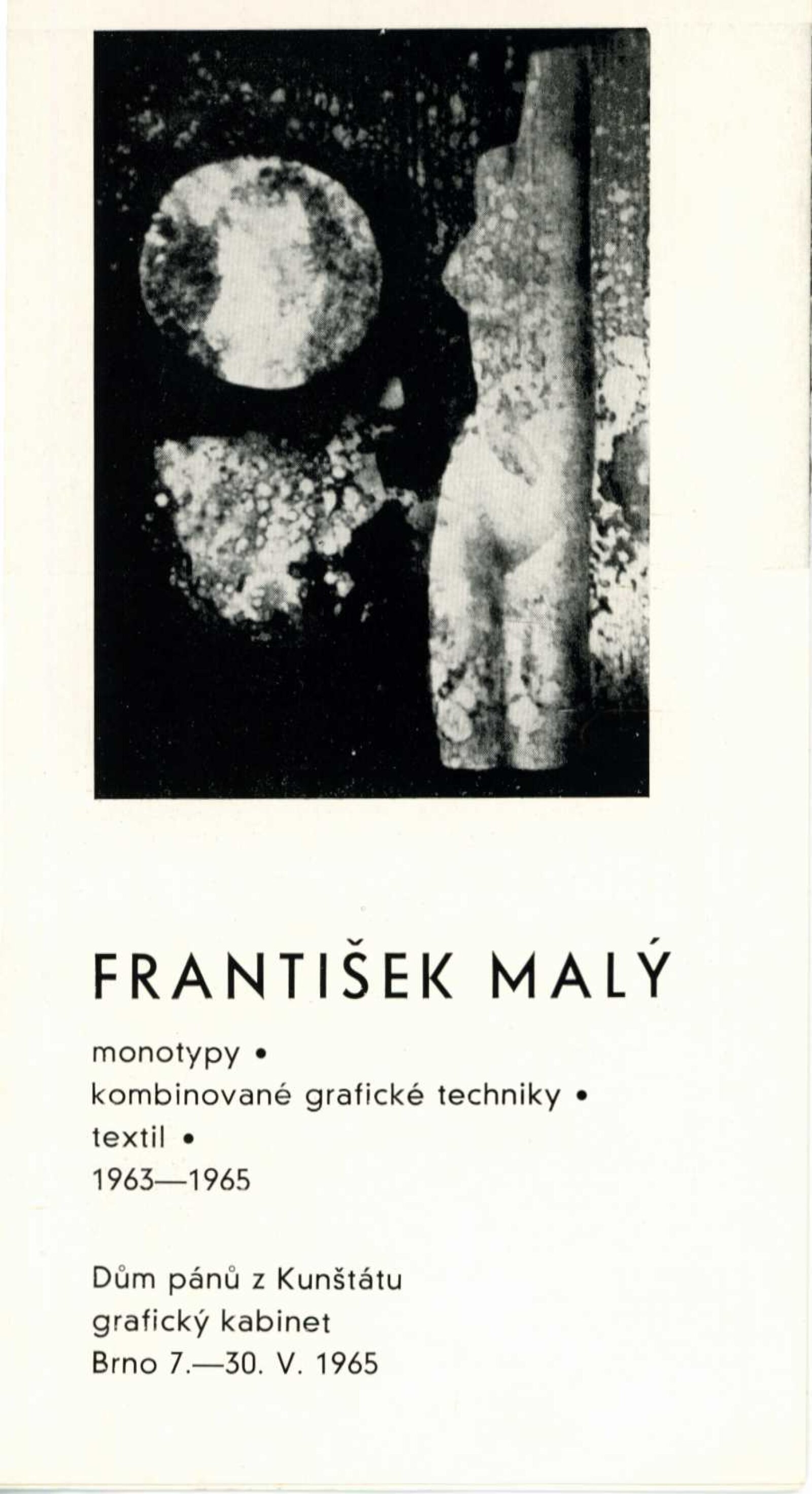 František Malý. Monotypy, kombinované grafické techniky, textil, 1963–1965: Dům umění města Brna / Dům pánů z Kunštátu, 66. výstava Kabinetu grafiky, 7. 5. – 30. 5. 1965 / Text: Helena Kusáková-Knozová. – Brno: DUmB, 1965. – skládačka, 6 s., obr., DPK 269. – MZK; MG; MMB