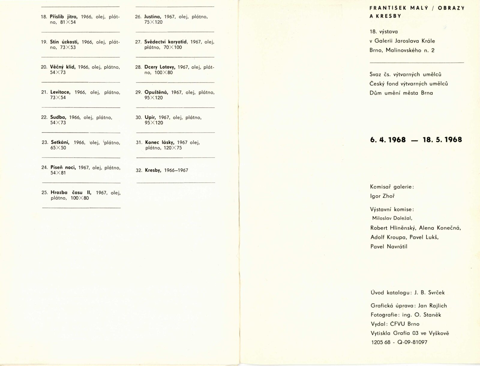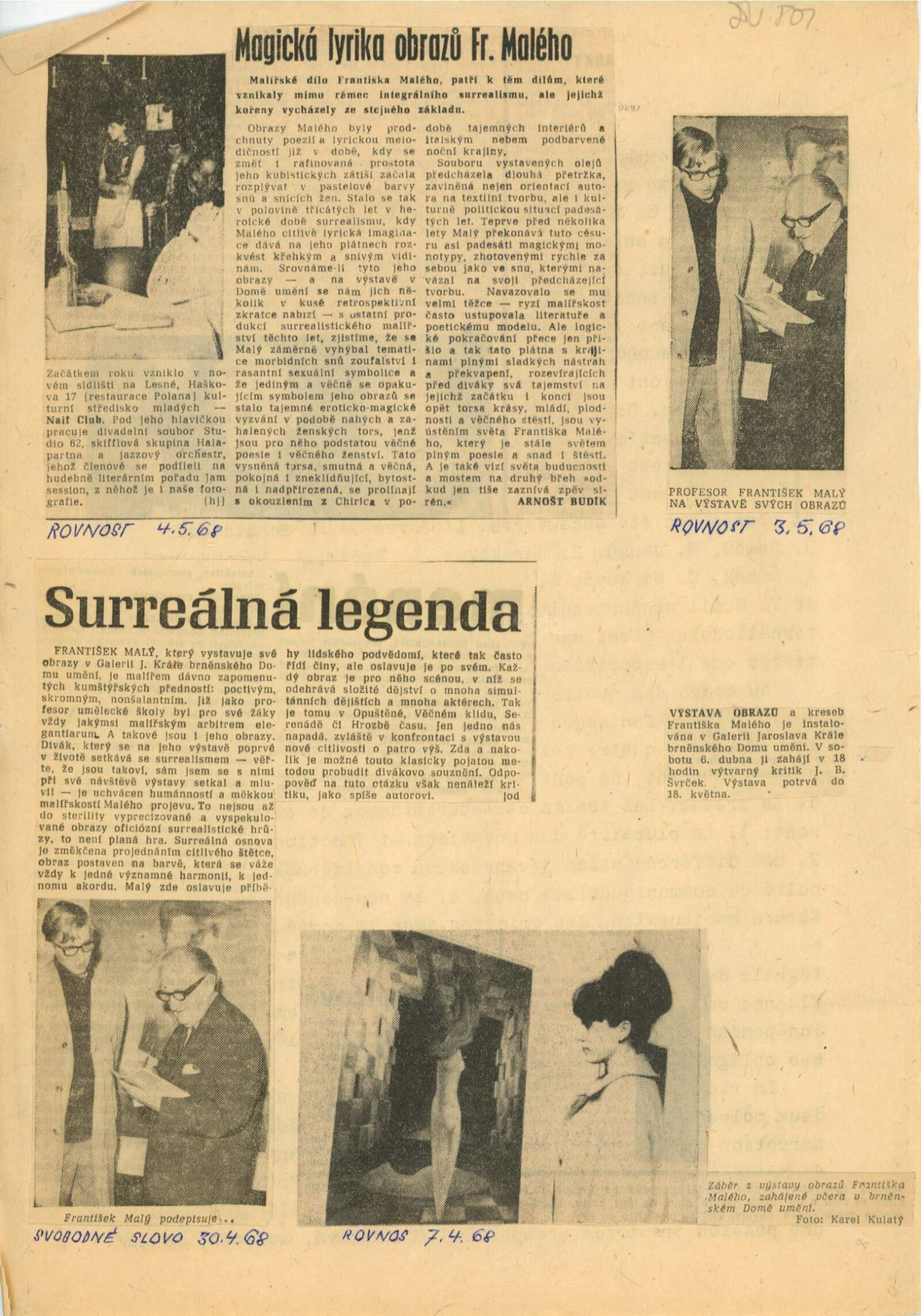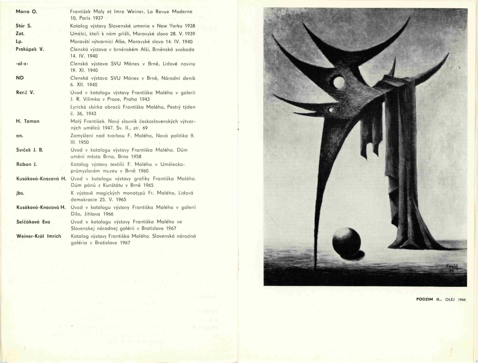 František Malý. Obrazy a kresby 19330–1936, 1966–1967: Dům umění, 18. výstava v Galerii Jaroslava Krále, 6. 4. – 18. 5. 1968 / Text: Jaroslav B. Svrček. – Brno: ČFVU, 1968. – 22 s., obr., portrét, životní data, bibliografie, DU 501. – MG; MMB