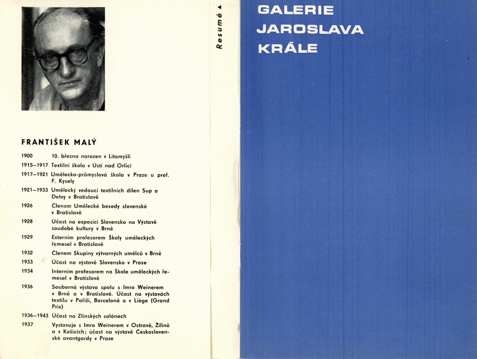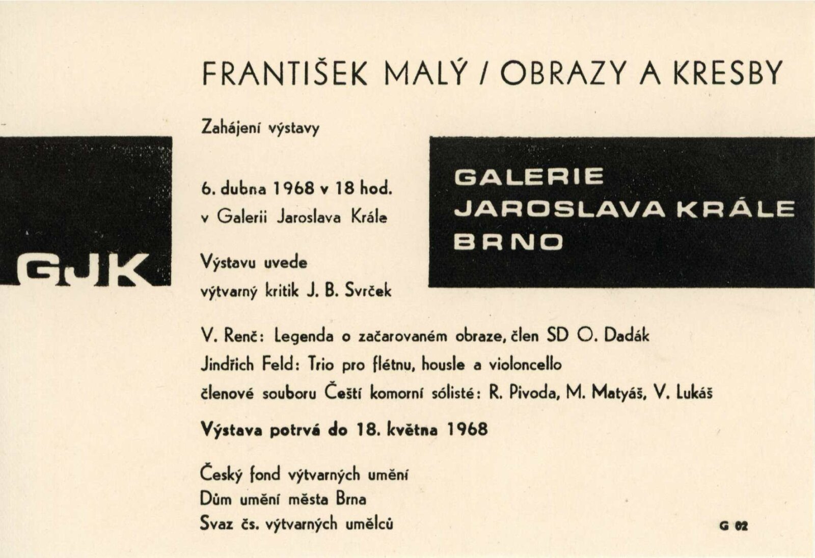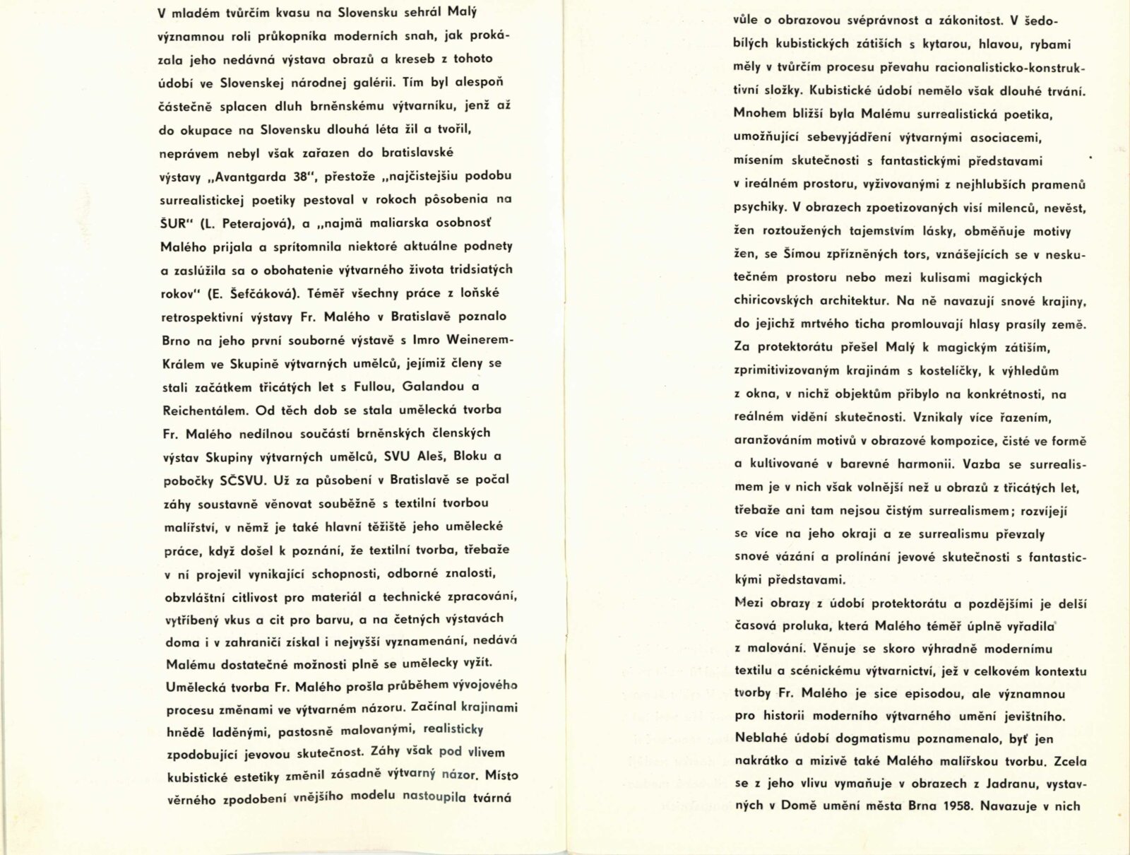 František Malý. Obrazy a kresby 19330–1936, 1966–1967: Dům umění, 18. výstava v Galerii Jaroslava Krále, 6. 4. – 18. 5. 1968 / Text: Jaroslav B. Svrček. – Brno: ČFVU, 1968. – 22 s., obr., portrét, životní data, bibliografie, DU 501. – MG; MMB