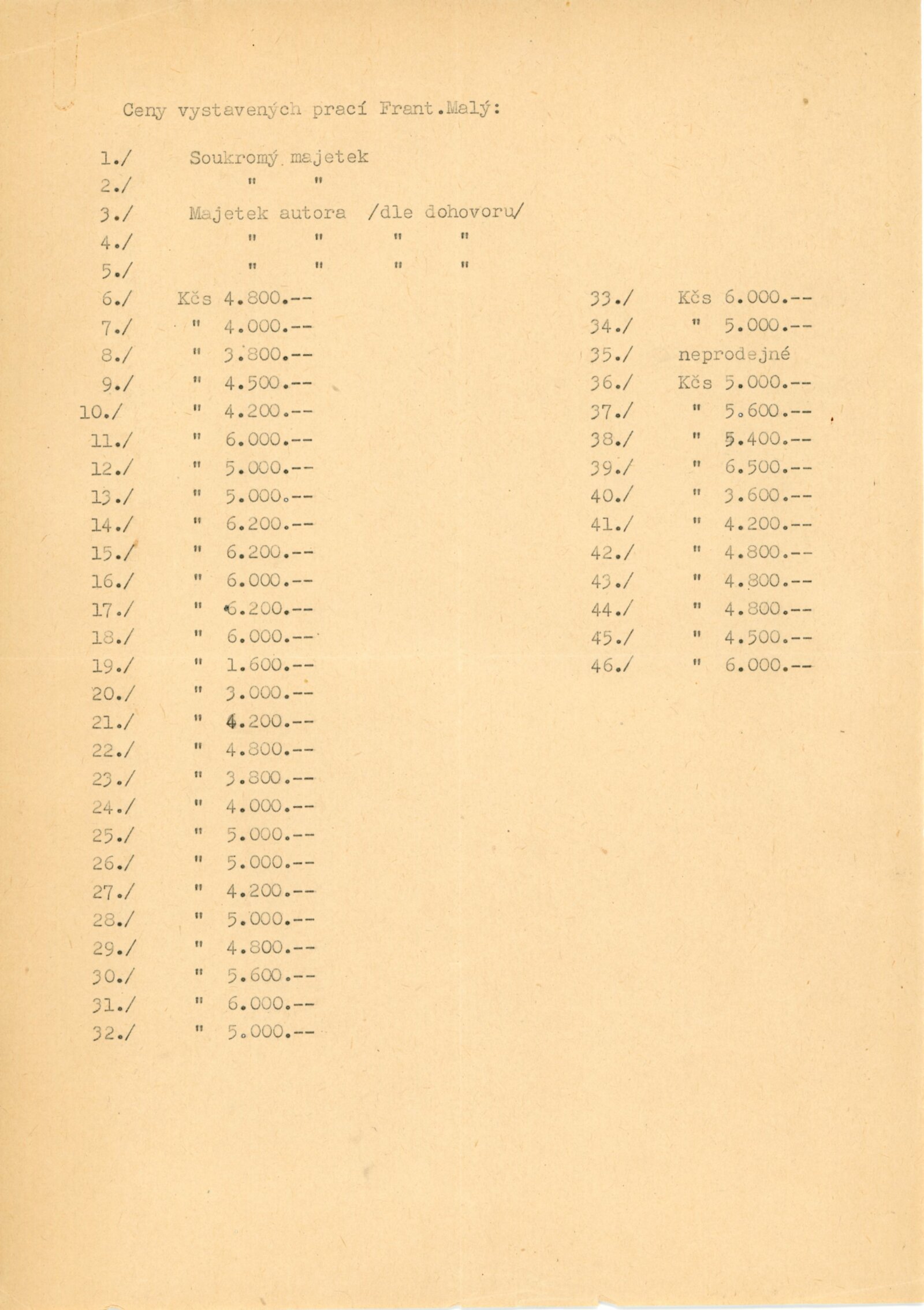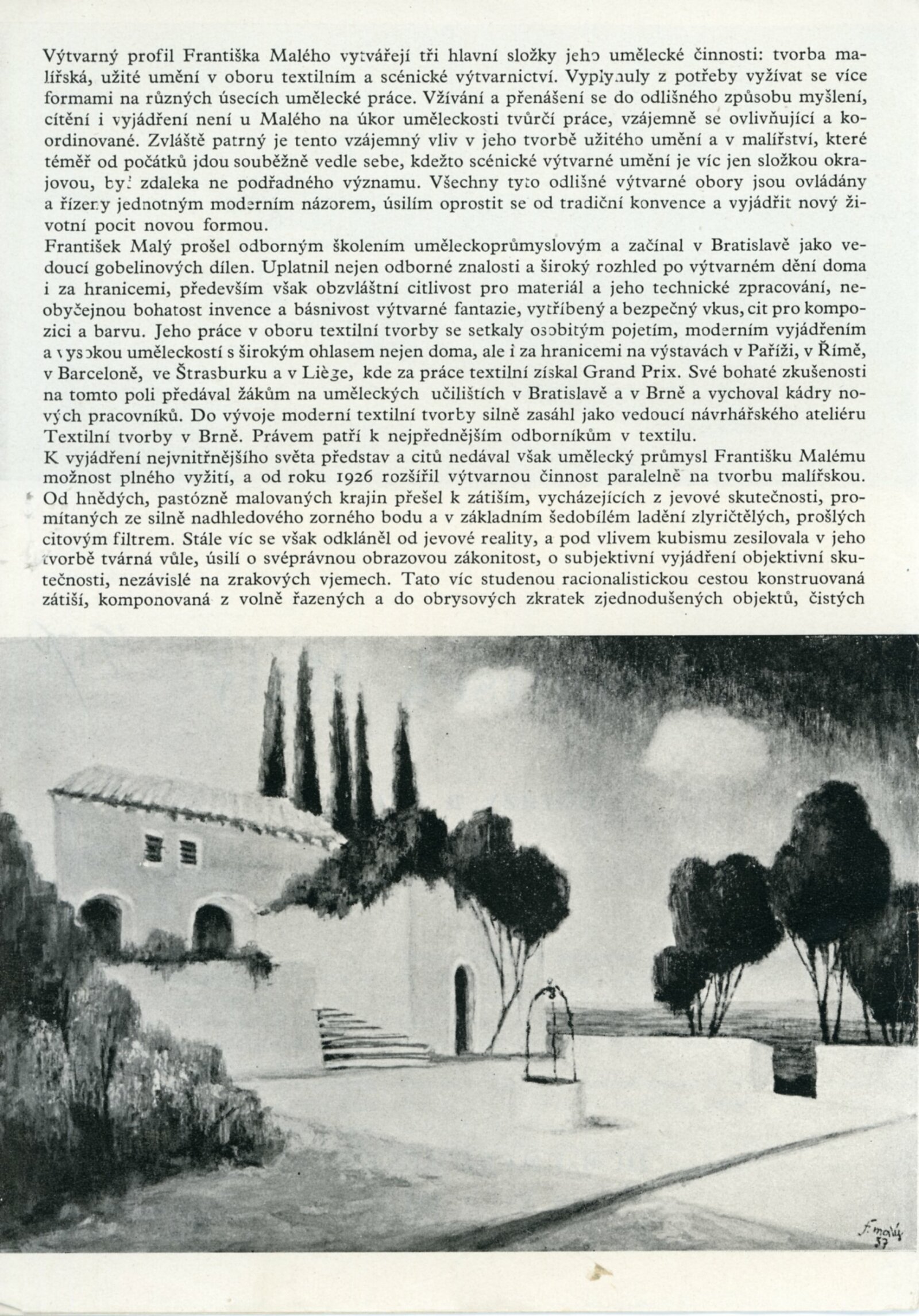 pozvánka, katalog, reprodukce děl, náhledy pro katalog, biografie autora, seznam prací (s cenami), rukopis dopisu Františka Malého, seznam výstav Františka Malého do roku 1967, provozní korespondence, recenze v tisku