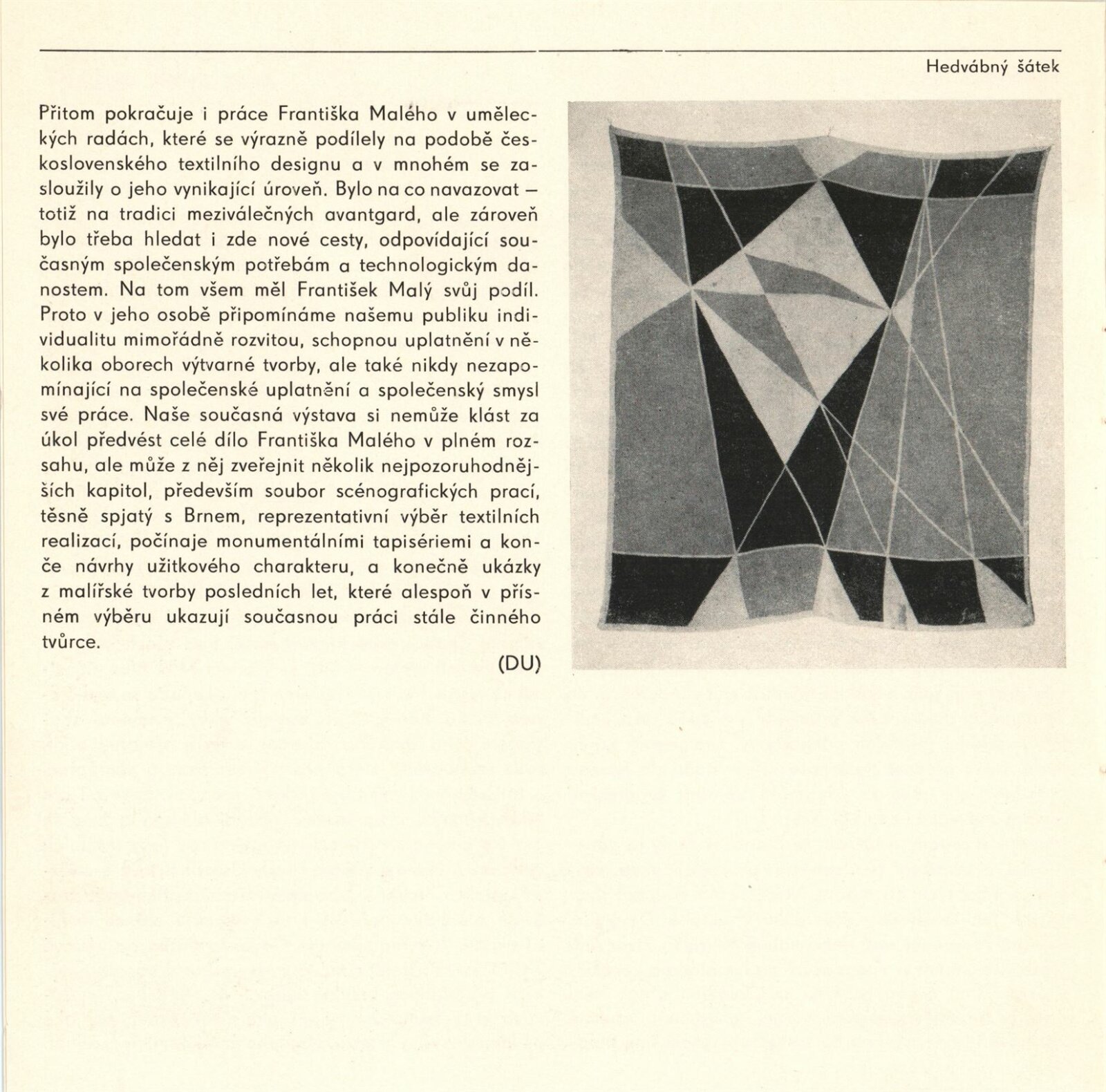 František Malý. Užitá tvorba: Dům umění / Dům pánů z Kunštátu, 1. patro, 4. 5. – 1. 6. 1980 / Texty: Eliška Lysková, Zuzana Ledererová. – Brno: DUmB, 1980. – 13 s., obr., životopis, DPK 736. – MZK; MG; MMB