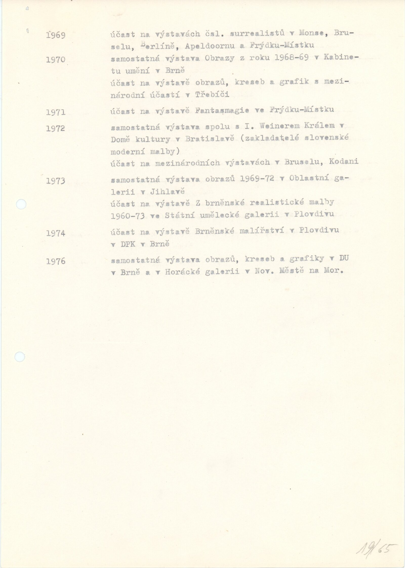 pozvánka, katalog, fotografie instalace, fotografie děl, seznamy vystavených děl a texty popisků, strojopis textu katalogu, provozní korespondence (instituce - žádosti u výpůjčky, dopis autorovi o zařazení výstavy, žádost o povolení výstavy), reversy, recenze v tisku