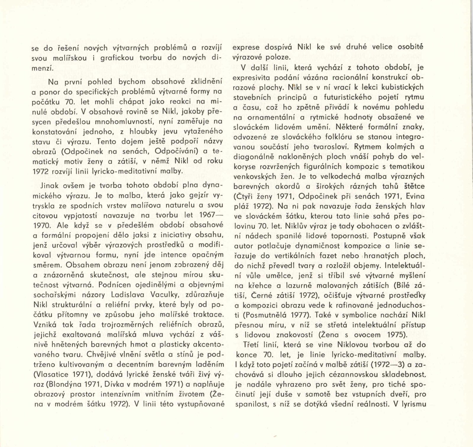 František Nikl. Malba a grafika 1963–1984: Dům umění, Galerie Jaroslava Krále, 14. 1. – 2. 2. 1986 / Převzatý katalog. František Nikl. Malba a grafika 1963–1984: Dům umění Gottwaldov prosinec 1984–leden 1985 / Text: Ĺubica Zábranská. – Hodonín: Galerie výtvarného umění, 1984. – 34 s., obr., portrét, životní data, výstavy, realizace, seznam výtvarných děl, DU 812. – MZK; MG