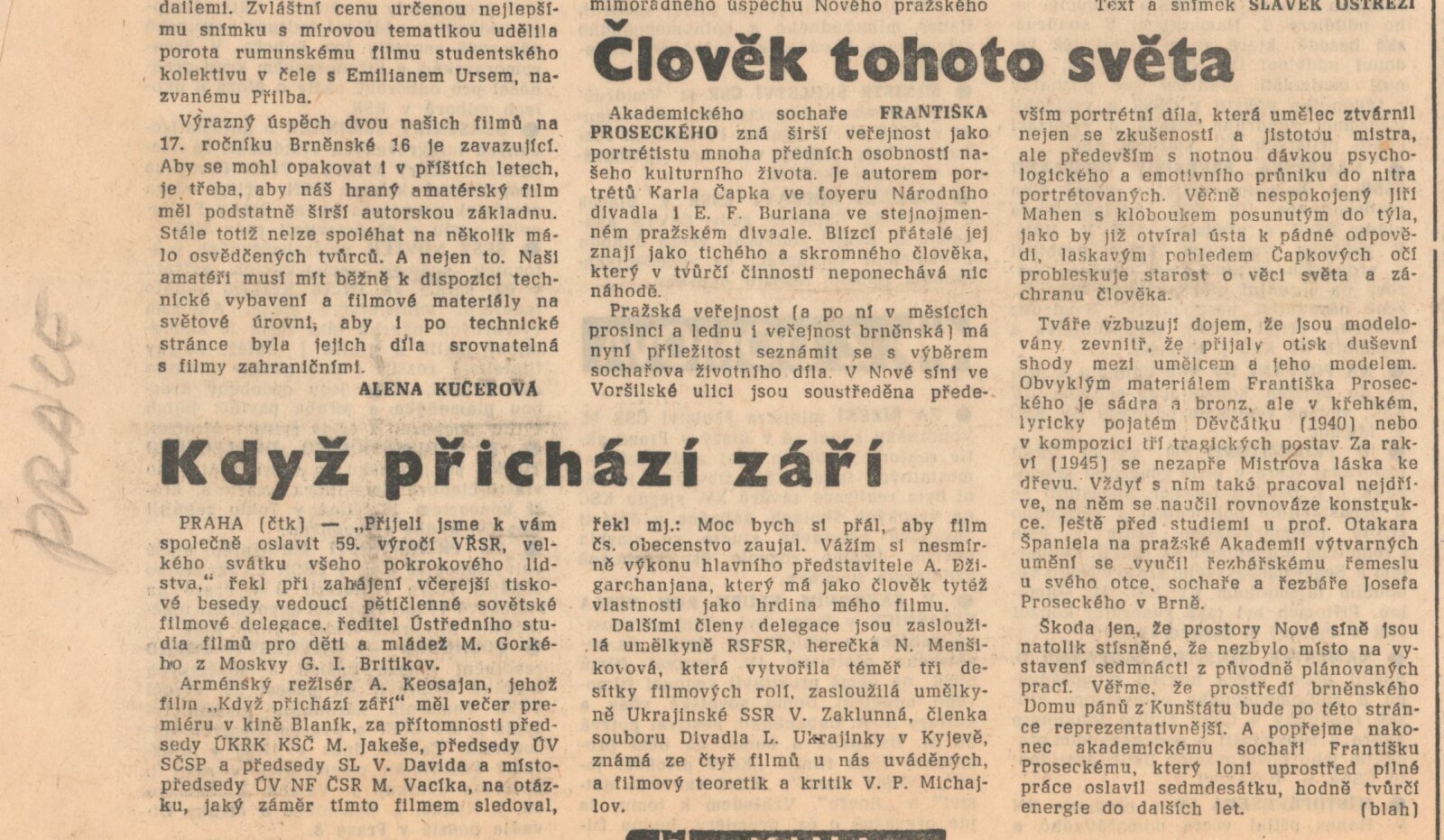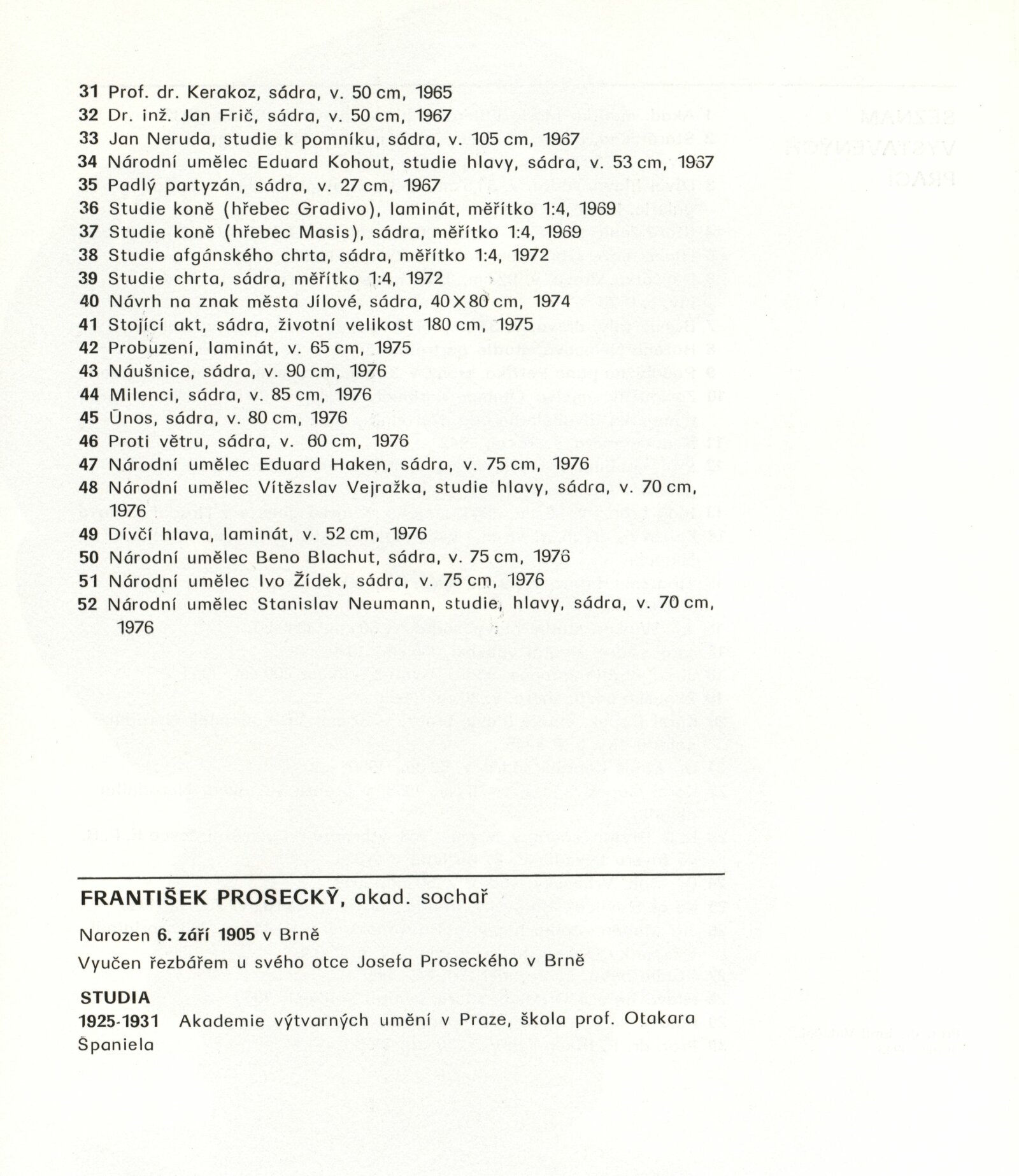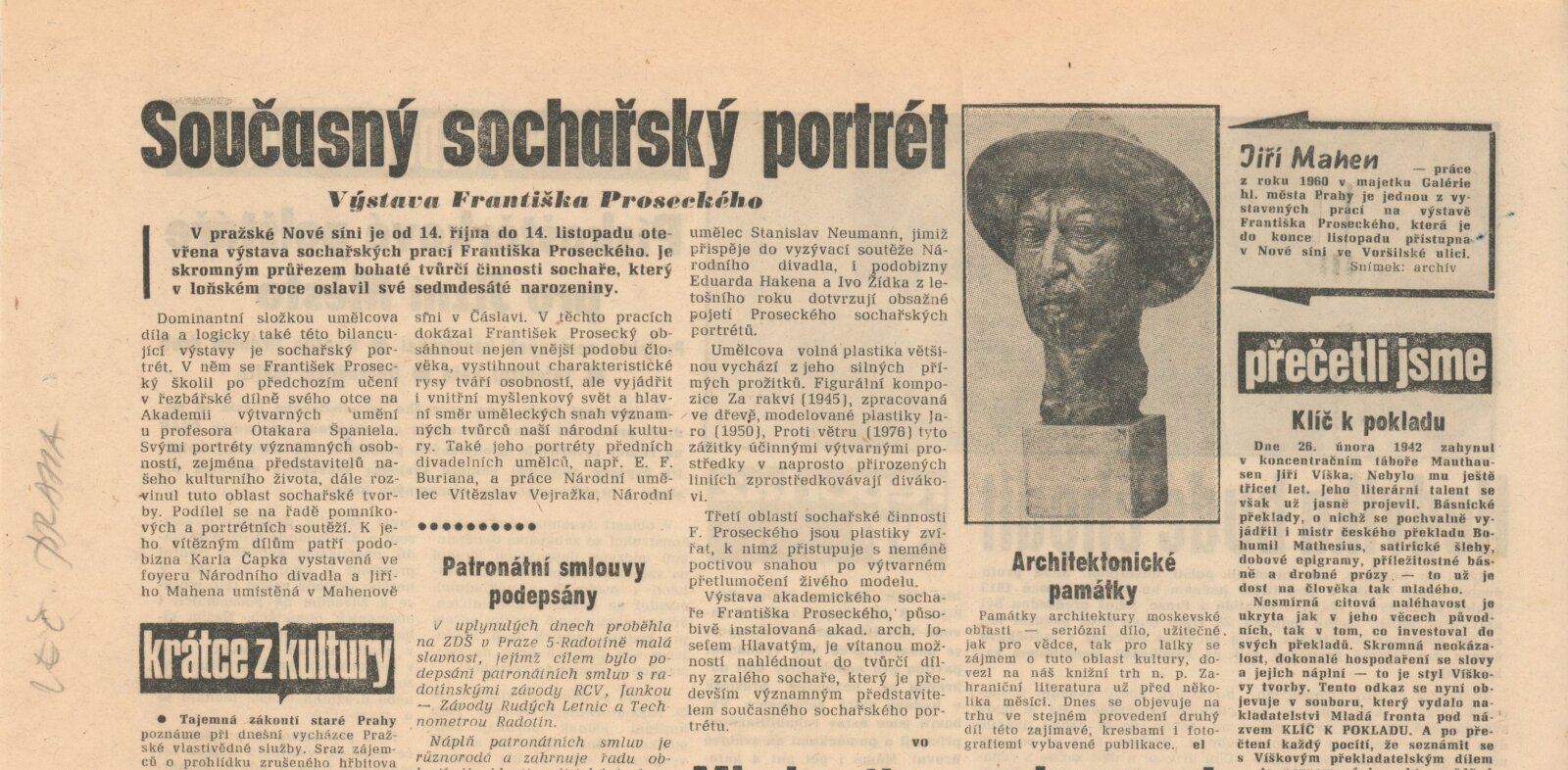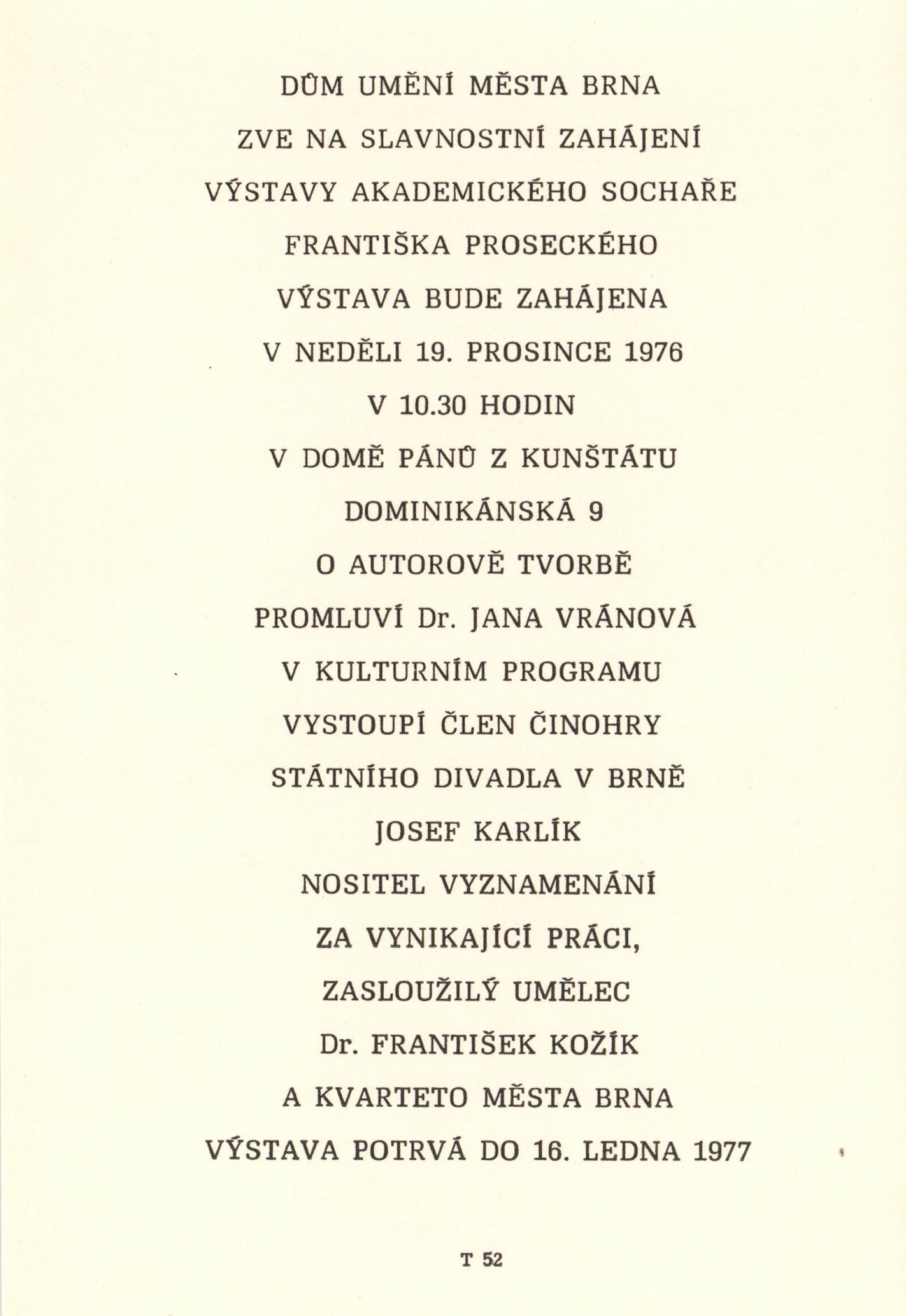 František Prosecký. Výběr z díla: Dům umění / Dům pánů z Kunštátu, 19. 12. 1976 – 16. 1. 1977 / Text: Anna Masaryková. – Praha: SČVU, 1976. – 16 s., obr., životní data, výstavy, studijní cesty, zastoupení ve sbírkách, soutěže, realizace, ceny, DPK 640. – MZK; MG; MMB