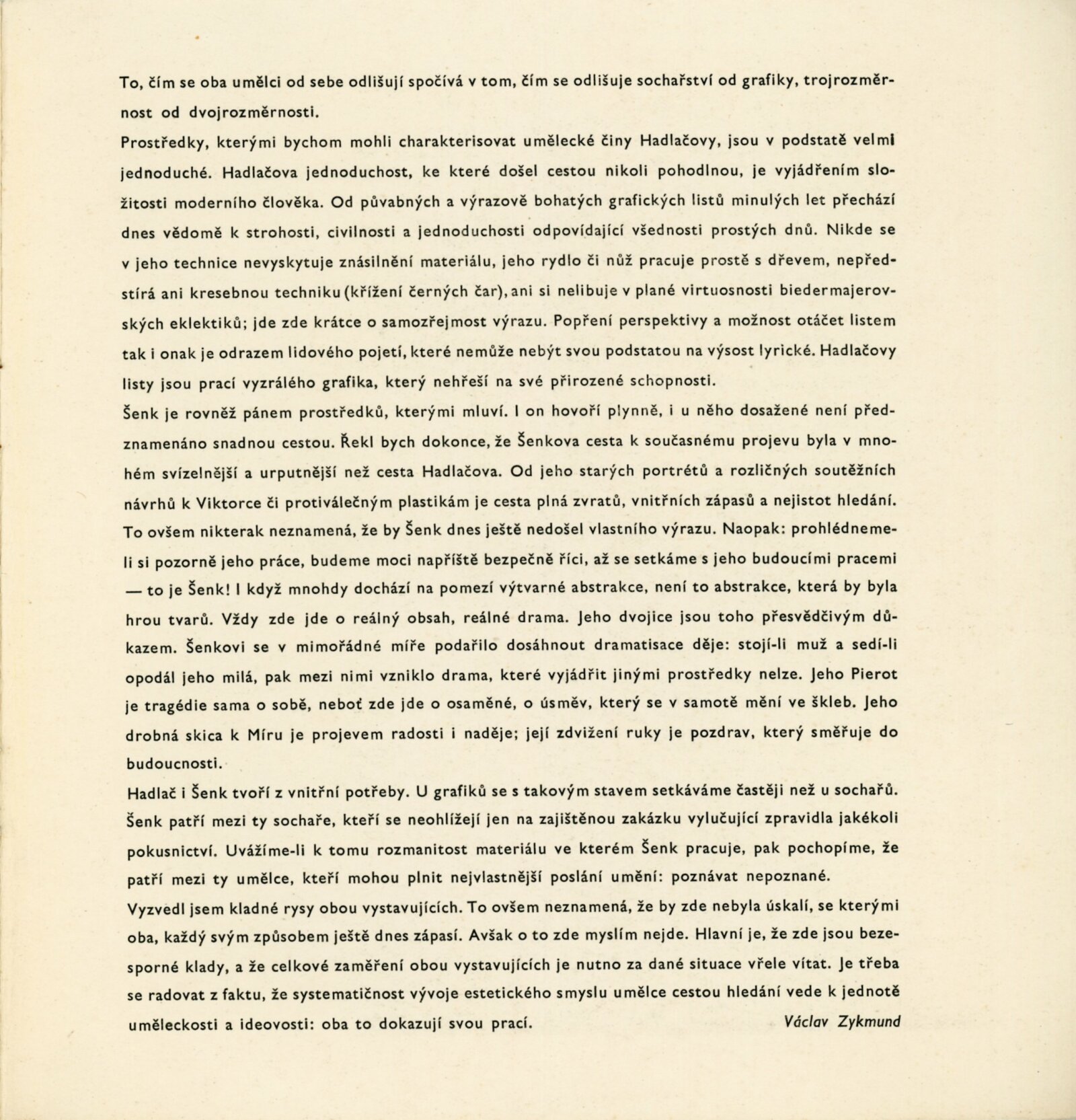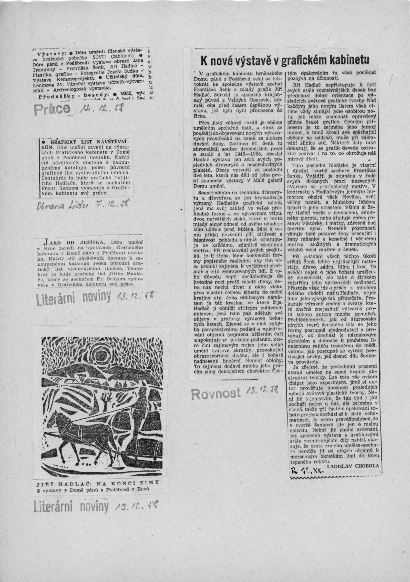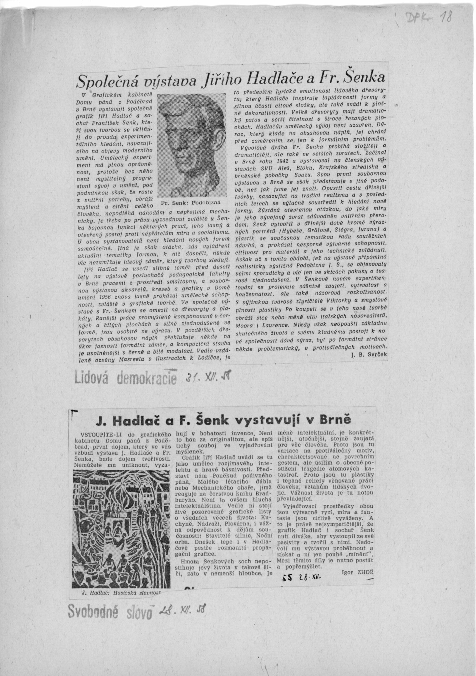 František Šenk. Jiří Hadlač. Plastiky, grafika: Dům umění v Brně / Dům pánů z Poděbrad, Grafický kabinet, 7. 12. 1958 – 4. 1. 1959 / Text: Václav Zykmund. – Brno: DUmB, 1958. – 12 s., obr., DPK 18. – MZK; MG