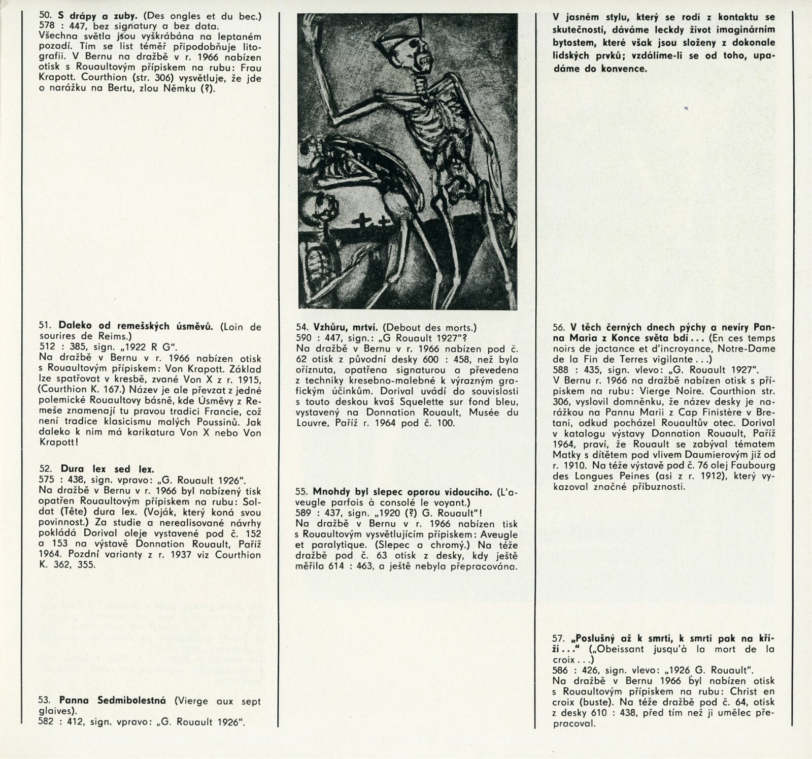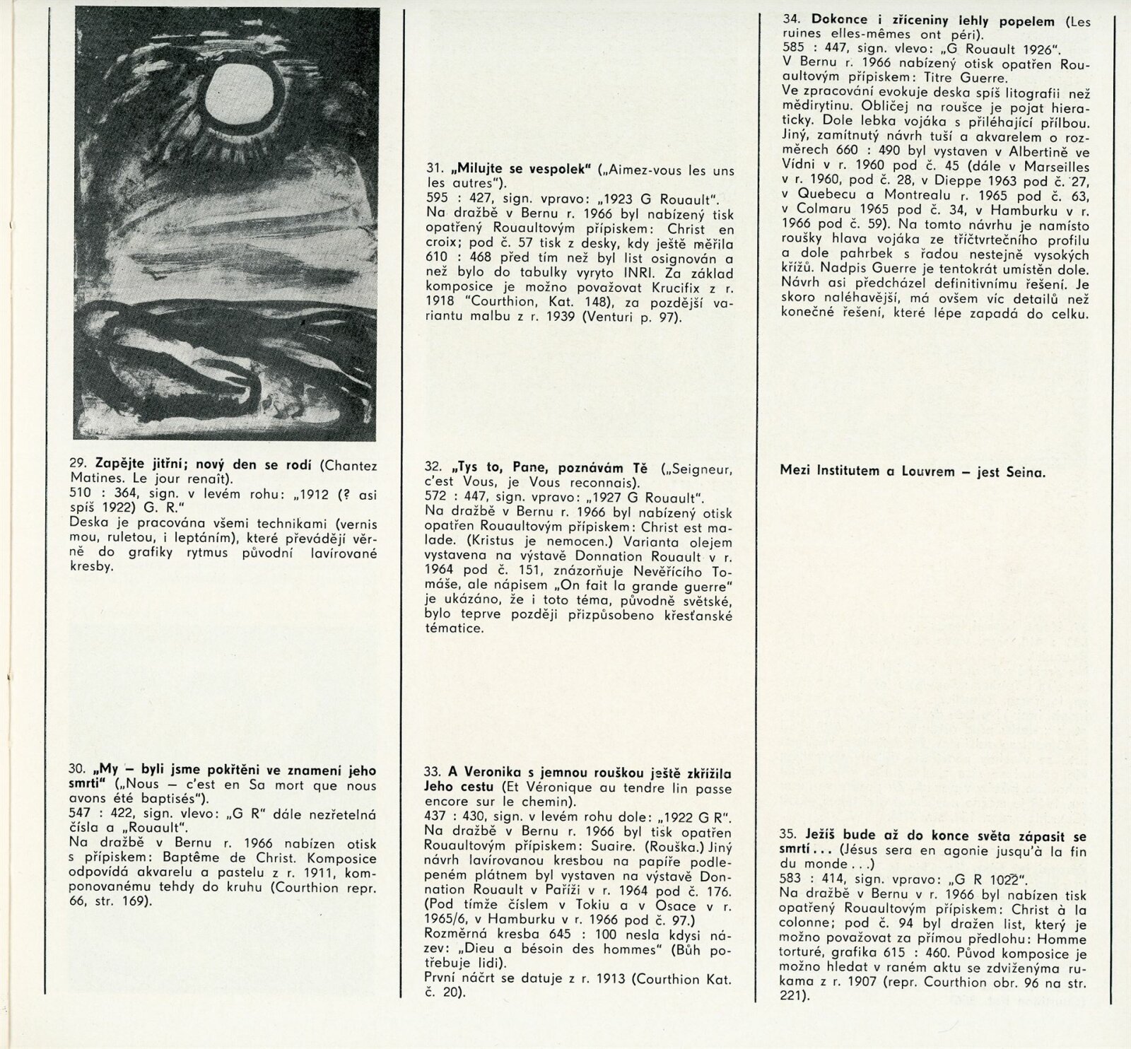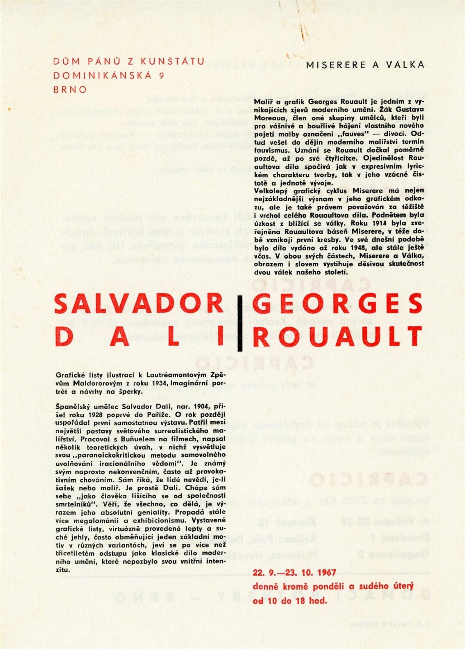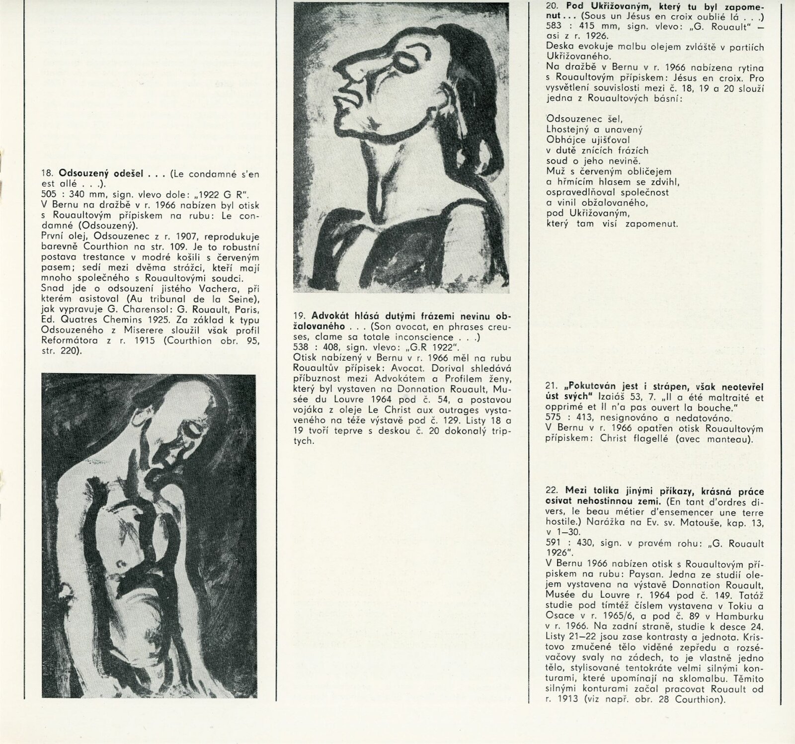 Georges Rouault. Miserere et la guerre 1917–1927: Dům umění města Brna / Dům pánů z Kunštátu, 1. patro, 22. 9. – 23. 10. 1967/ Převzatý katalog. Rouault. Miserere et la guerre 1917–1927: Galerie Vincence Kramáře, Praha, 2. 7. – 3. 9. 1967/ Text: Hana Volavková. – Praha: SČSVU, 1967. – 20 s., obr., portrét, životní data, odborný popis exponátů, DPK 353. – MG