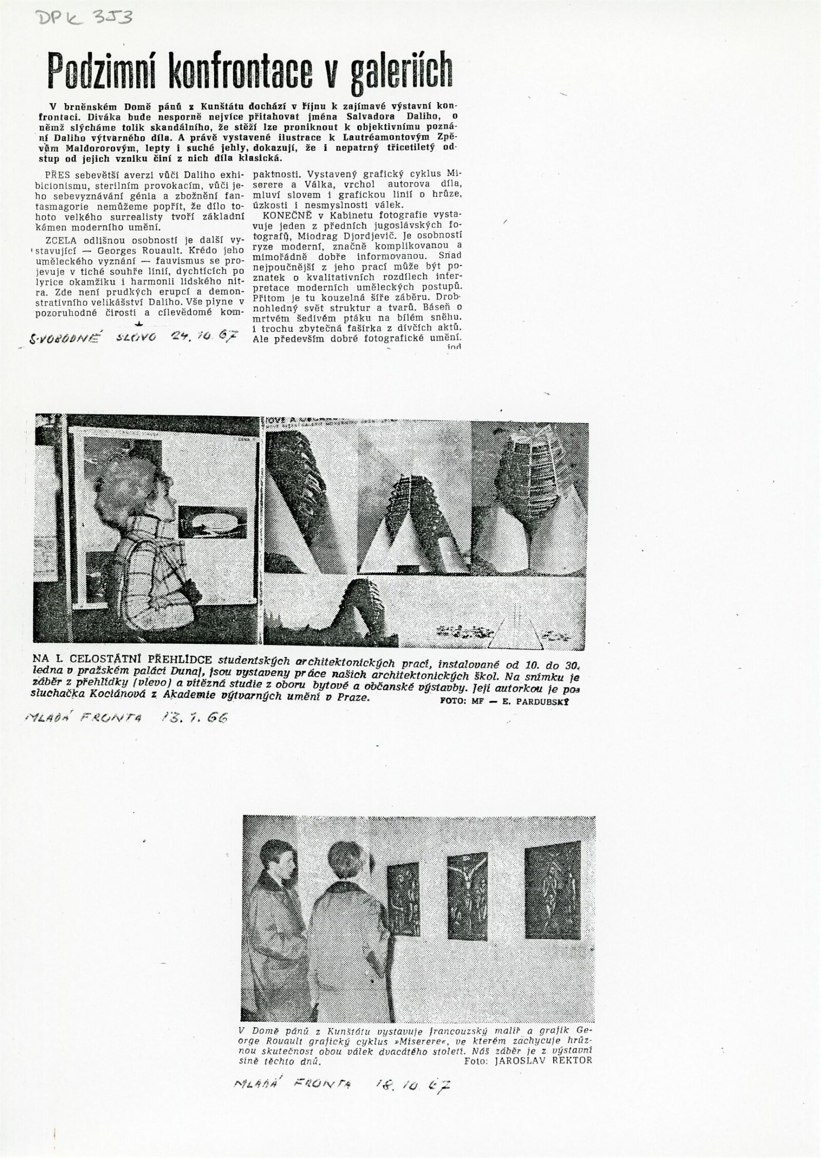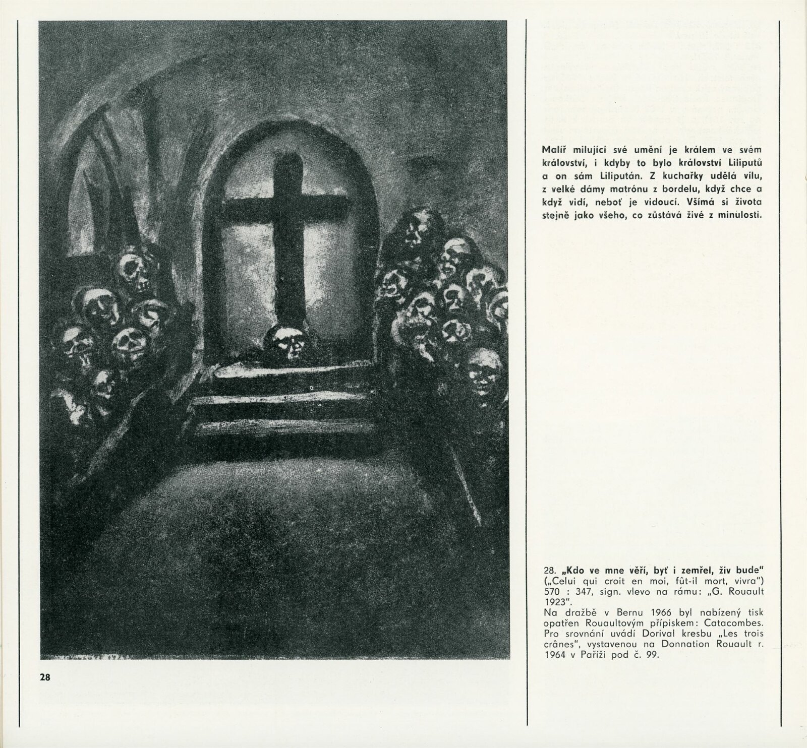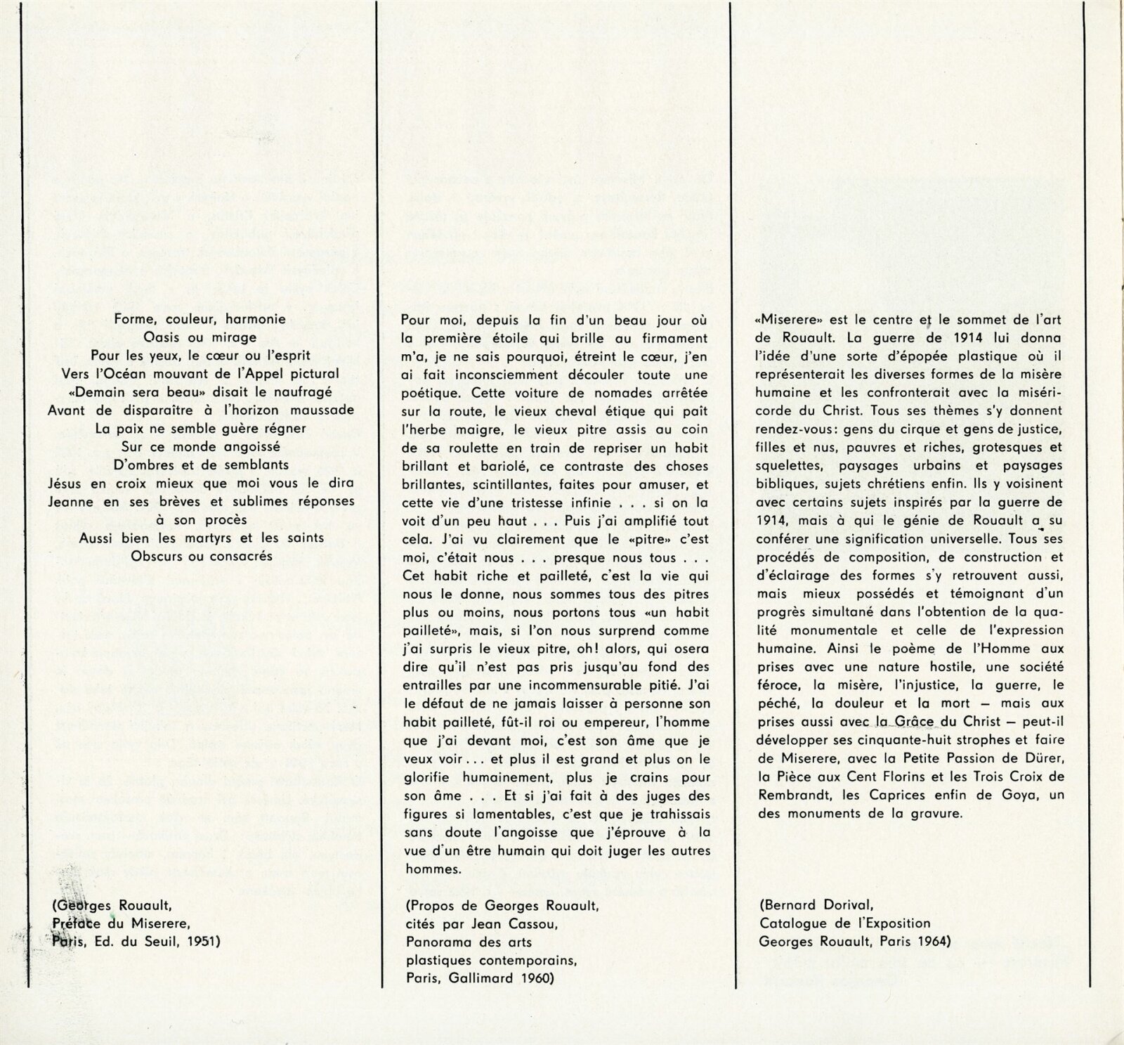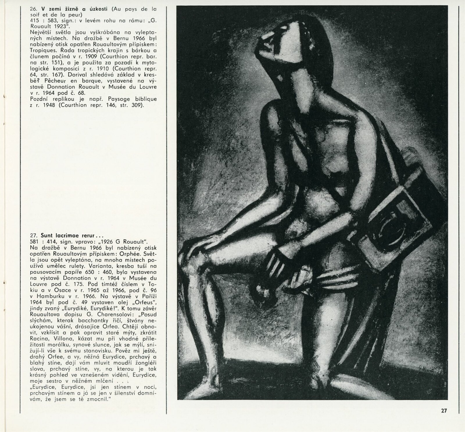 Georges Rouault. Miserere et la guerre 1917–1927: Dům umění města Brna / Dům pánů z Kunštátu, 1. patro, 22. 9. – 23. 10. 1967/ Převzatý katalog. Rouault. Miserere et la guerre 1917–1927: Galerie Vincence Kramáře, Praha, 2. 7. – 3. 9. 1967/ Text: Hana Volavková. – Praha: SČSVU, 1967. – 20 s., obr., portrét, životní data, odborný popis exponátů, DPK 353. – MG