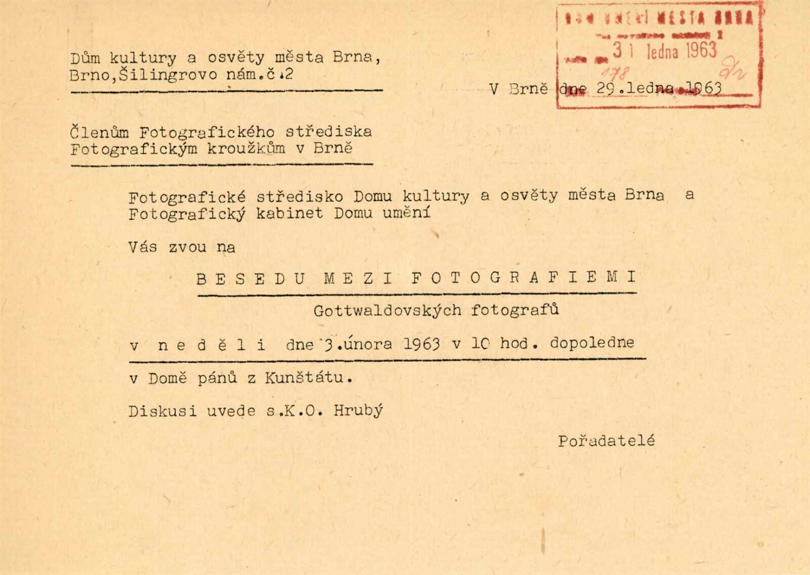 pozvánka, pozvání na besedu, provozní korespondence, recenze v tisku