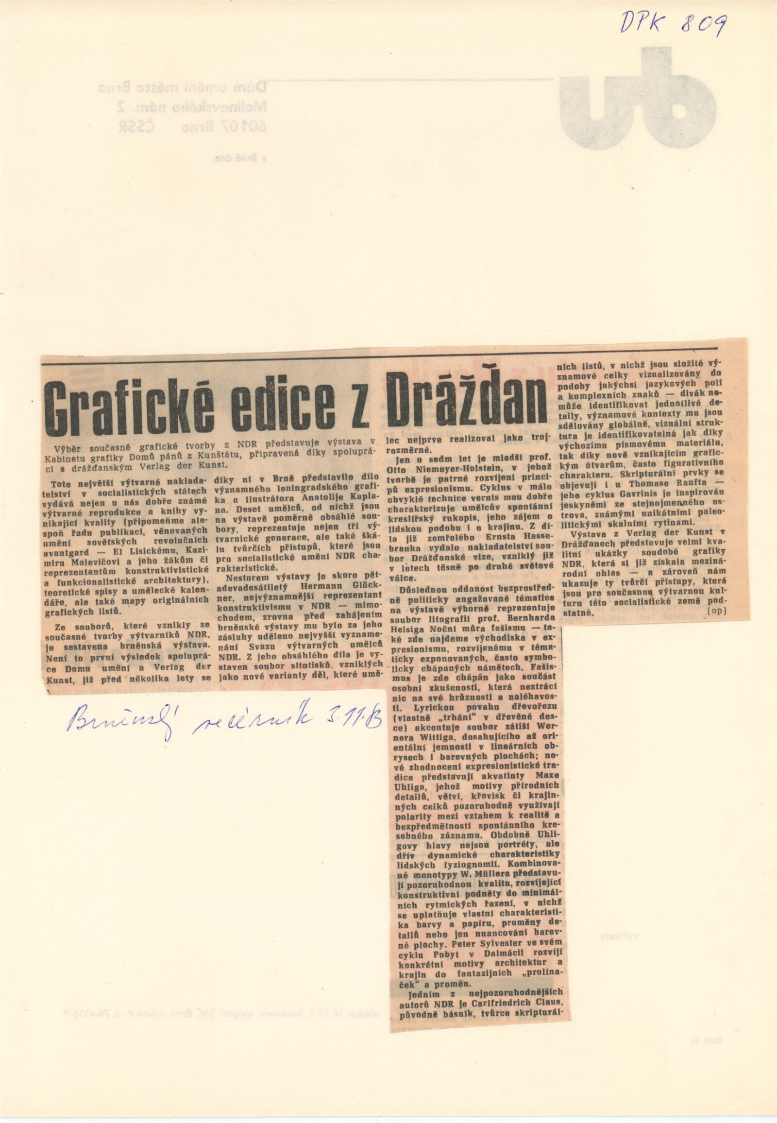 Grafické edice z Verlag der Kunst v Drážďanech. Grafika: Dům umění / Dům pánů z Kunštátu, Kabinet grafiky, 18. 10. – 20. 11. 1983 / Text: Karin Thomasová. – Brno: DUmB, 1983. – 8 s., obr., DPK 809. – MZK; MG