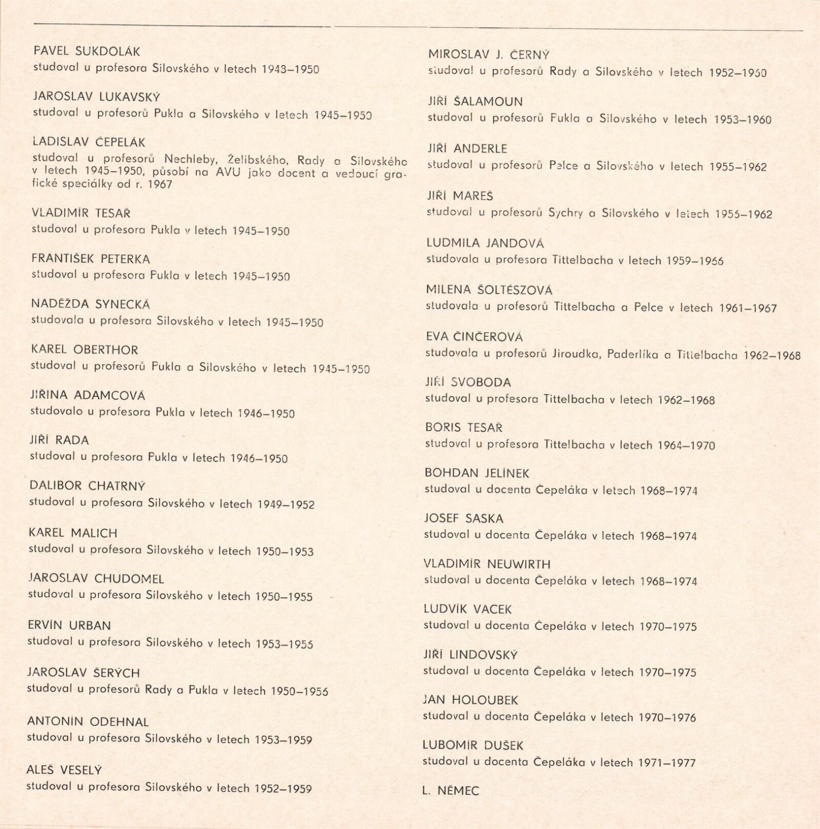 Jiřina Adamcová, Jiří Anderle, Jan Bauch, Cyril Bouda, Ladislav Čepelák, Miroslav Josef Černy, Eva Činčerová, Petr Dillinger, Lubomír Dušek, Václav Fiala, Richard Fremund, Jan Holoubek, Miloslav Holý, Otakar Hubšil, Dalibor Chatrný, Jaroslav Chudomel, Ludmila Jandová, Bohdan Jelínek, Ludmila Jiřincová, Milada Kazdová, Emil Kotrba, Rudolf Krajc, Jiří Lindovský, Jaroslav Lukavský, Karel Malich, Jiří Mareš, Eduard Milén, Alois Moravec, Karel Muller, Vladimír Neuwirth, Karel Oberthor, Antonín Odehnal, Raimund Ondráček, František Peterka, Viktor Polášek, Vladimir Pukl, Václav Rabas, Jiří Rada, Jan Rambousek, Josef Saska, Vojtěch Sedláček, Vladimír Silovský, Mario Stretti, Pavel Sukdolák, Jiří Svoboda, Vladimír Sychra, Naděžda Synecká, Jiří Šalamoun, Jaroslav Šerých, Milena Šoltészová, Karel Štěch, František Štěpán, Karel Štika, Boris Tesař, Vladimir Tesař, Vojtěch Tittelbach, Karel Tondl, Ervín Urban, Ludvík Vacek, Aleš Veselý
