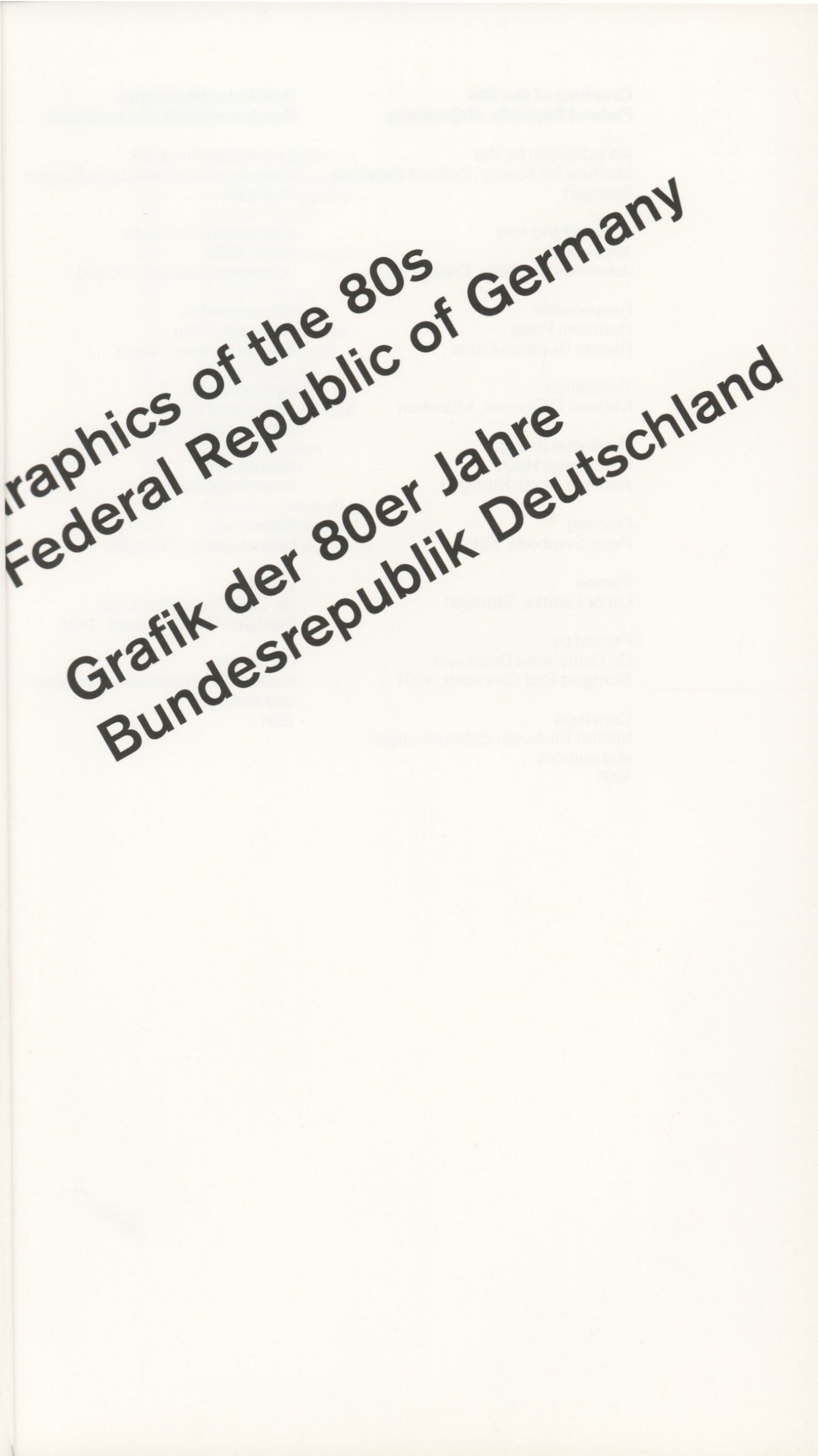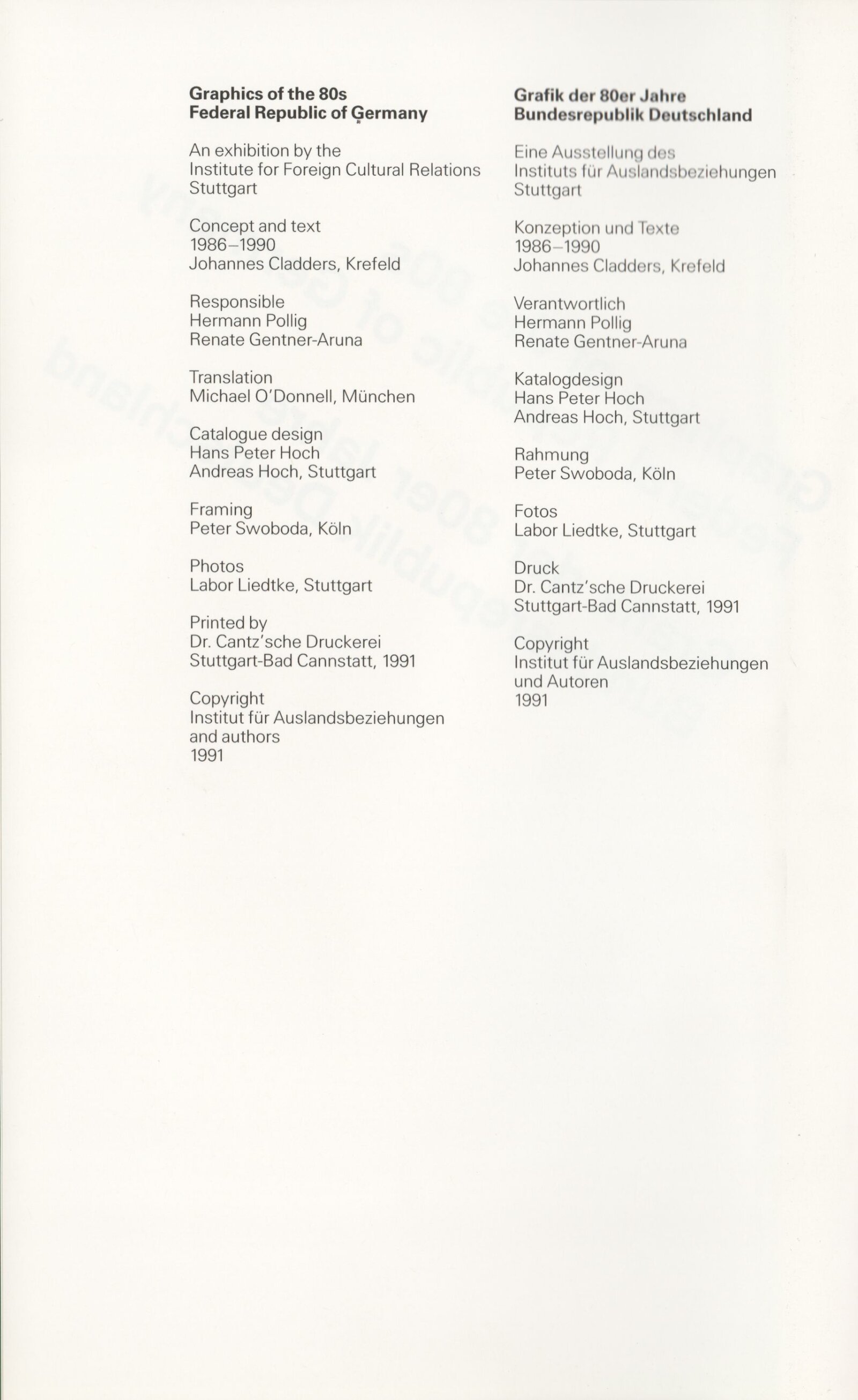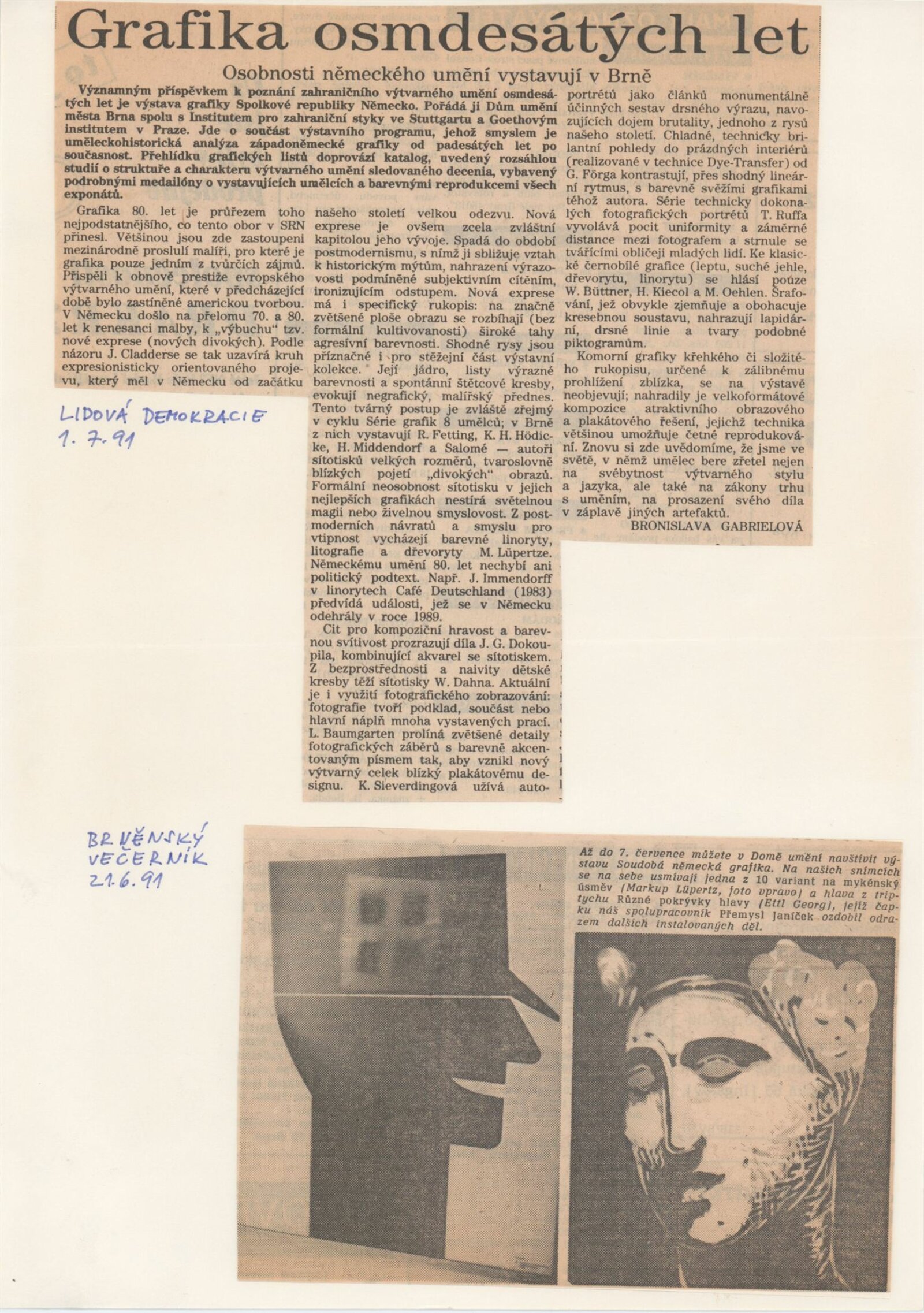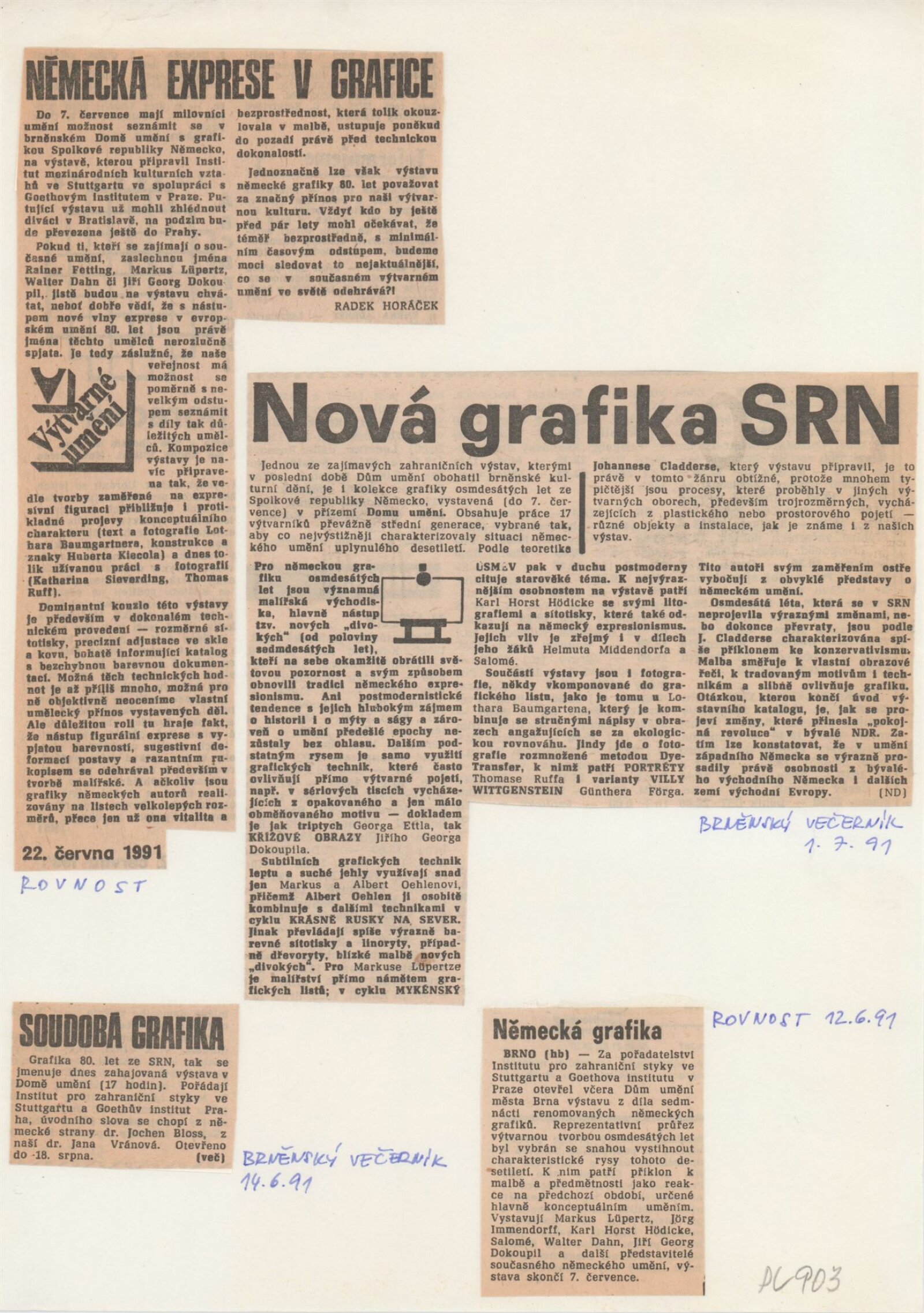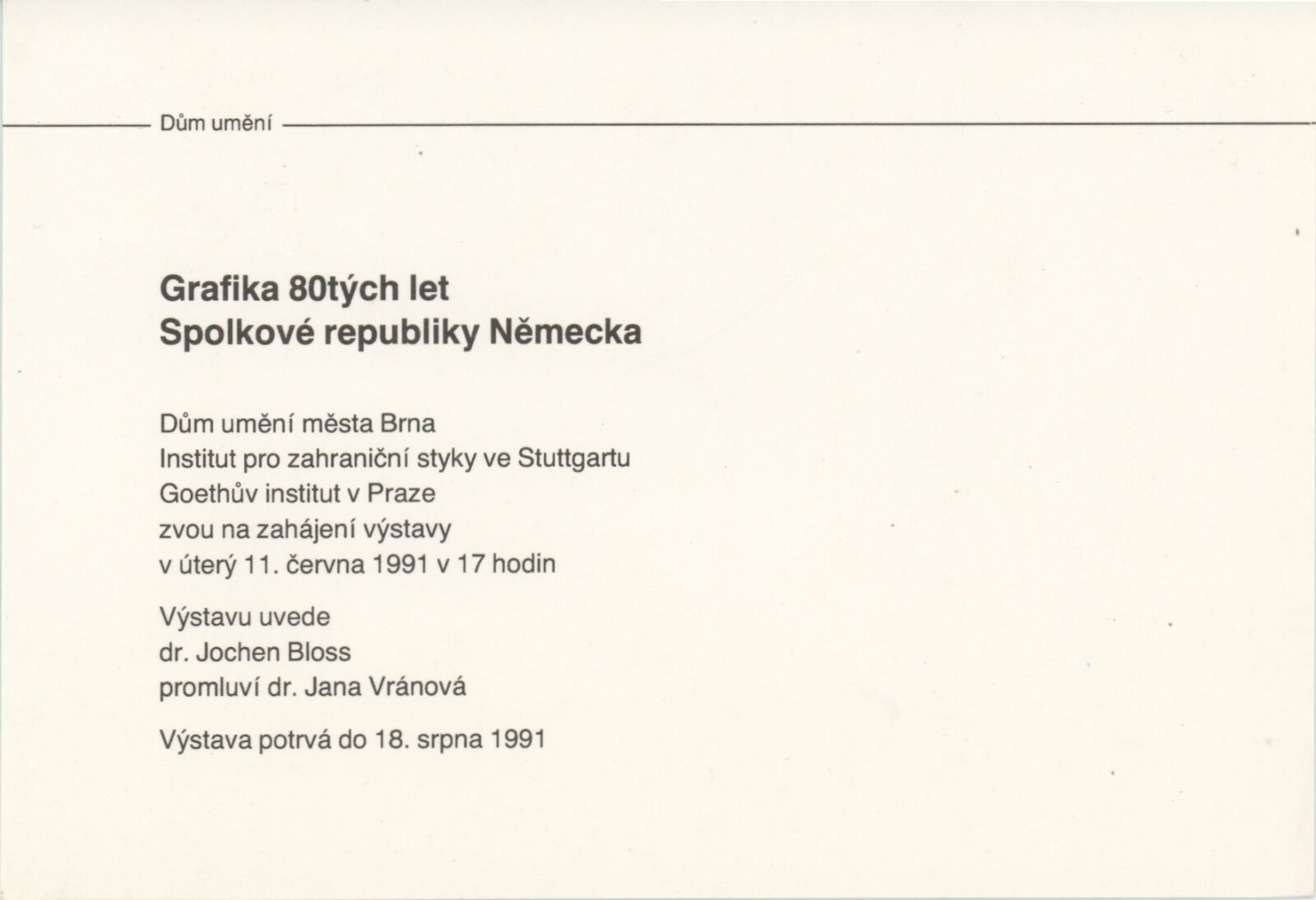Grafika 80. let Spolkové republiky Německa: Dům umění města Brna, Galerie Jaroslava Krále, hala, 11. 6. – 18. 8. 1991 / Převzatý katalog. Graphics of the 80s Federal Republic of Germany / Text: Johannes Cladders. – Stuttgart: Institut für Auslandsbeziehungen. – 146 s., obr., životní data vystavujících, výstavy, bibliografie, název a text též německy, DU 903