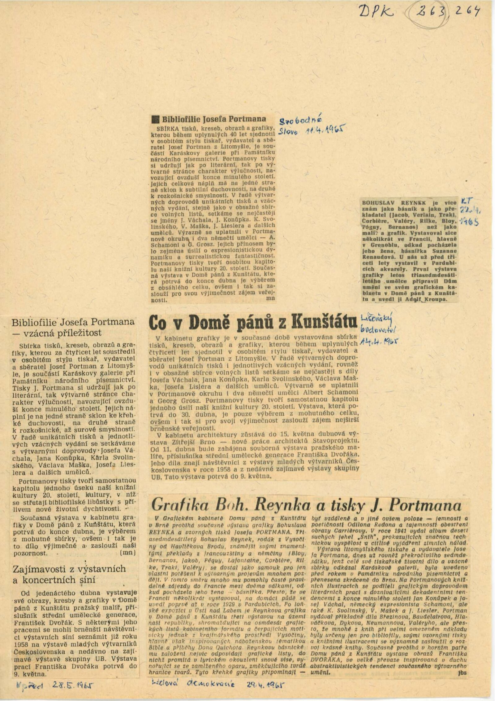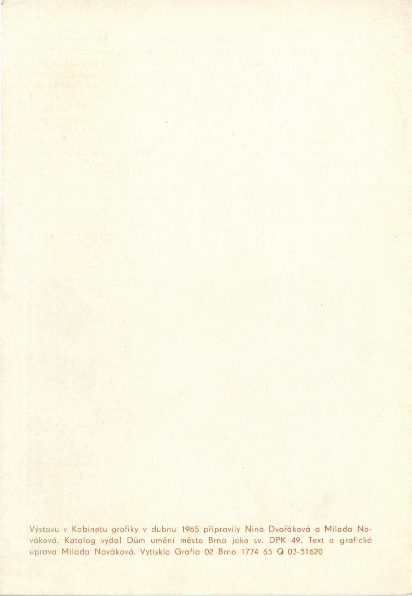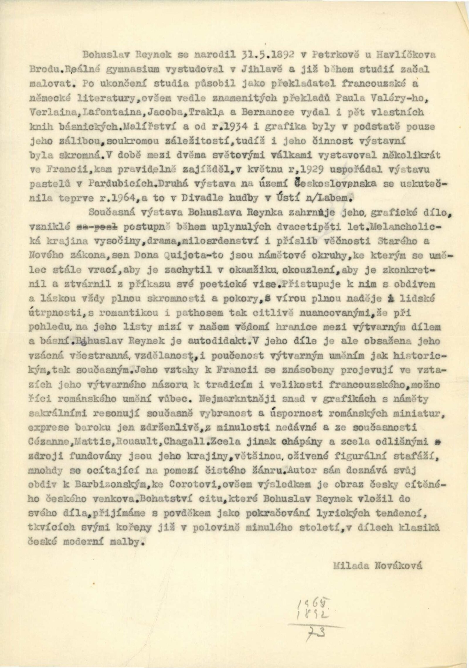 Grafika Bohuslava Reynka: Dům umění města Brna / Dům pánů z Kunštátu, 65. výstava Kabinetu grafiky, 2. 4. – 2. 5. 1965 / Text: Milada Nováková. – Brno: DUmB, 1965. – 4 s., obr., seznam vystavených prací 1 s., DPK 264. – MZK; MG; MMB
