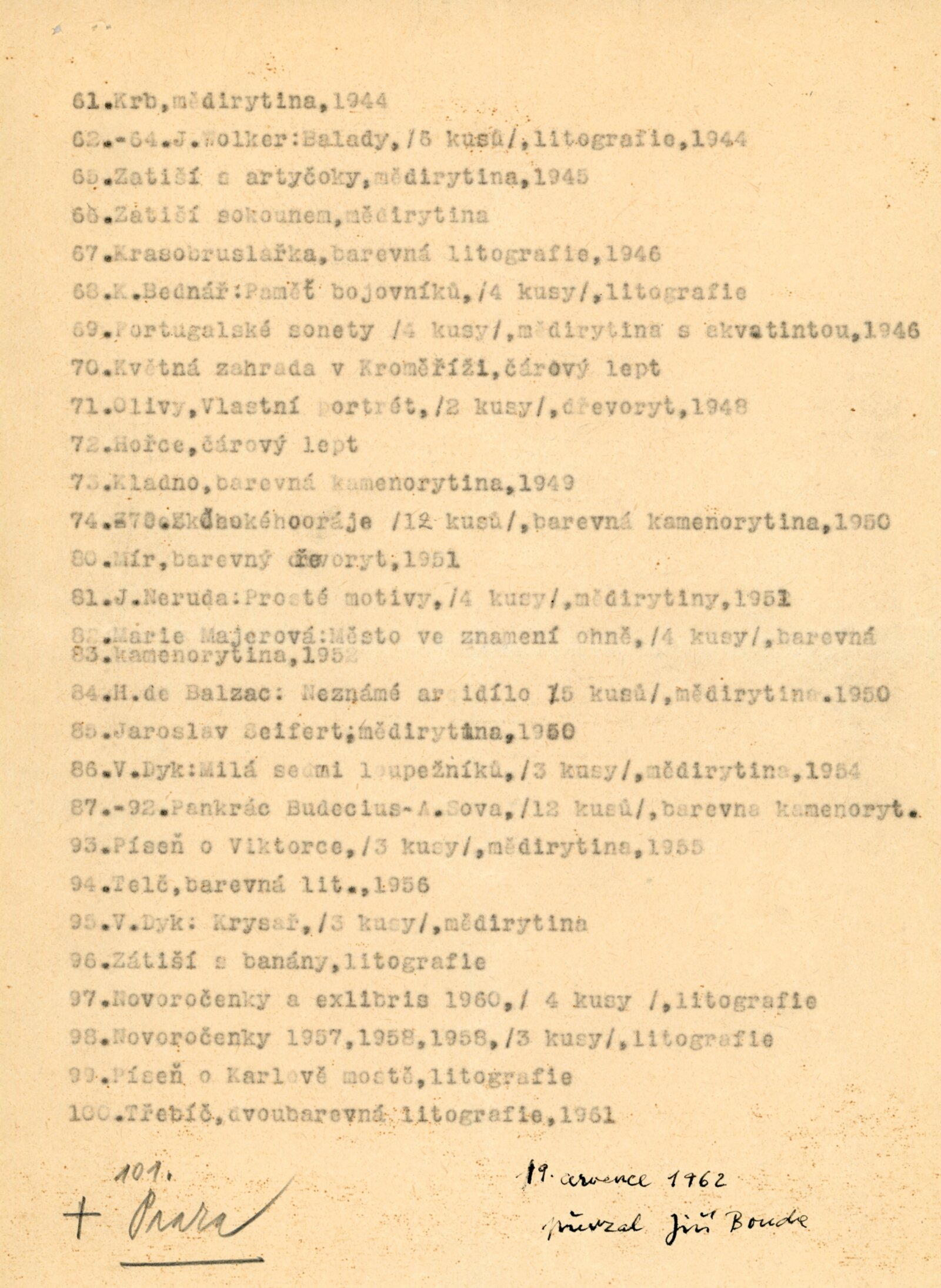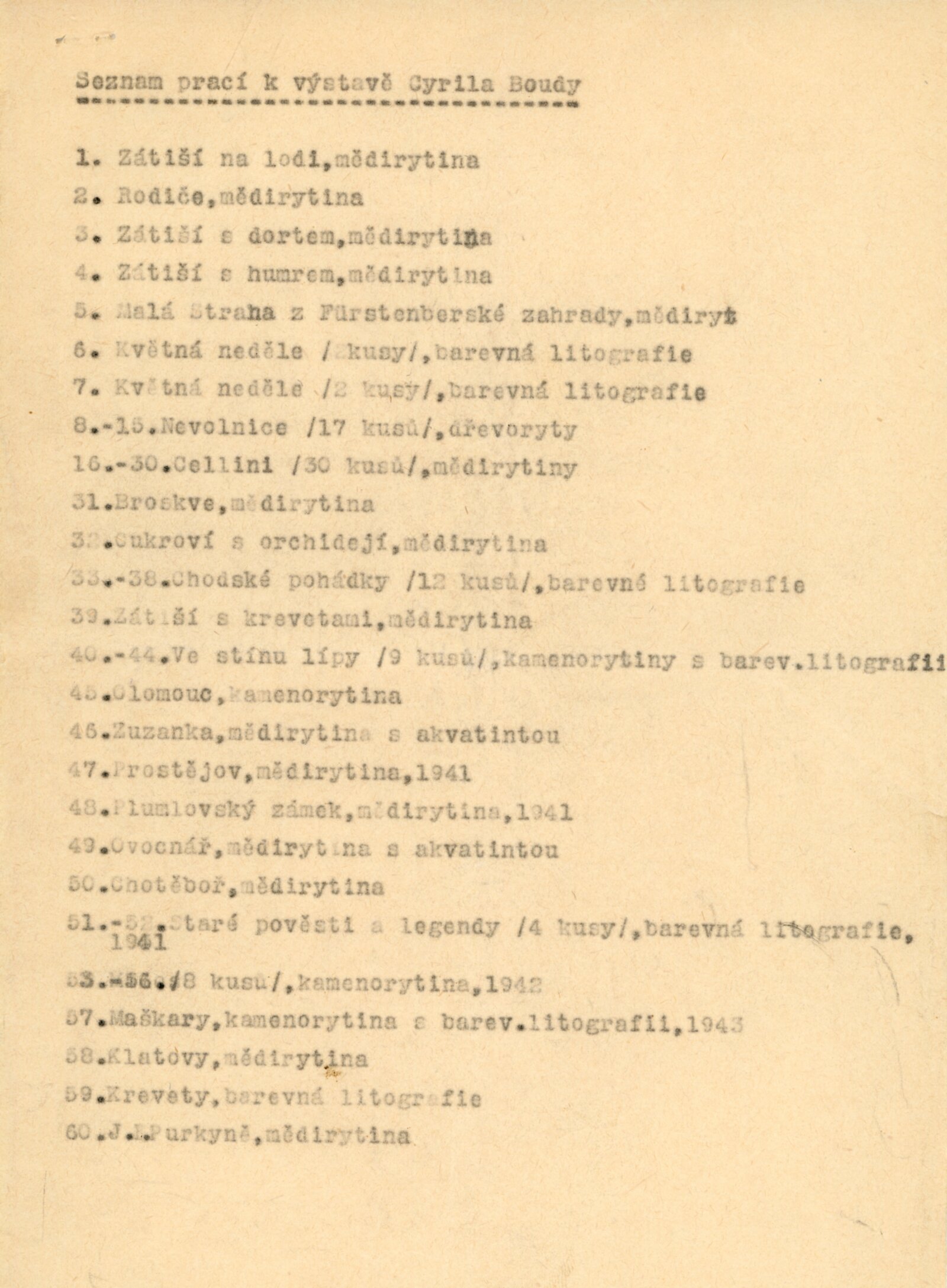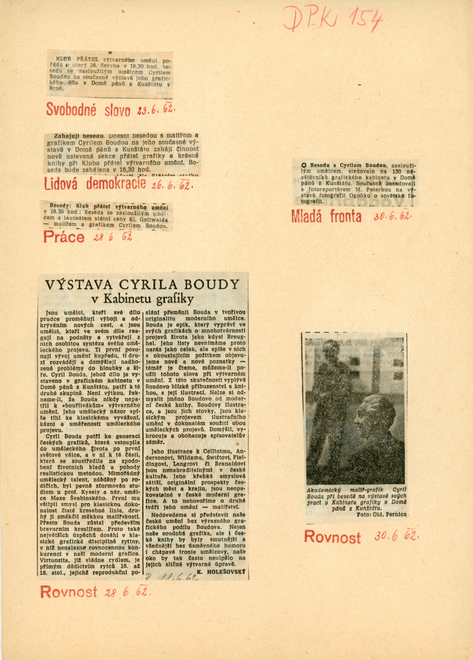 společná pozvánka DPK 155 a 156, karta k výstavě, seznam vystavených prací, korespondence (termín výstavy, zaslání jednotlivých rytin, s Cyrilem Boudou, pozvání k prohlídce veduty), pozvánka na besedu s Cyrilem Boudou „nad vedutou Brna“ (27. 4. 1963 v DU s Františkem Kalivodou)