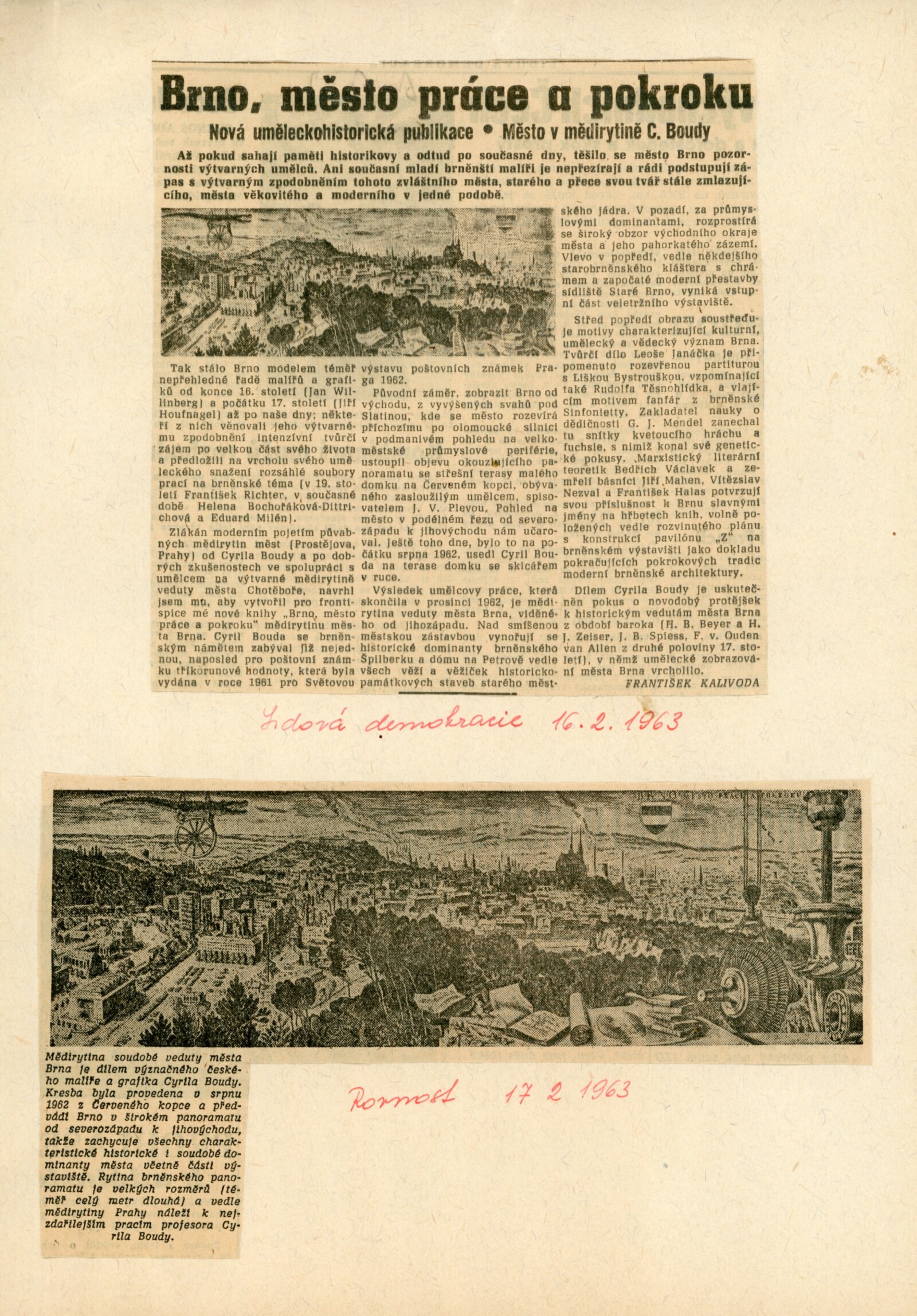 Složka obsahuje informace o mědirytině Brna od Cyrila Boudy pro publikaci Františka Kalivody (pozvánka na besedu, recenze v tisku).