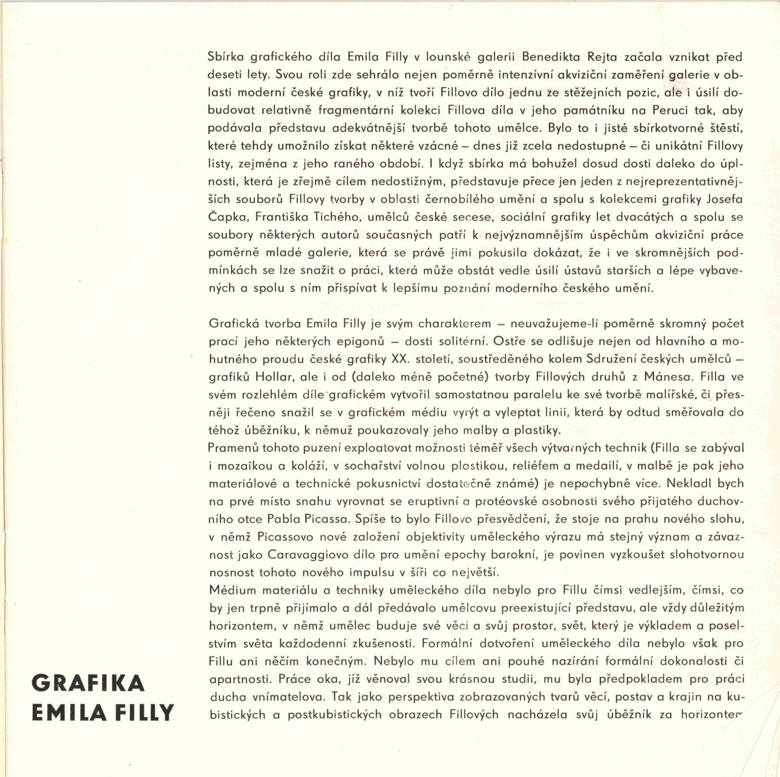 Grafika Emila Filly: Dům umění / Dům pánů z Kunštátu, 155. výstava Kabinetu grafiky, 13. 2. – 14. 3. 1976 / Text: Jan Sekera. – Brno: DUmB, 1976. – 20 s., obr., DPK 620. – MMB
