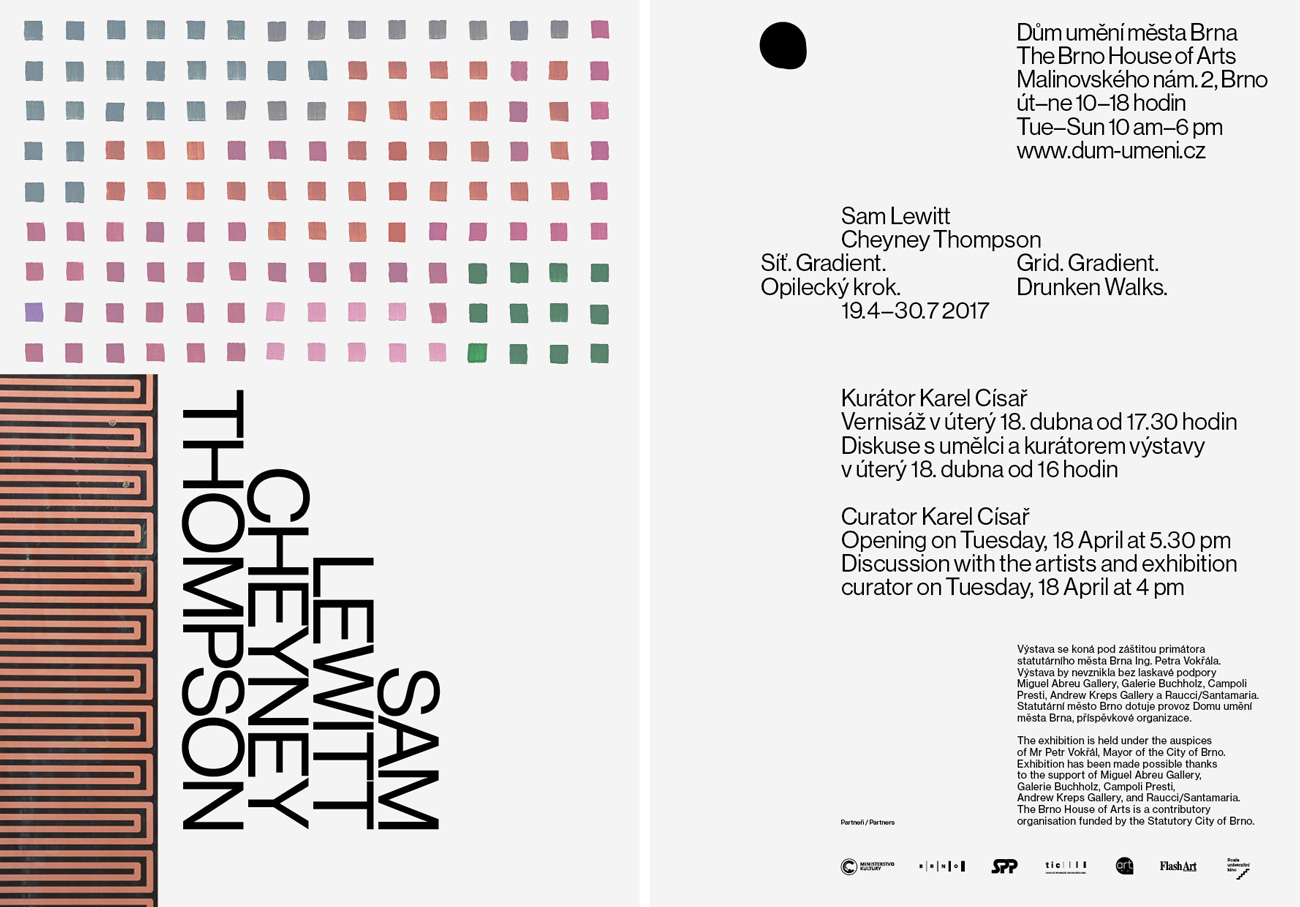 The first solo exhibition of American artists Sam Lewitt and Cheyney Thompson in Central and Eastern Europe proceeds from the spatial and institutional fabric of the Brno House of Arts – on the one hand it rekindles the interest in abstract and system-oriented tendencies, on the other it takes full advantage of the symmetrical plan of the exhibition floor in the House of Arts. For this exhibition in the Brno House of Arts the artists created new artefacts or made specific adaptations of existing installations.