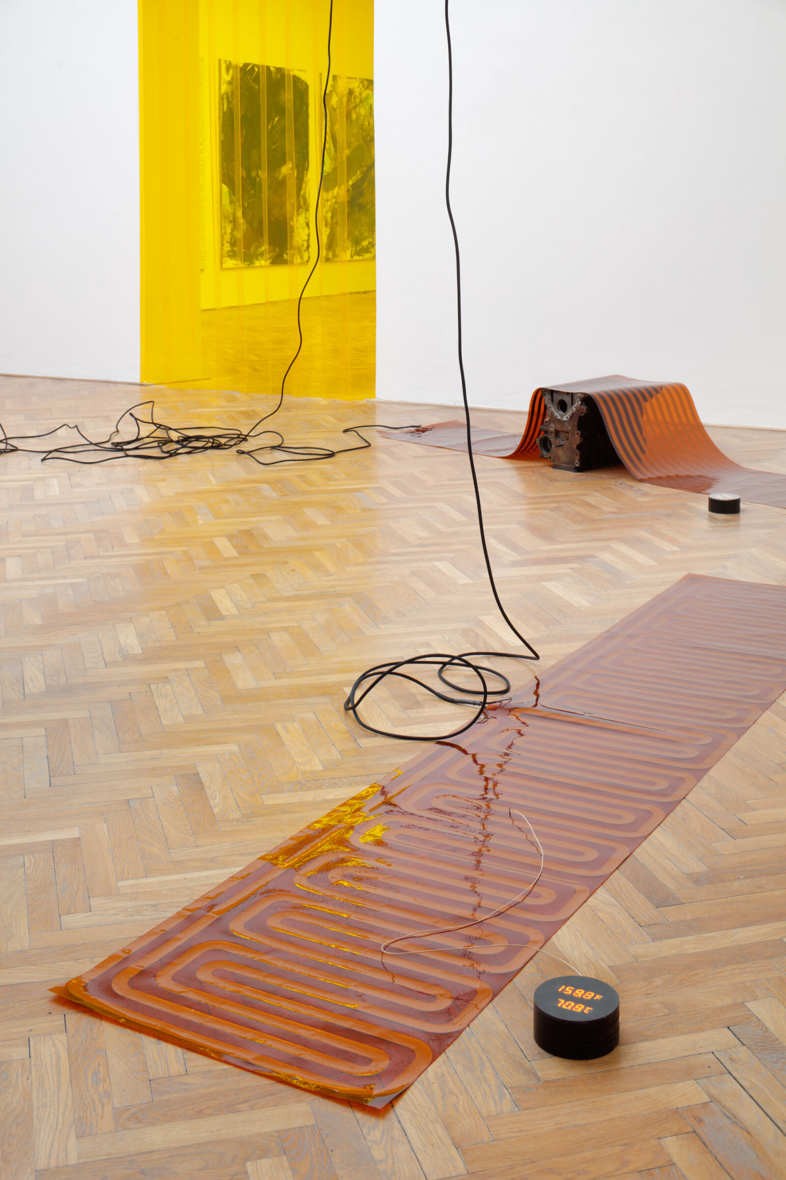 Sam Lewitt (who is taking part in the 57th Venice Biennial) first displayed his work More Heat Than Light (2015), at the CCA Wattis Institute for Contemporary Art in San Francisco, and then at Kunsthalle Basel. He connected customized ultra-thin heating circuits to the wiring system of the gallery; they represent enlargements of similar technologies used for temperature regulation in portable computers, and they “convert” the energy intended for lighting into heat. Since then, Lewitt has displayed the installation in different contexts, including a New York apartment rented through the web accommodation service Airbnb. In the Brno version of the installation the heating circuits are powered with half of the energy available for the House of Arts central hall. The rest of energy being used in the standard way for lighting a horizontal painting by Cheyney Thompson, in order to underline the common character of the exhibition. The second half of the heating circuits are located in the last room of the exhibition, where they consume all the energy and the space therefore is only lit by natural light.