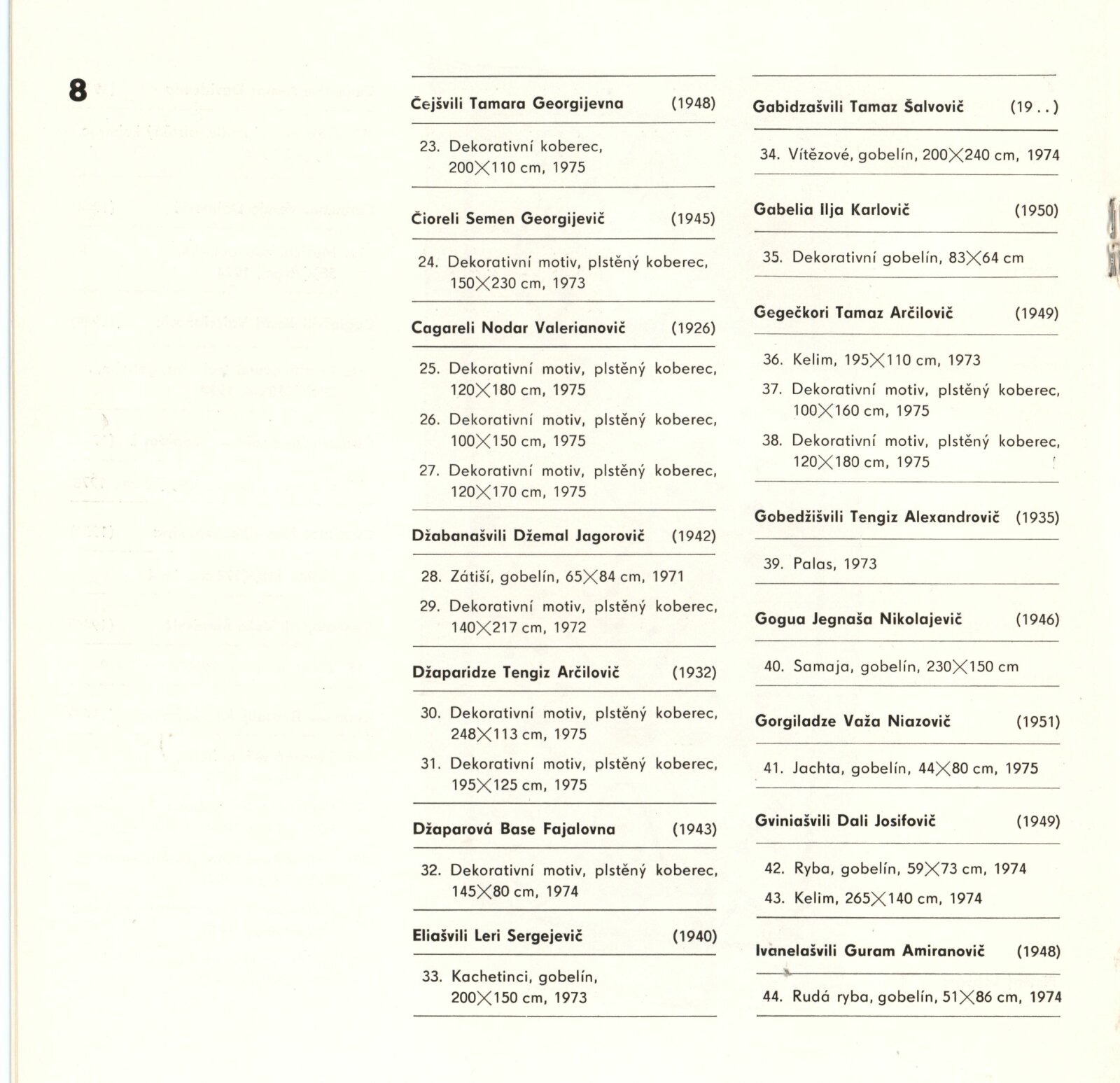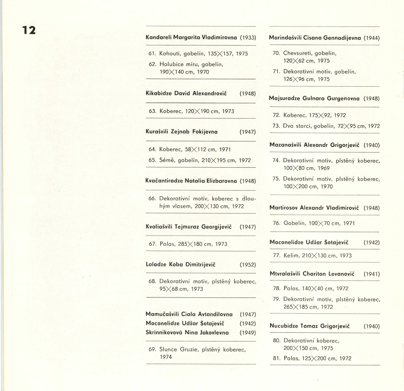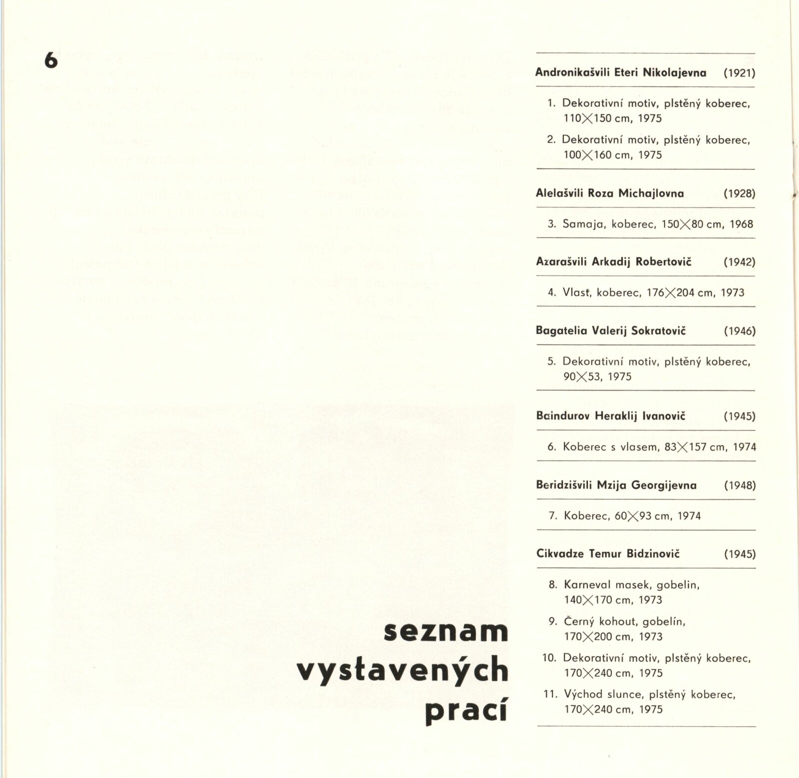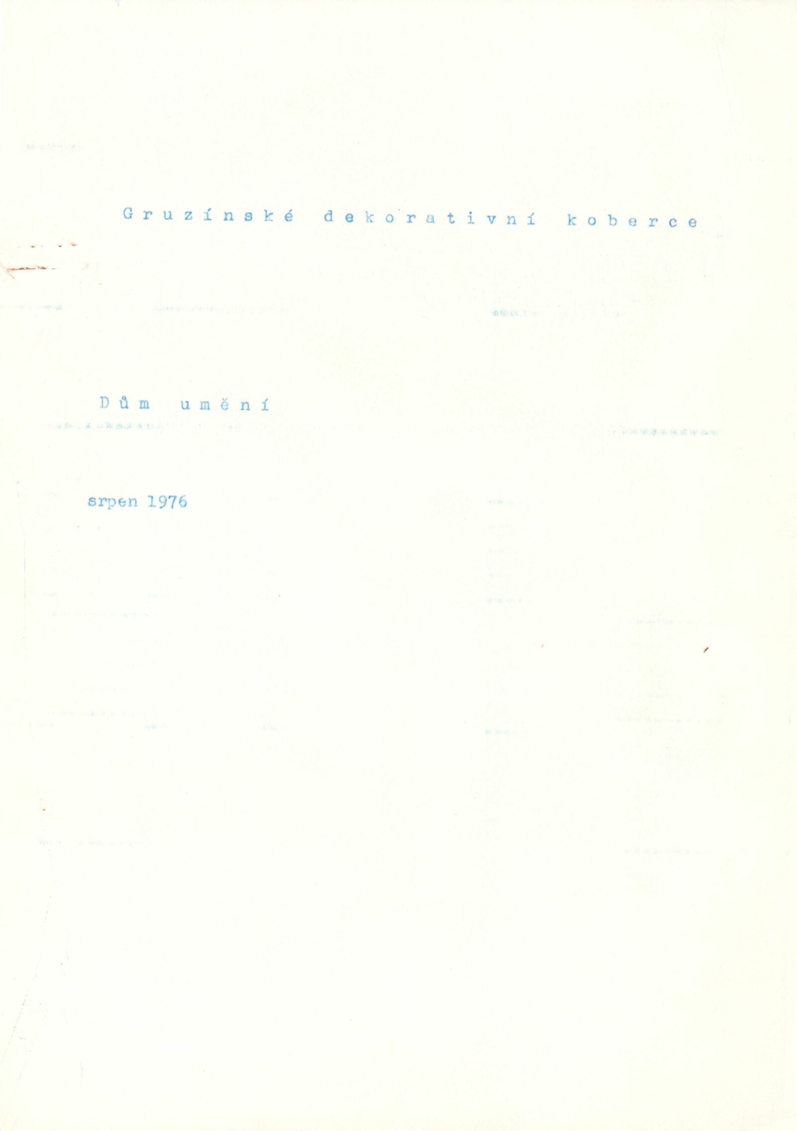 Gruzínské dekorativní koberce: Dům umění města Brna, 30. 7. – 29. 8. 1976 / Text: Tbiliská akademie výtvarných umění. – Brno: DUmB, 1976. – 16 s., obr., DU 643. – MZK; MG