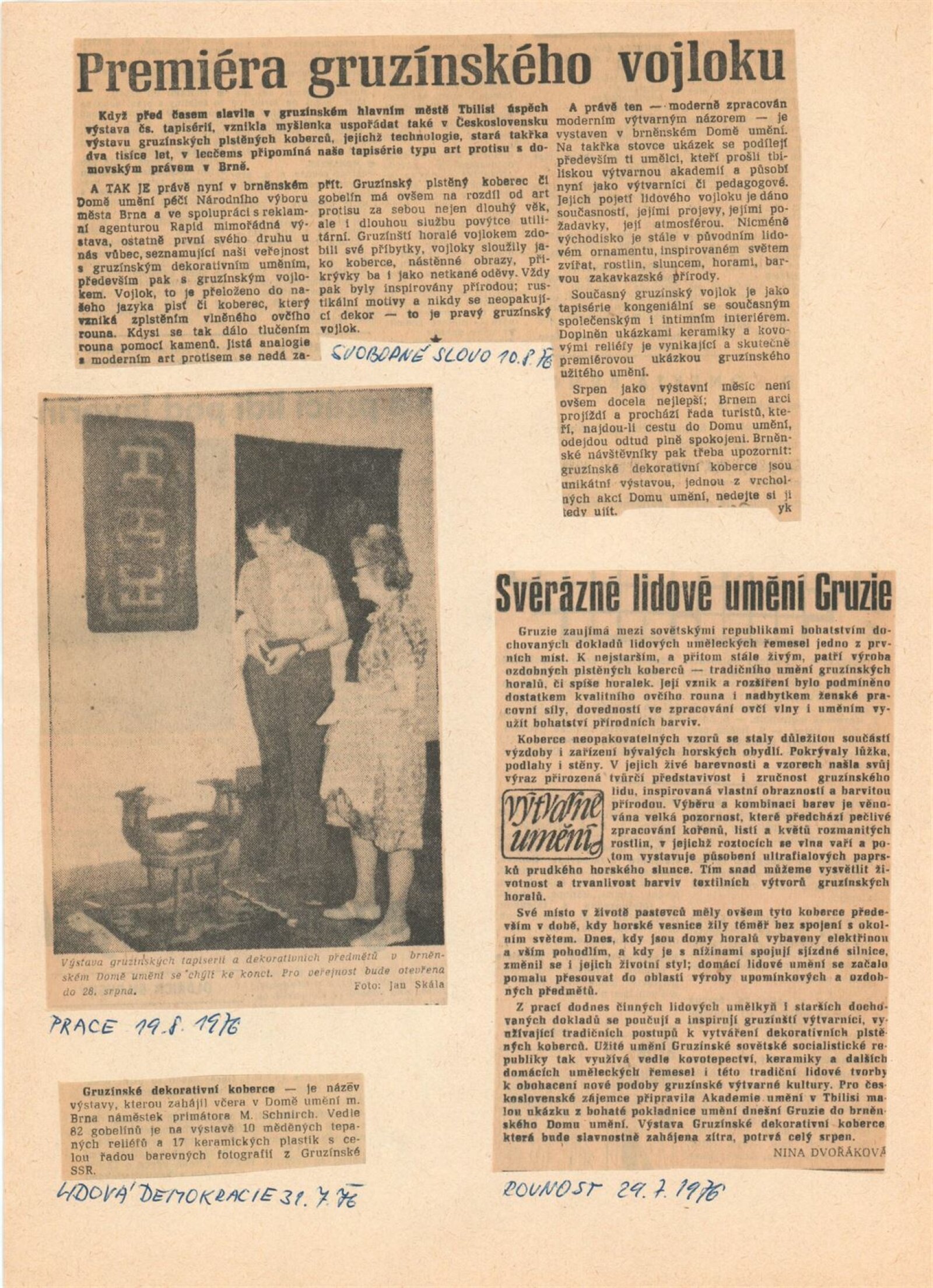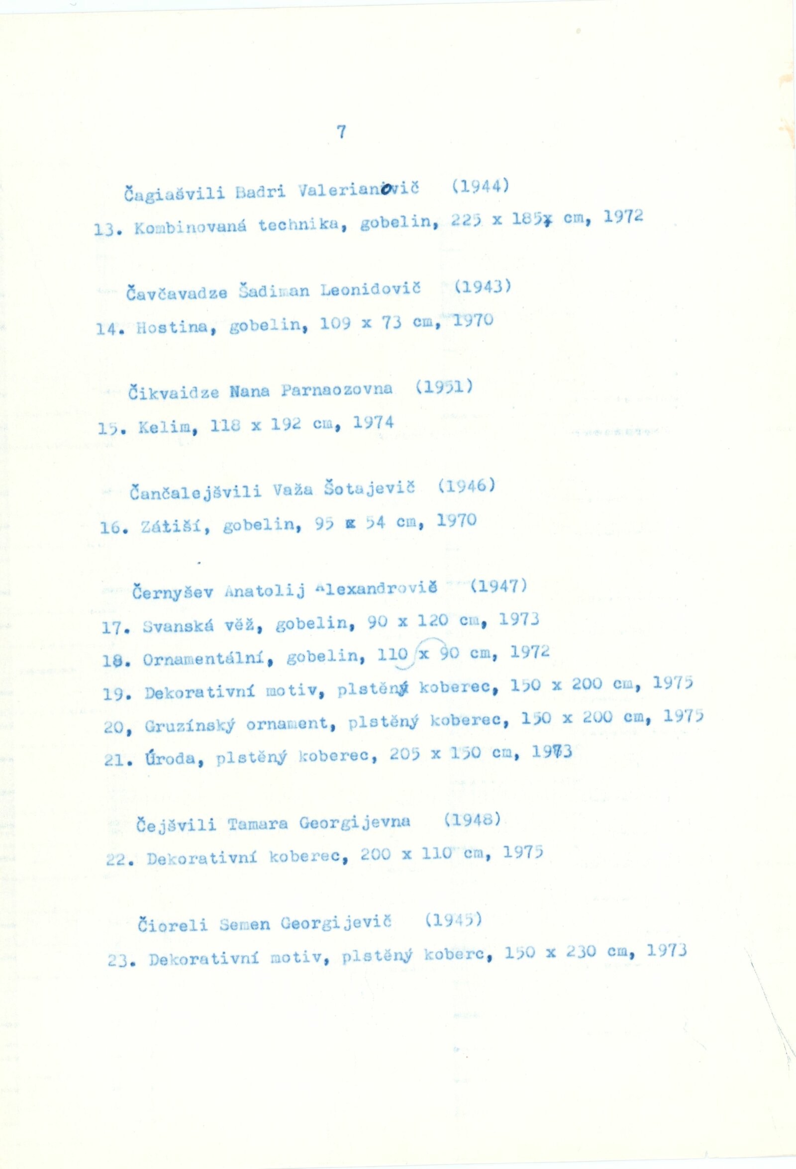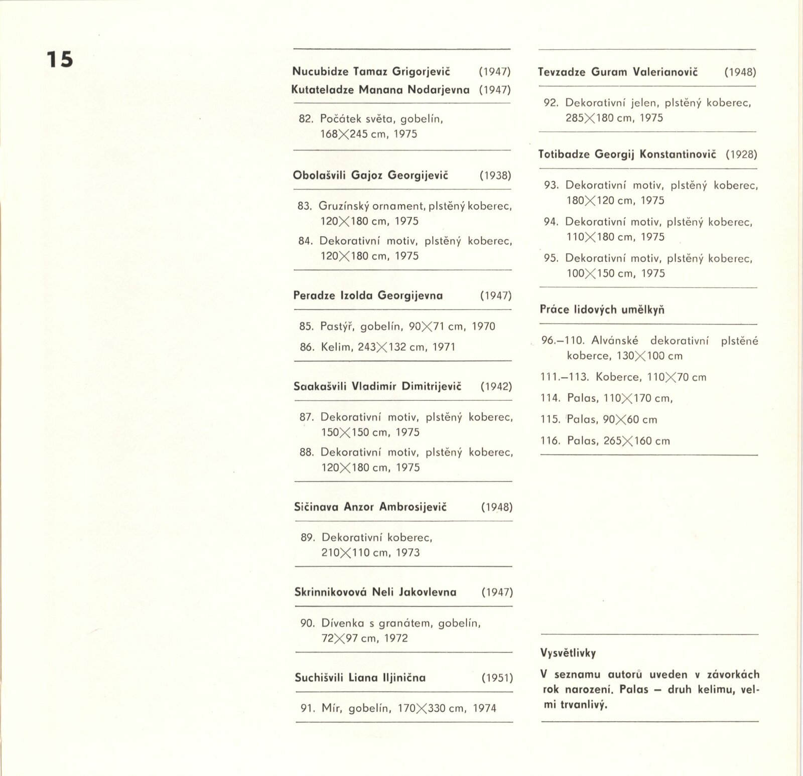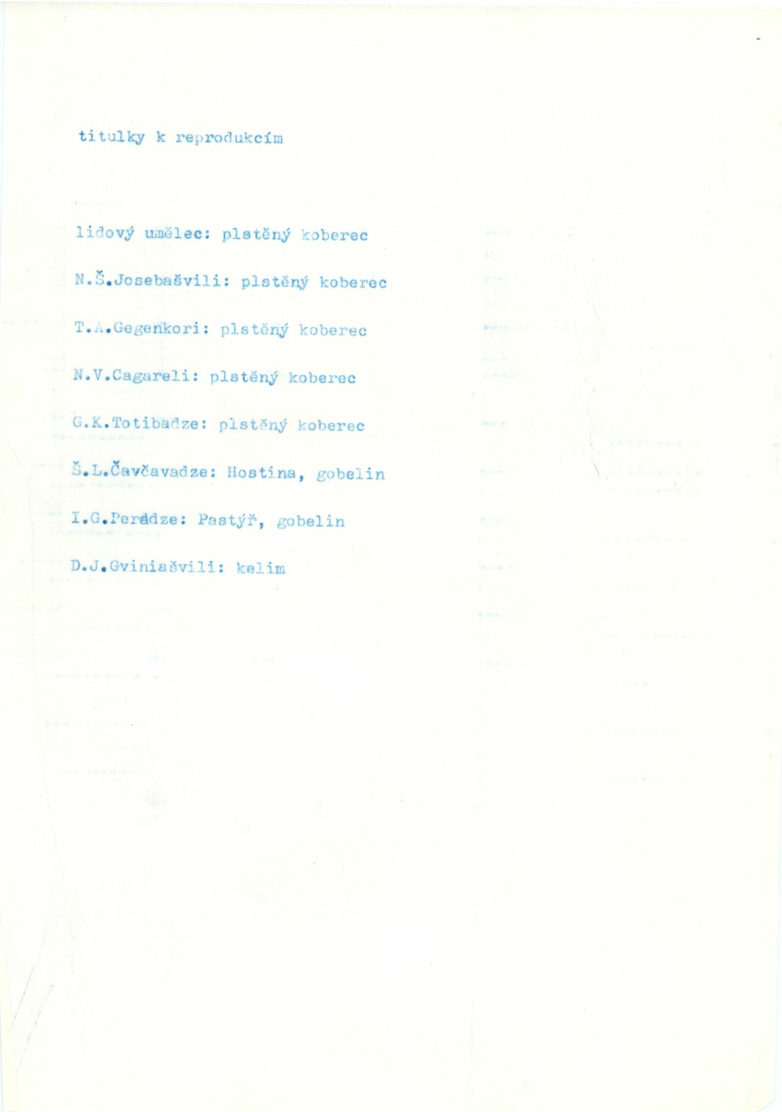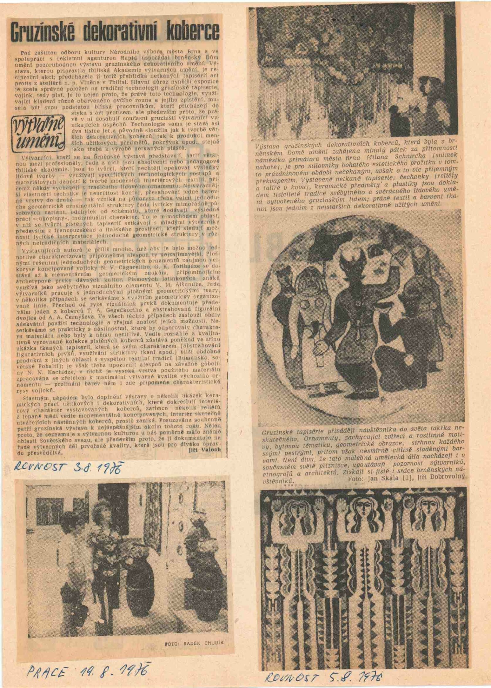 Gruzínské dekorativní koberce: Dům umění města Brna, 30. 7. – 29. 8. 1976 / Text: Tbiliská akademie výtvarných umění. – Brno: DUmB, 1976. – 16 s., obr., DU 643. – MZK; MG