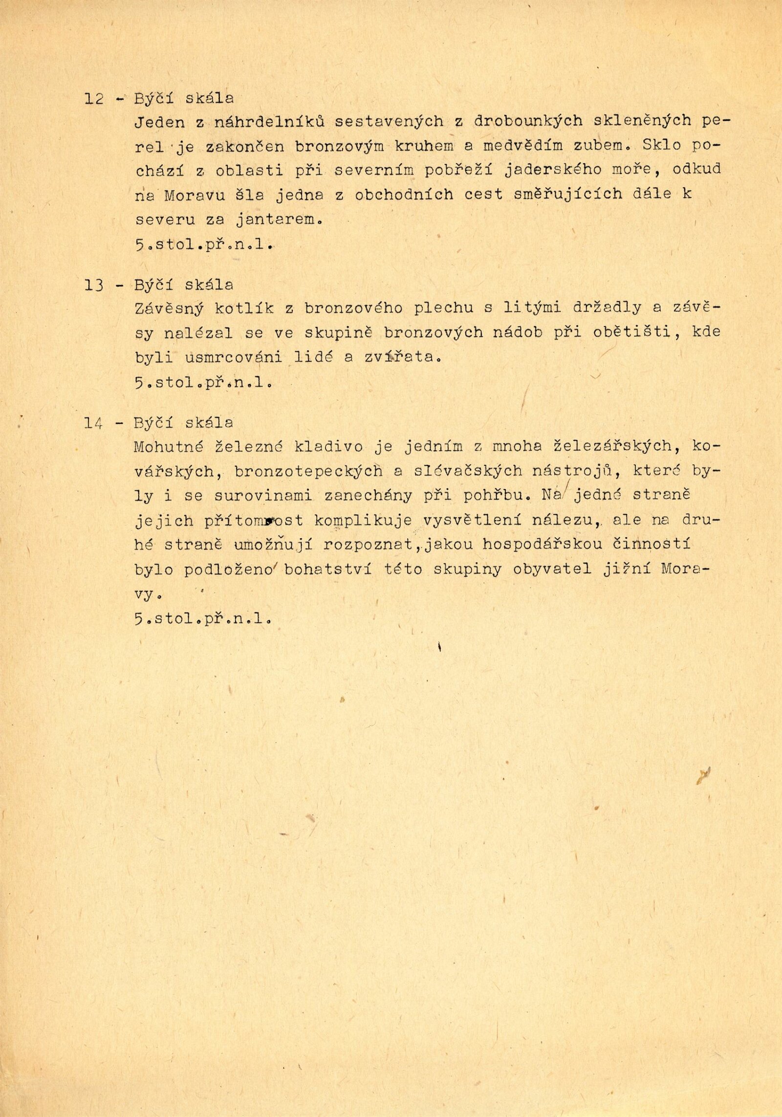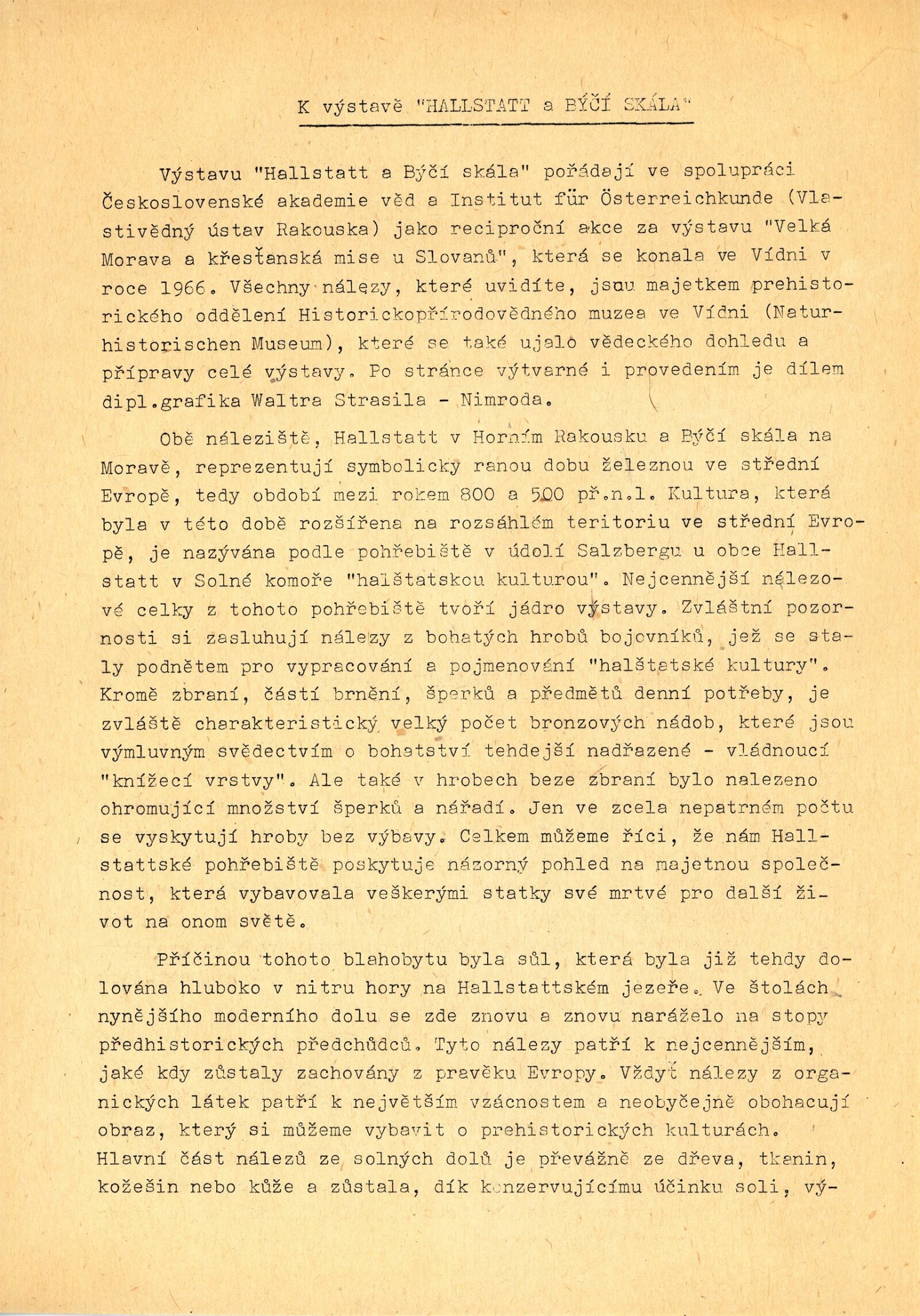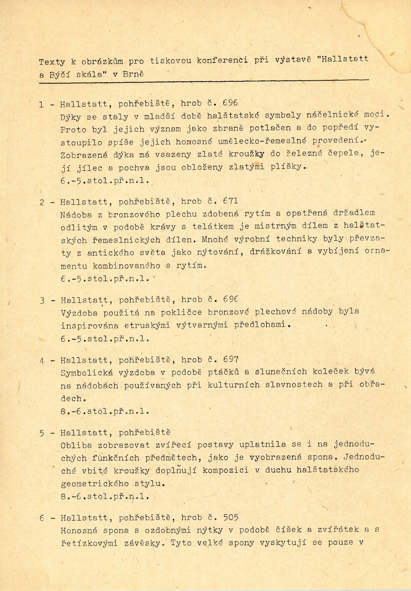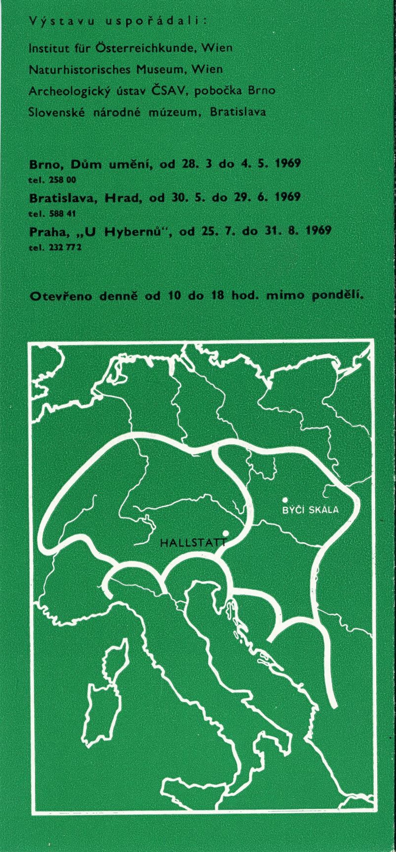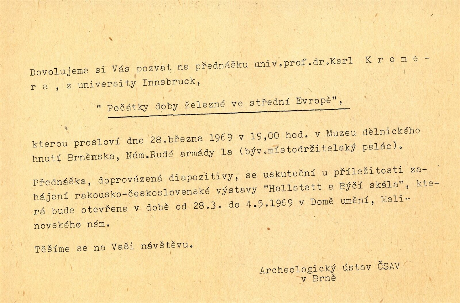 pozvánka (ČJ, NJ), katalog, leták, strojopis pozvánky na přednášku (prof. dr. Karel Kromer), text k výstavě, texty k obrázkům pro tiskovou konferenci, fotografie vystavených exponátů, korespondence (dopis Adolfu Kroupovi z Archeologického ústavu ČAV s žádostí o uspořádání výstavy), recenze v tisku, pozvánka na výstavu (Bratislava, Vídeň), turistické brožury o Rakousku