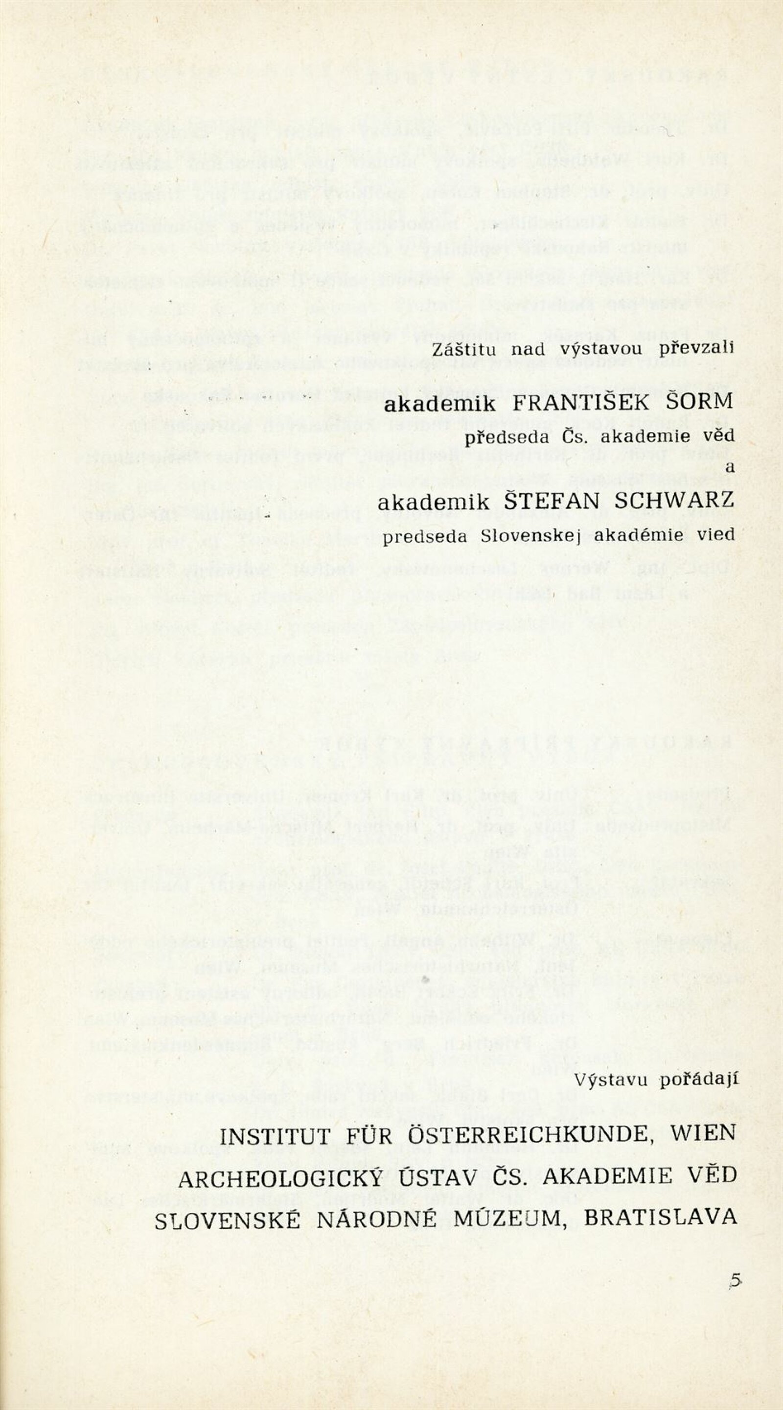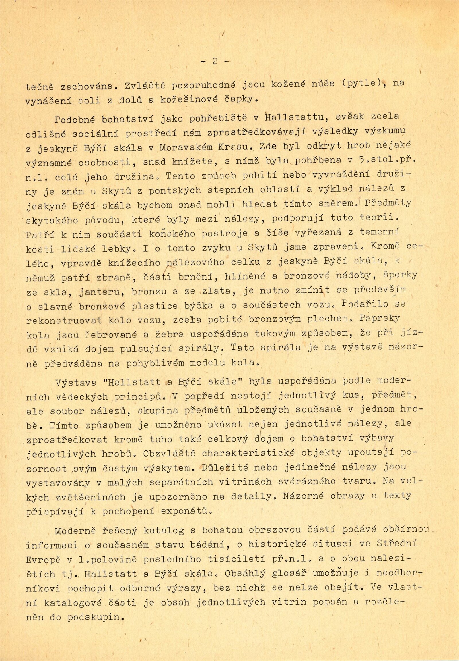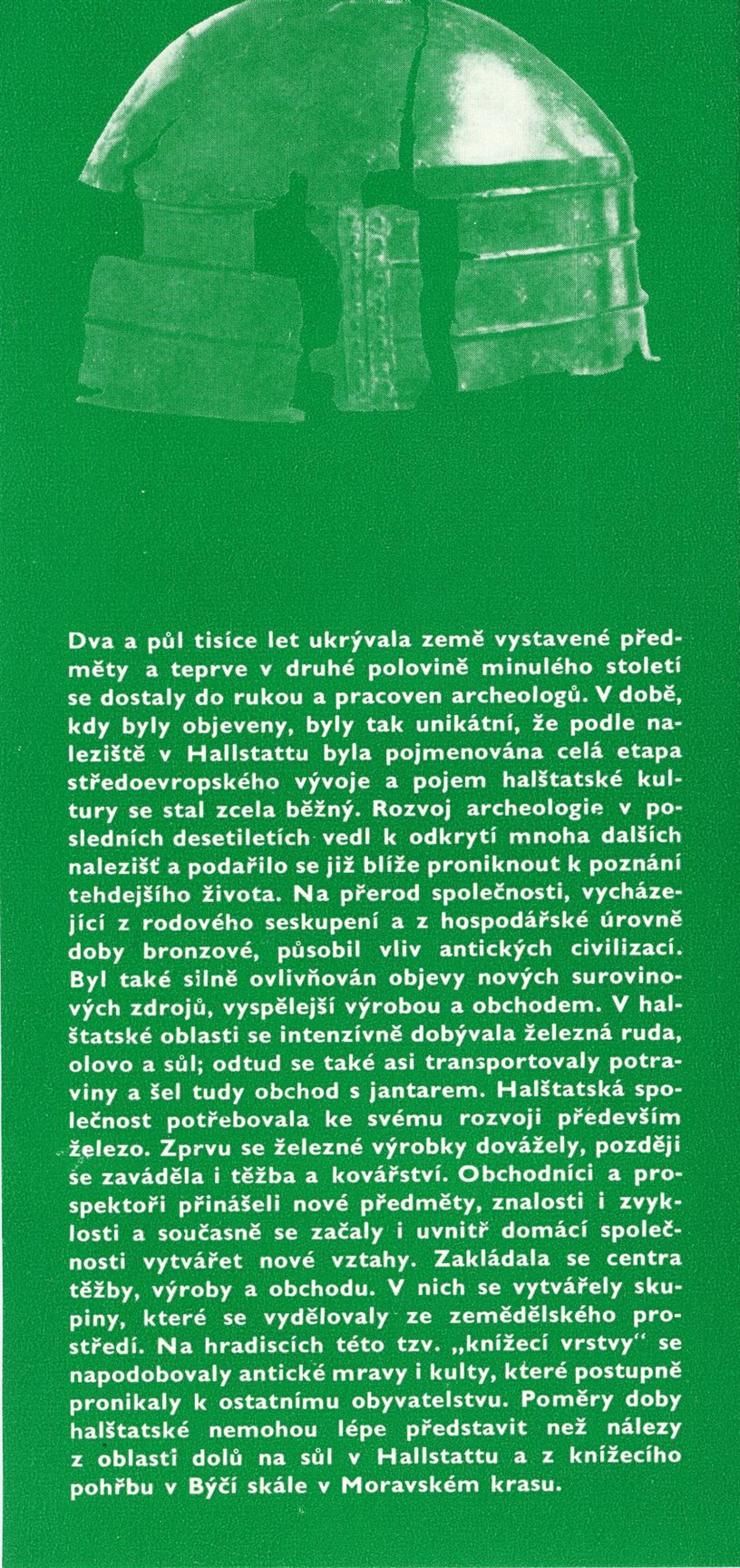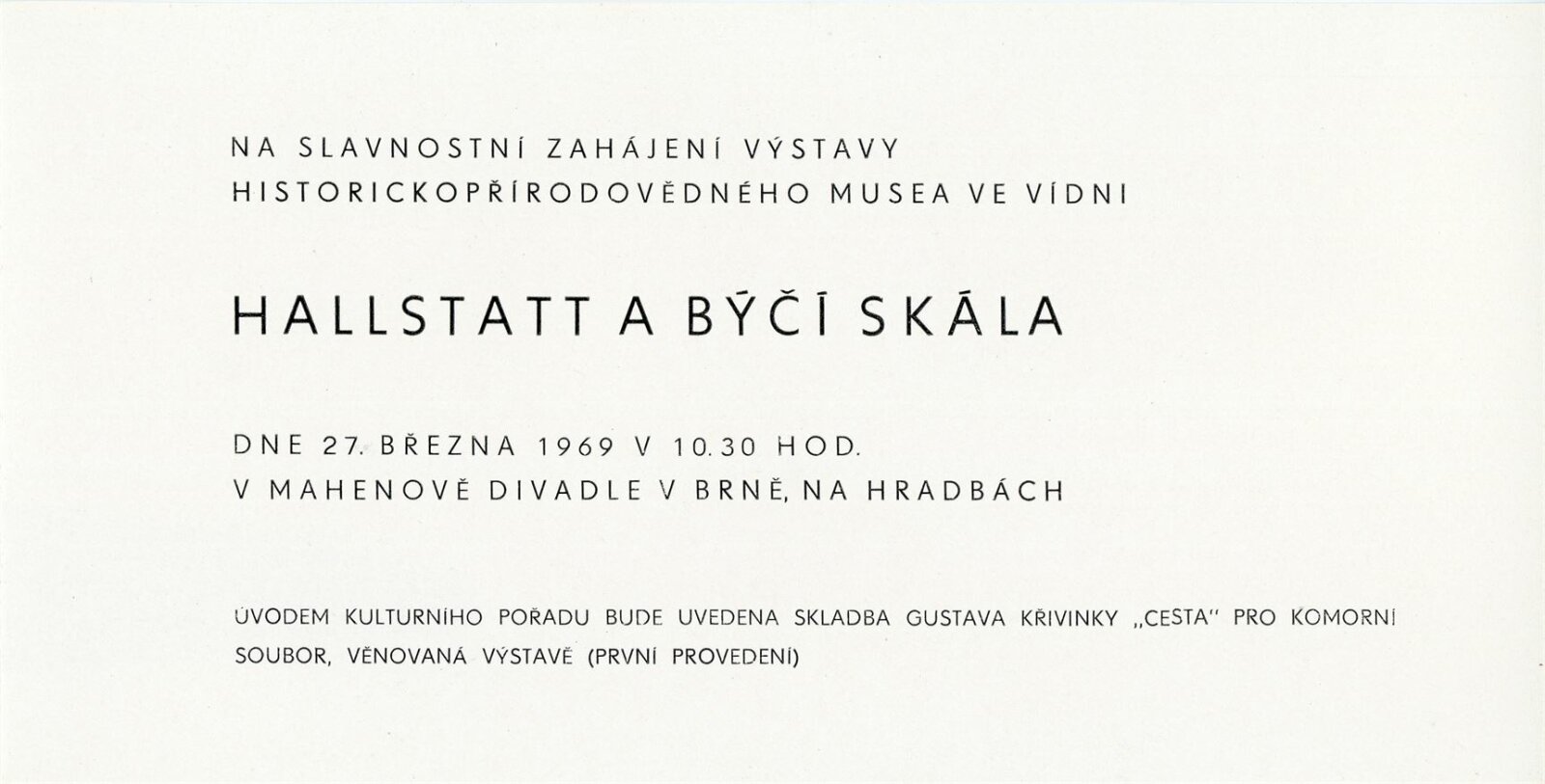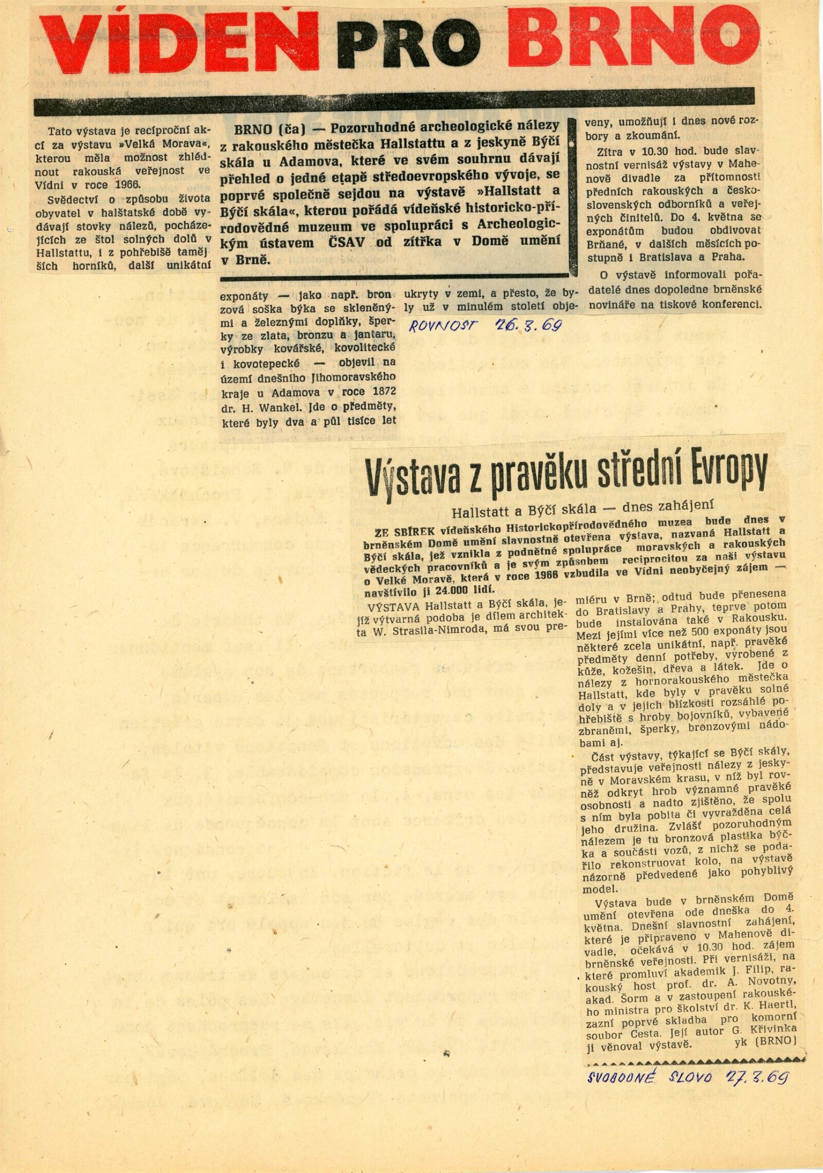 pozvánka (ČJ, NJ), katalog, leták, strojopis pozvánky na přednášku (prof. dr. Karel Kromer), text k výstavě, texty k obrázkům pro tiskovou konferenci, fotografie vystavených exponátů, korespondence (dopis Adolfu Kroupovi z Archeologického ústavu ČAV s žádostí o uspořádání výstavy), recenze v tisku, pozvánka na výstavu (Bratislava, Vídeň), turistické brožury o Rakousku