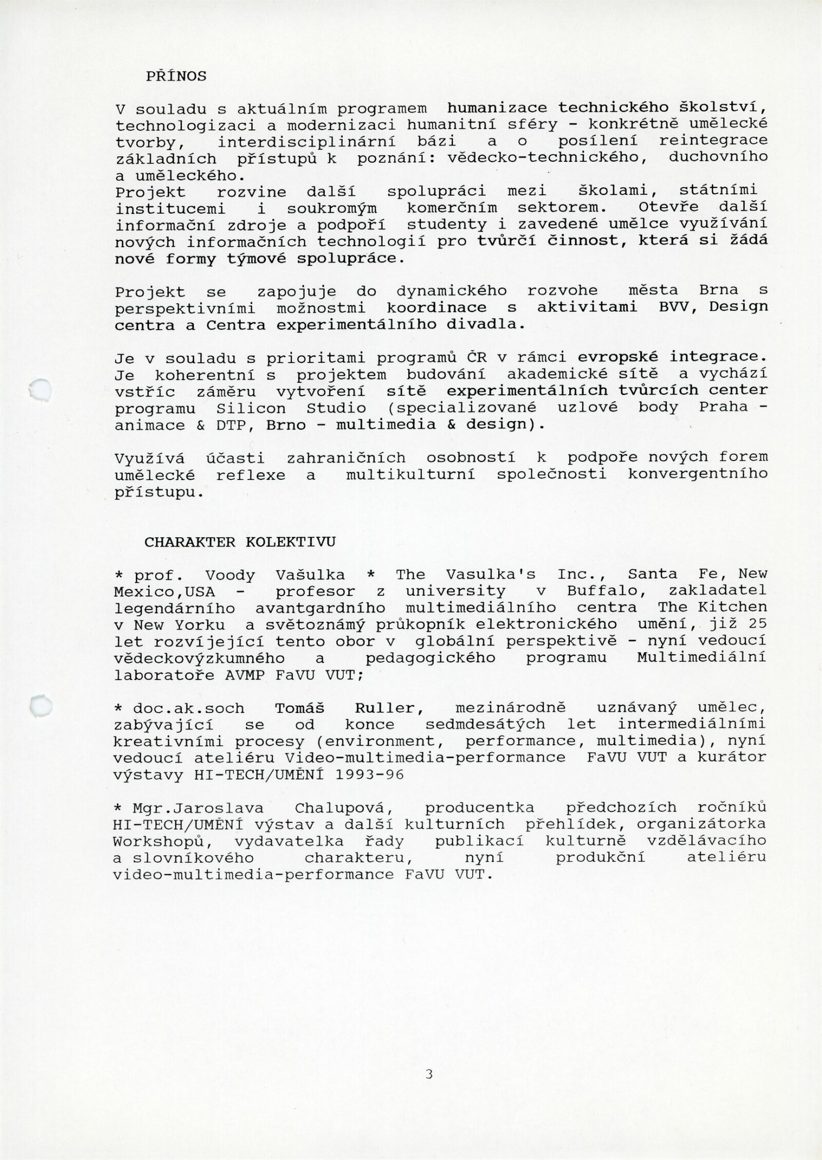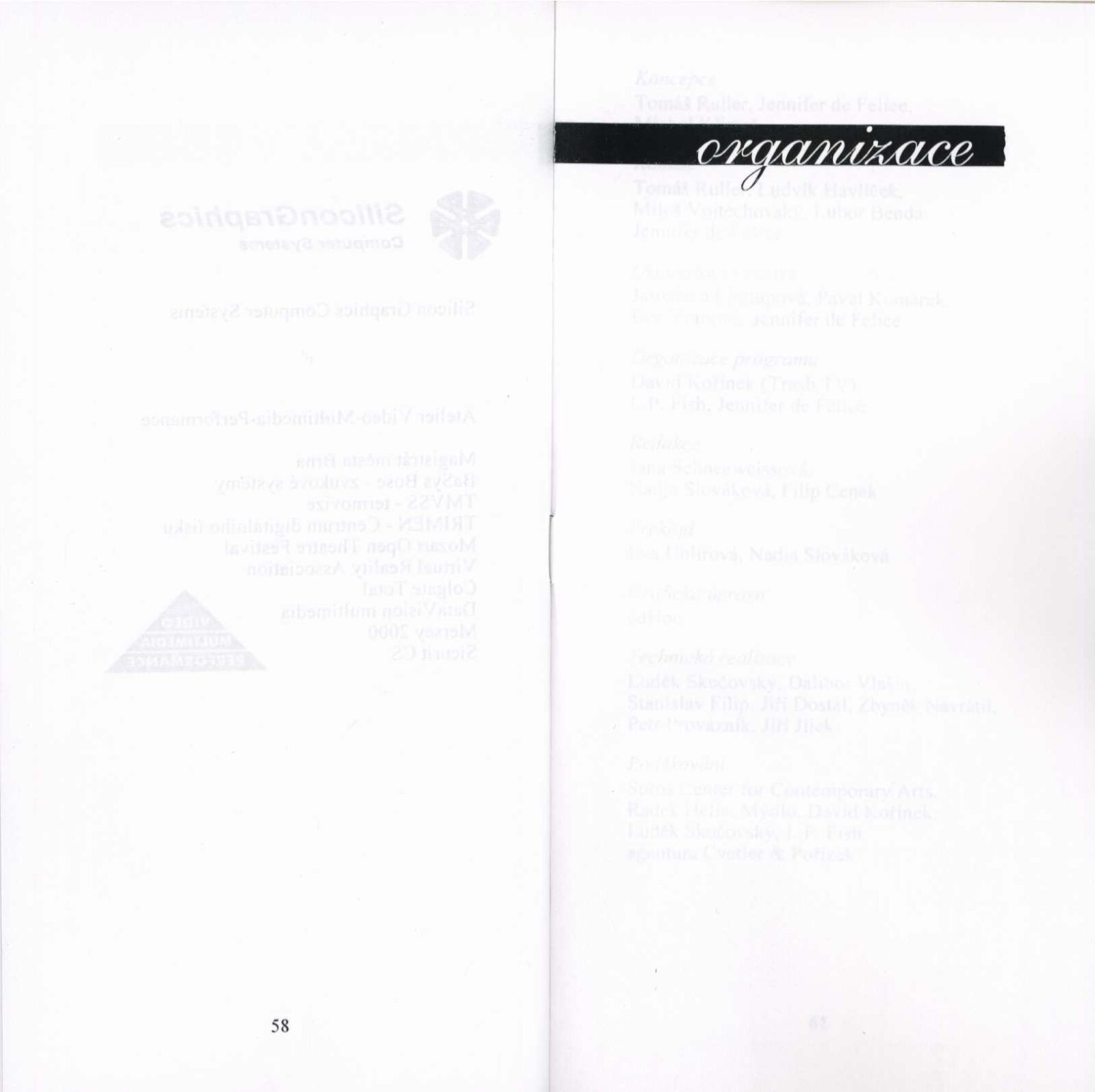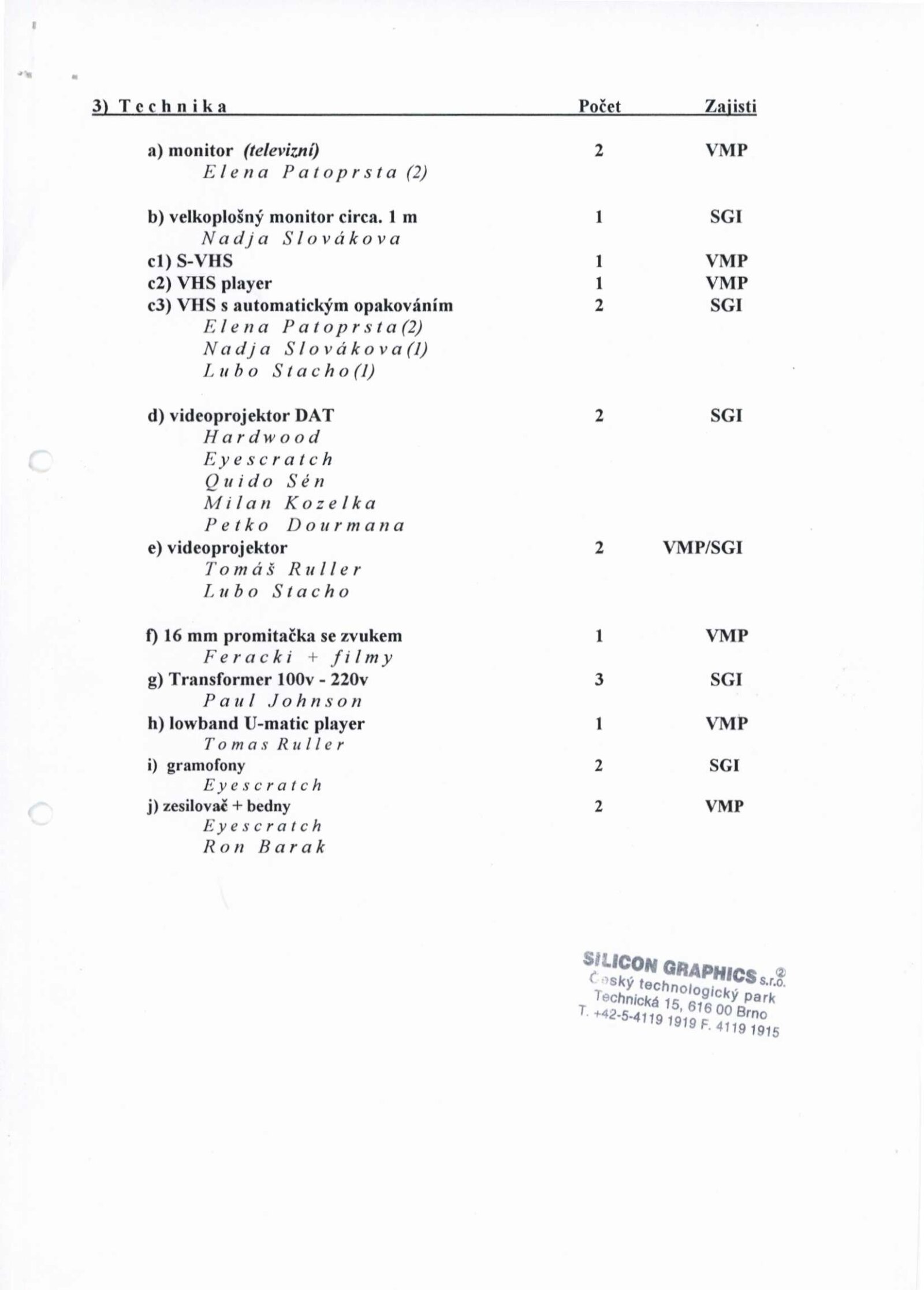 Steina Vasulka, Hana Daňková, Federico Díaz, Richard Fajnor, Jennifer de Felice, Stanislav Filip, Michal Gerža, Pavel Hart, Martin Janíček, Milan Kaliňák, Monika Karasová, Pavel Kopřiva, Marek Mařan, Marian Palla, Peter Rónai, Luděk Skočovský, Nadja Slováková, Jindřich Sládek, Lucie Svobodová