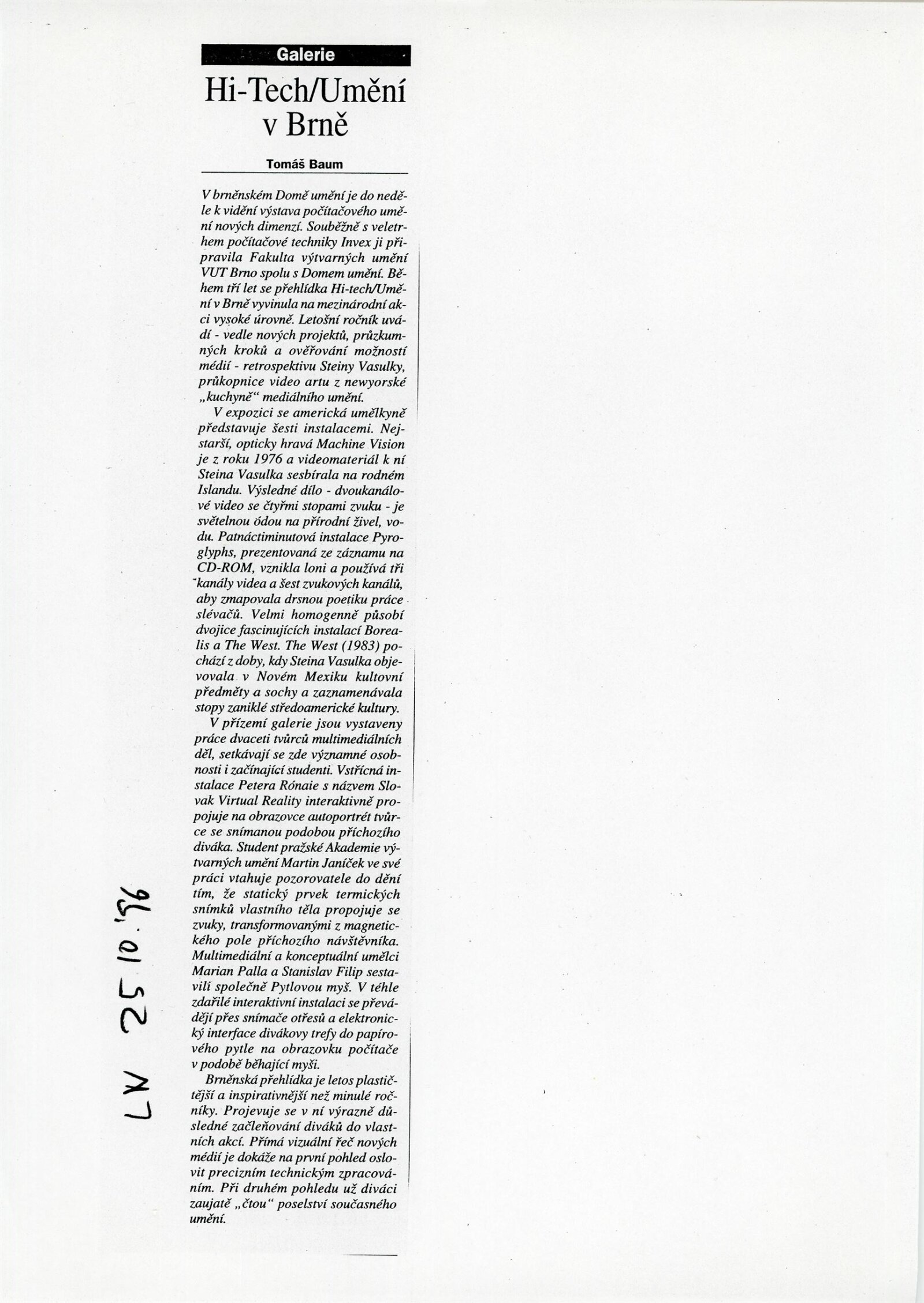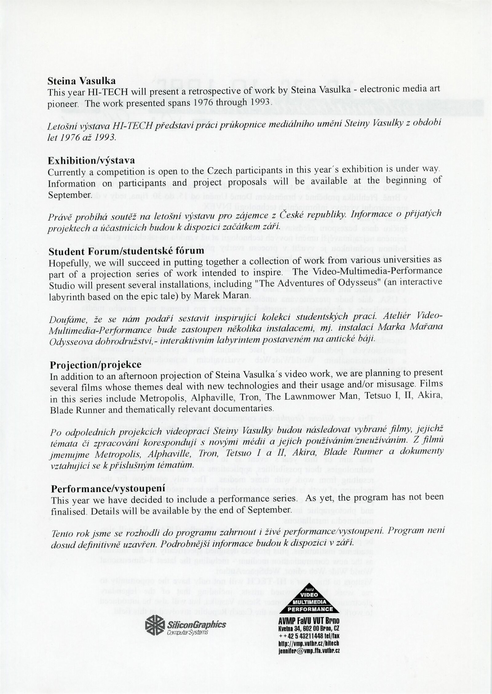 V roce 1996 proběhla v Domě umění města Brna třetí výstava ze série pravidelných každoročních mezinárodních výstavních projektů a sympozií s názvem Hi-tech umění, které v letech 1994 - 1997 pořádal ateliér Video-Multimedia-Performance (pod vedením Tomáše Rullera) z brněnské Fakulty výtvarných umění při VUT ve spolupráci a za podpory americké technologické společnosti Silicon Graphics Systems, Moravské galerie (1994), Moravského muzea, CED (1996) a Domu umění města Brna (1996 a 1997). Pojem Hi-tech, v devadesátých letech používaný pro označení nejvyspělejších technologických přístrojů, elektroniky a médií, měl na výstavách prezentovat aktuální českou i mezinárodní tvorbu umění nových médií vznikající za použití nejnovějších technologií. Výstava Hi-tech umění 1996 s podnázvem Allvision byla uvedena v době konání mezinárodního veletrhu výpočetní techniky Invex na brněnském Výstavišti a byla koncipovaná, oproti předchozímu ročníku, jako početná kolektivní přehlídka českých a slovenských audiovizuálních umělců a studentů, ale především poprvé ve střední Evropě prezentovala samostatnou retrospektivní přehlídku videí a audiovizuálních instalací Steiny, mezinárodní umělkyně a životní partnerky Woodyho Vašulky, jež společně patřili mezi světové průkopníky videoartu. Retrospektivu Steiny bylo možné uspořádat díky přátelským vztahům a několikaleté spolupráci kurátora Tomáše Rullera s manželi Vašulkovými, který pro prezentaci v Brně získal řadu důležitých a složitých instalací: rozměrné imerzivní instalace Borrealis (1993) a Pyroglyphs (1995), multikanálová videa Tokyo Four (1991), The West (1983), audiovizuální dílo Vocalization (1990) a komplexní multikanálové audiovizuální instalace Ptolemy (1990) a Allvision (1976), po níž byla pojmenována celá přehlídka. Některé z těchto děl byly v následujícím roce převzaty a vystaveny Milošem Vojtěchovským ve Veletržním paláci v Praze. Dílo Steiny oslovilo širokou veřejnost i recenzenty, kteří oceňovali Steininu práci s médiem, v níž se neklade důraz na technickou stránku, ale spíše na utváření svébytného vizuálního a uměleckého jazyka. Pro českou a slovenskou prezentaci vybrali kurátoři díla, která vznikala s využitím výpočetní techniky, a pro která digitální technologie neznamenají estetický prostředek, ale “multidimenzionální pole kreativních možností”. Jednalo se především o experimentální a studijní práce v rozpětí od videí, fotografií, tisků po multimediální instalace; samostatnou sekci pak tvořil WorldWideWeb, kde návštěvníci mohli využít počítačovou myš pro vstup do internetového rozhraní a realizaci vlastních výtvarných prací v grafických programech. Výstava byla doplněna bohatým doprovodným programem, s týdenním sympoziem zahrnujícím hudební, zvukové koncerty, performance, básnické výstupy, prezentace, dětský workshop a každodenní promítání filmů se speciálními počítačovými efekty. (MS)