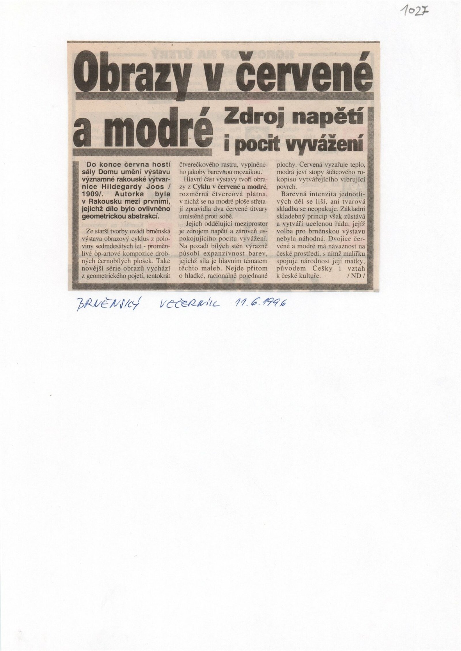 H.+ H. Hildegard a Harold Joos. Serie červeno-modrá: Dům umění Brno, 30. 5. – 30. 6. 1996 / Text: Victoria Martino. – Český Krumlov: Nadace Egon Schiele. 1996. – [47] s., obr., portrét, životopis, výstavy., název a text též německy, DU 1027. – MG
