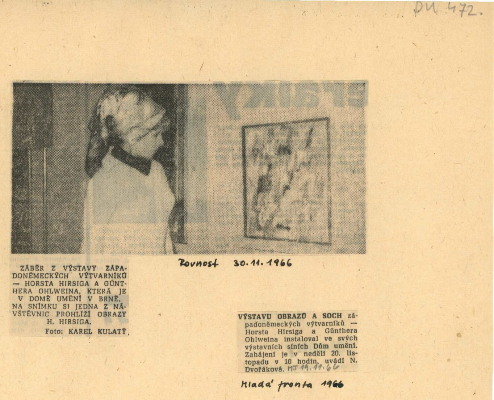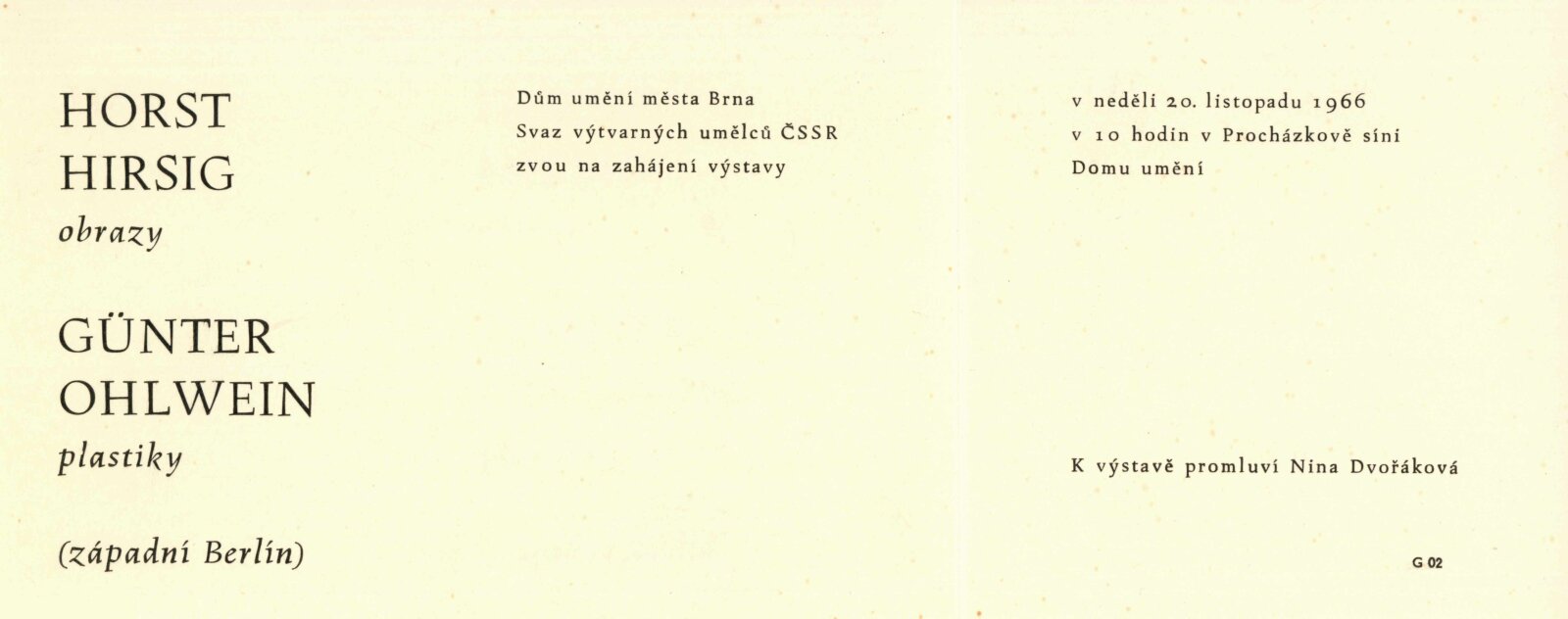 Horst Hirsig. Günter Ohlwein. Obrazy a plastiky: Dům umění, hala, 20. 11. – 11. 12. 1966 / Převzatý katalog. Horst Hirsig. Obrazy. Kresby. Günter Ohlwein. Plastiky. Kresby: Galerie u Řečických, Praha, 15. 9. – 9. 10. 1966 / Texty: Lothar Orzechowski, Dietrich Mahlow. – Praha: SČSVU, 1966. – 32 s., obr., DU 472. – MG