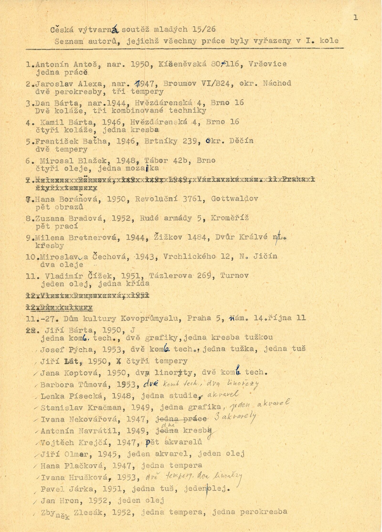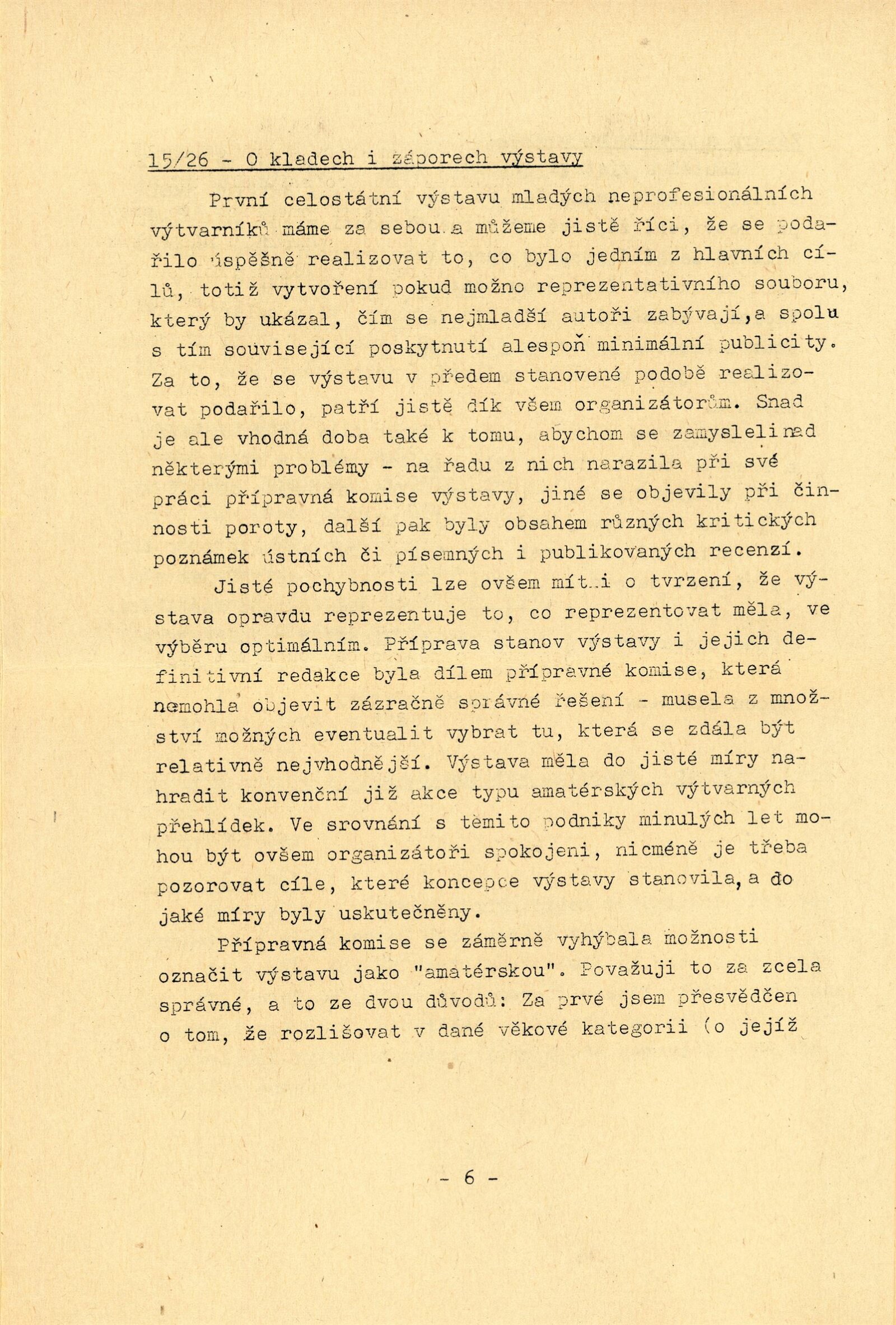 I. česká soutěžní výstava mladých 15/26: Dům umění města Brna / Dům pánů z Kunštátu, 23. 11. 1969 – 4. 1. 1970 / Texty: Jiří Valoch, Alois Toufar. – Brno: DUmB, 1969. – 2 s., obr., seznam prací 4 s., DPK 424. – MZK; MG