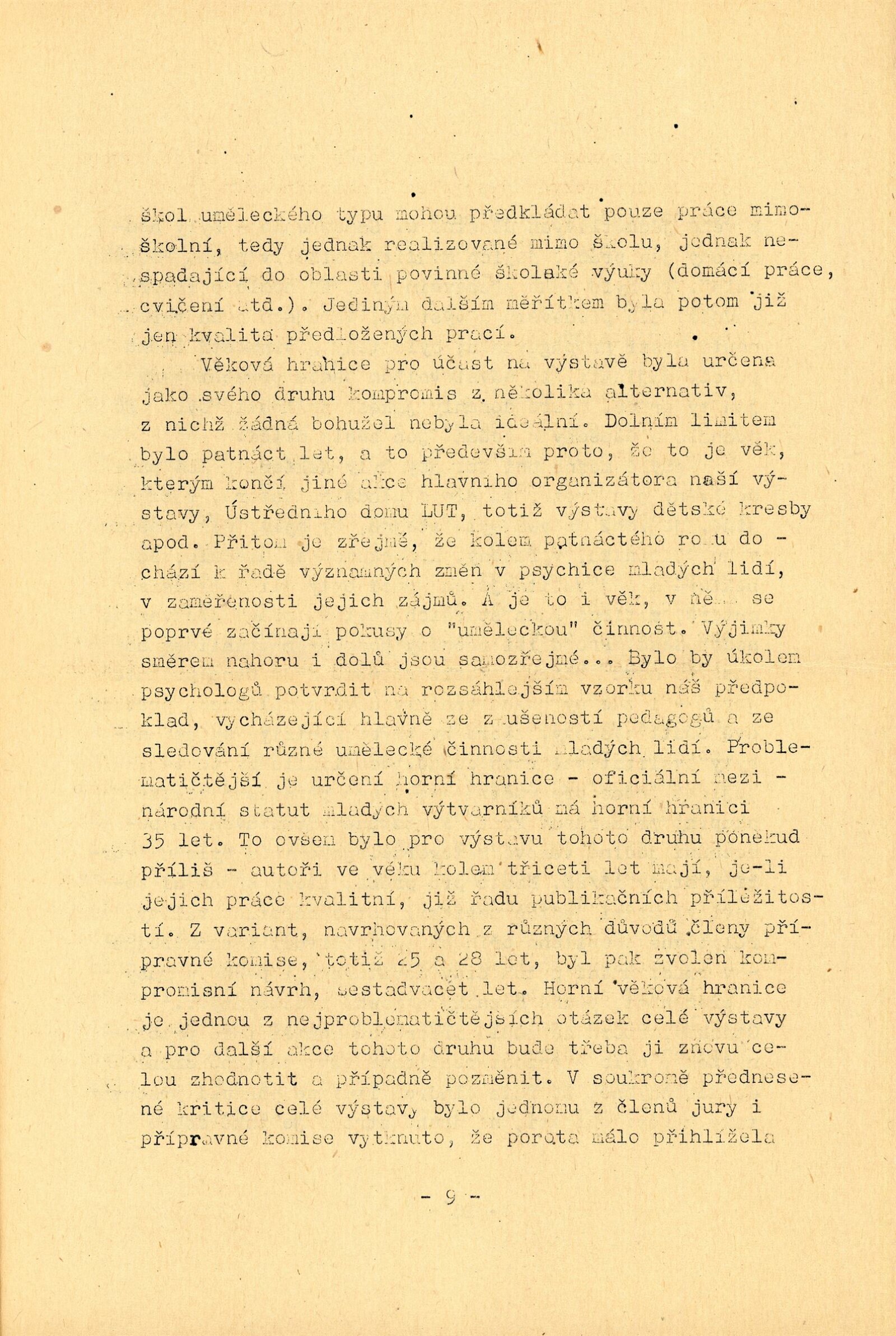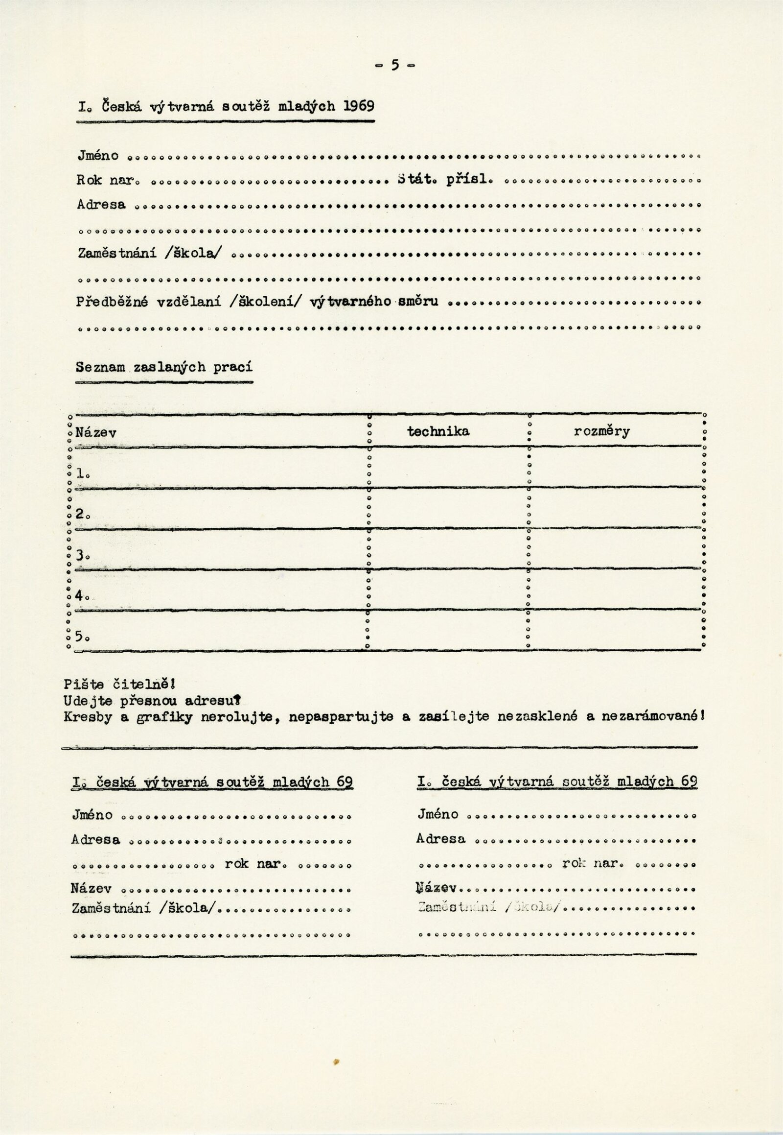 pozvánka, katalog, maketa katalogu, plakát, strojopis „Výtvarný bulletin“ (květen 1970), strojopis „Výtvarnictví“, podklady pro katalog. seznamy (seznam vystavených prací, seznam vyznamenaných autorů, seznam prací vyřazených v II. kole, seznam prací vyřazených v I. kole), fotografie výstavy, korespondence (účastníků soutěže – navrácení děl, žádosti o účast, provozní korespondence – příprava výstavy, katalog), zápisy o přípravě výstavy, podmínky pro uspořádání výstavy, evidenční list, recenze v tisku, katalog „Havlíček“ (Bučovice 1969) + „Mladí 69“ (Frýdek-Místek 1969) + „Mladí vystavují“ (Praha 1969) + „Merlin sedmi“ (Hradec Králové 1969) + „Jarmila Malátová“ (Praha, 1969)