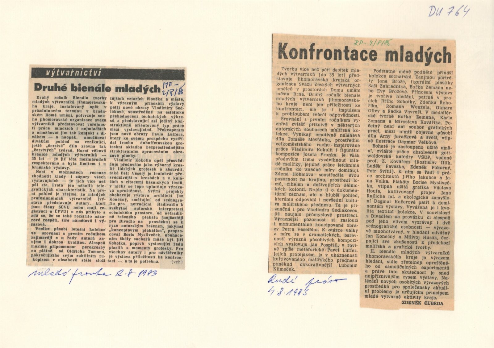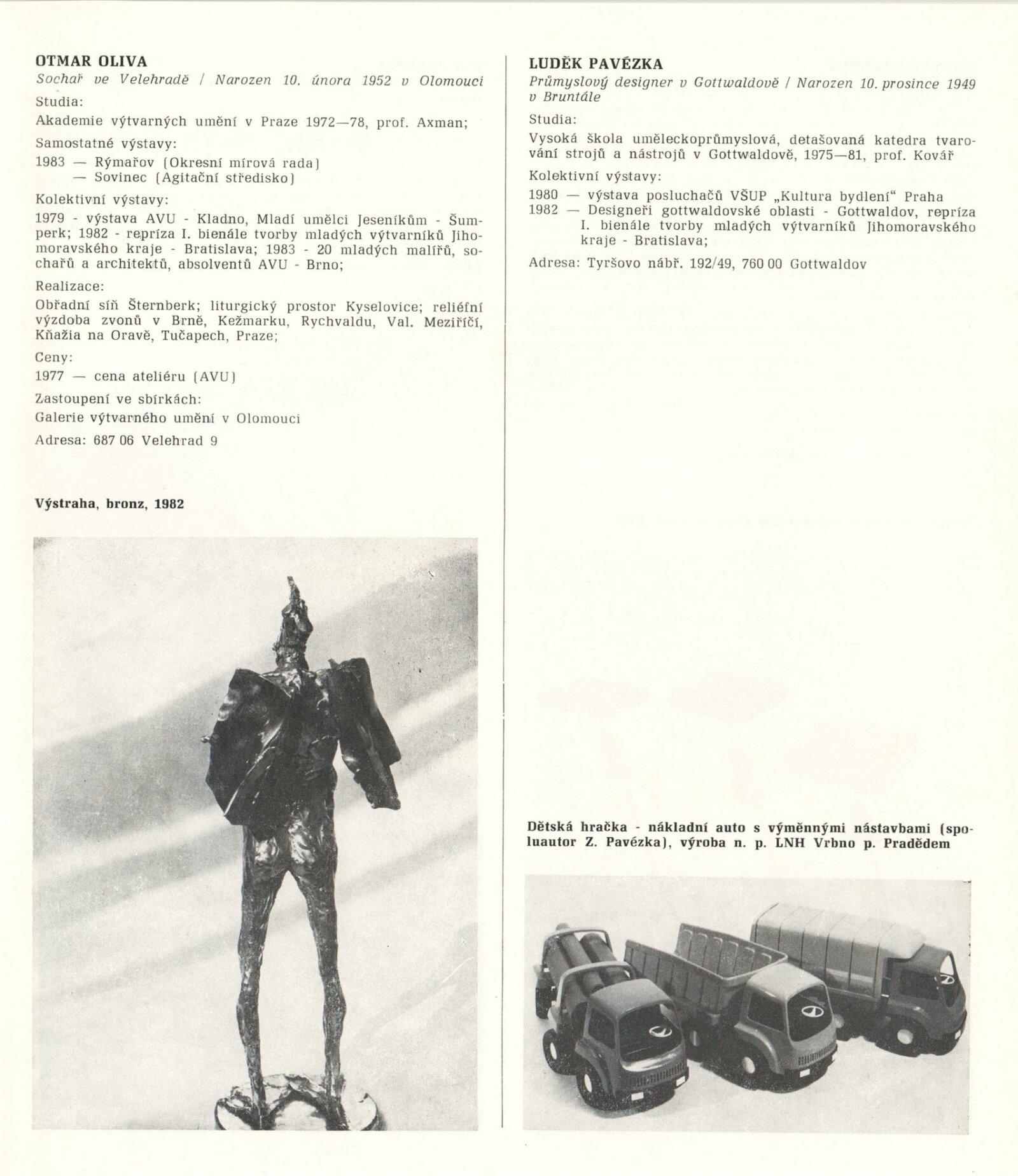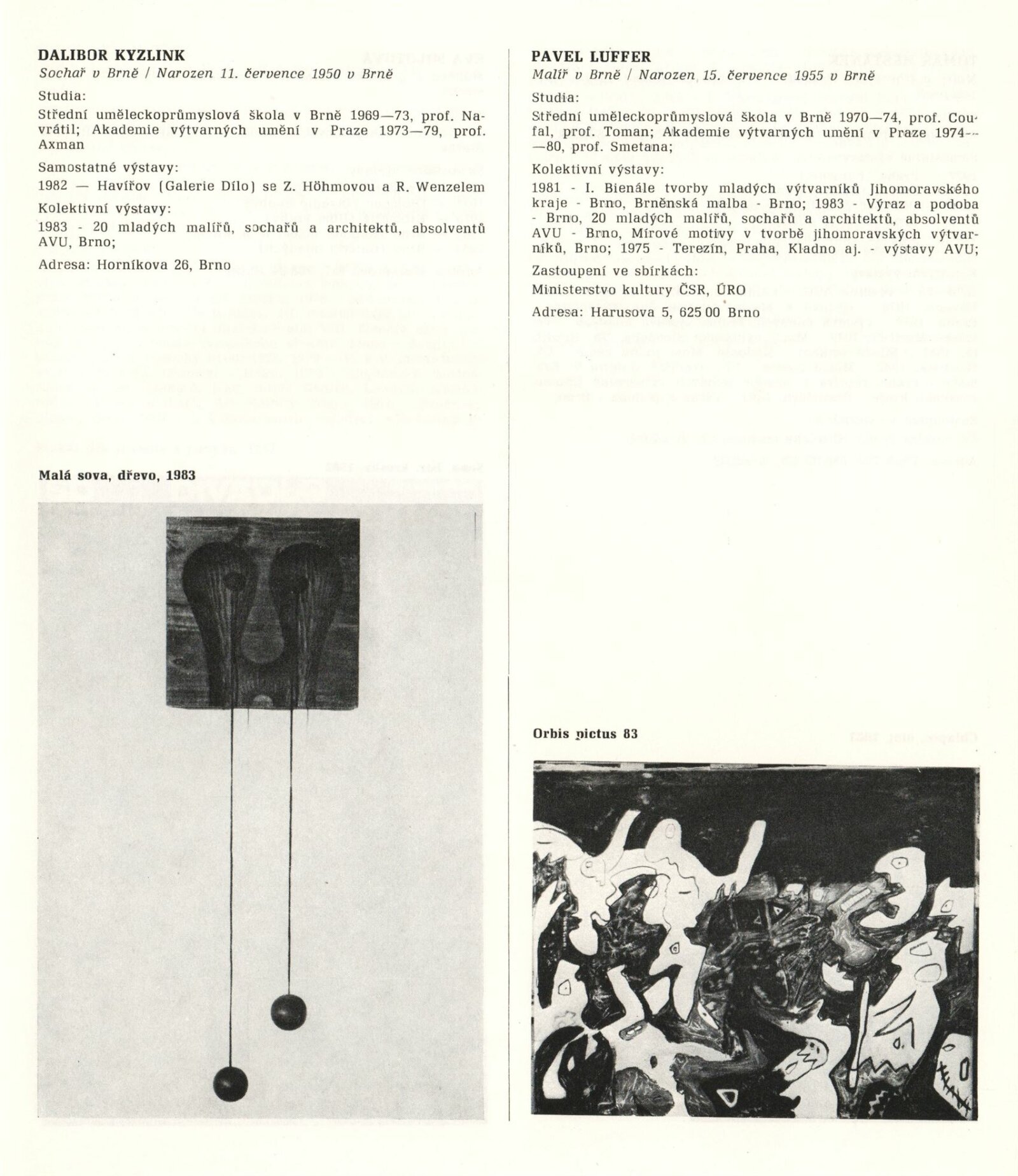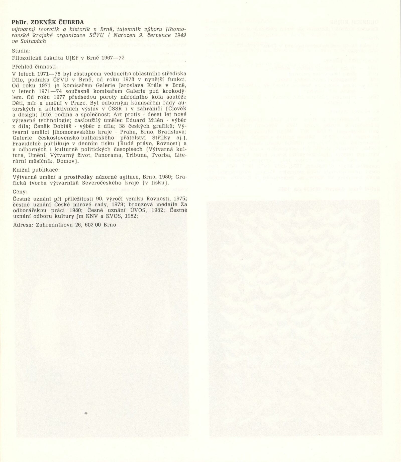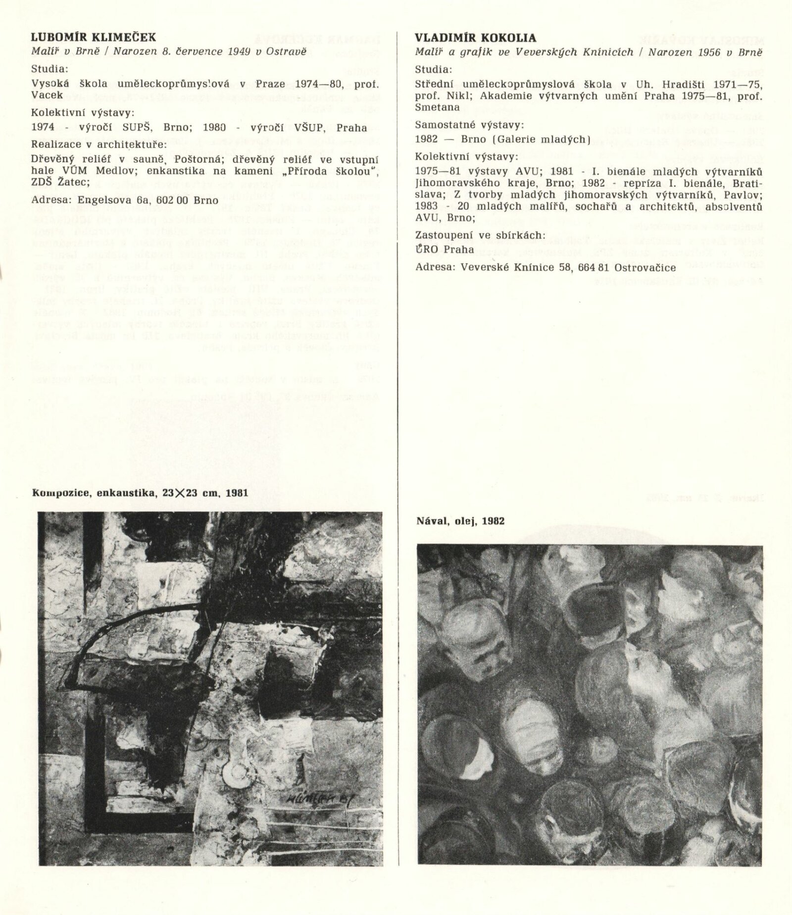 II. bienále tvorby mladých výtvarníků Jihomoravského kraje: Dům umění města Brna, 1. patro, 8. 7. – 7. 8. 1983 / Text: Zdeněk Čubrda. – Brno: SČVU, 1983. – 38 s., obr., životopisy vystavujících, DU 764. – MZK; MG