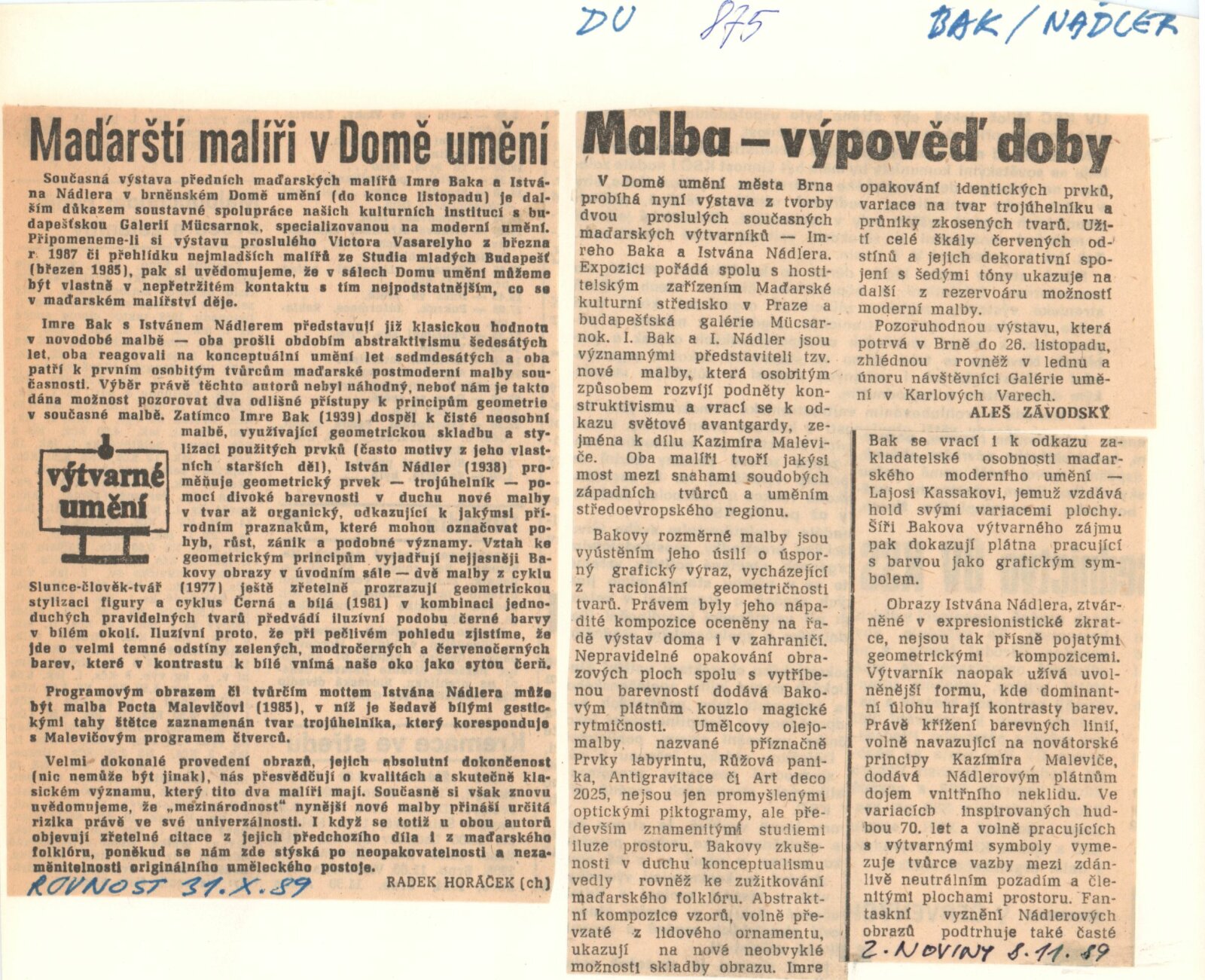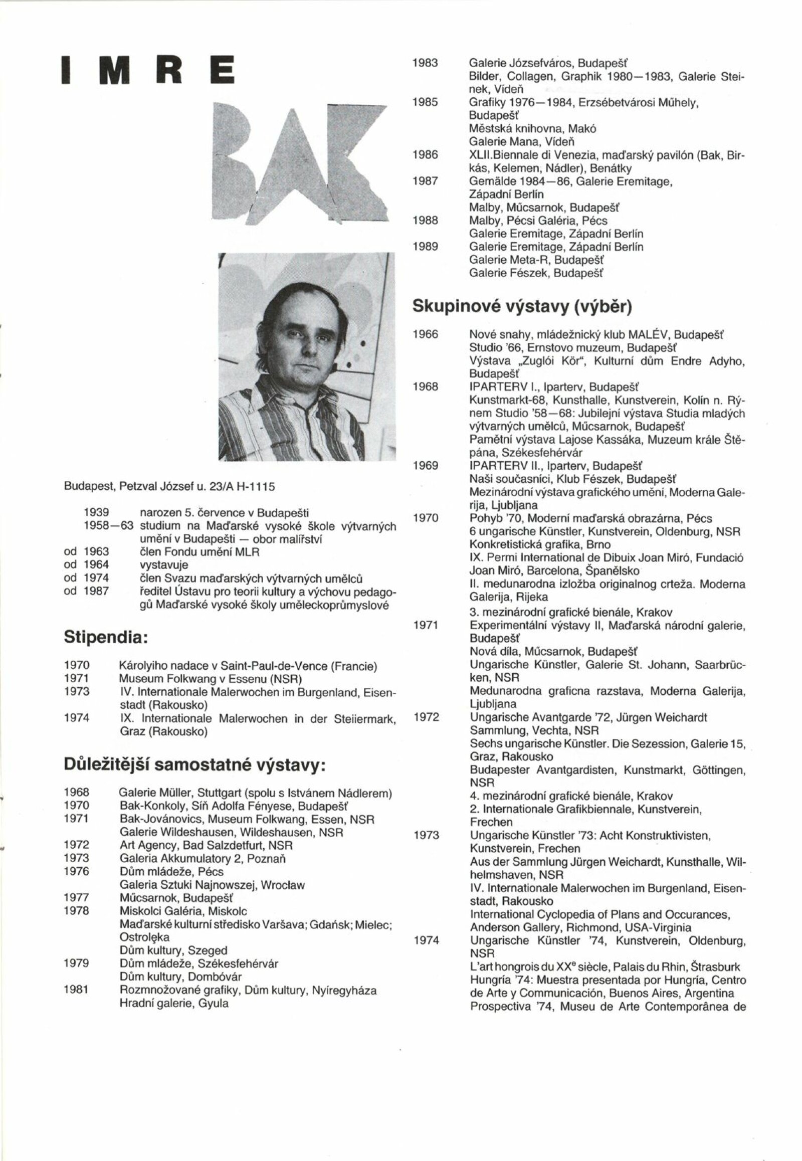 Imre Bak. István Nádler: Dům umění, 1. patro, 24. 10. – 26. 11. 1989 / Text: Katalin Nérayová, Jiří Valoch. – Praha: Maďarské kulturní středisko, 1989. – [20] s., obr., fotografie, životní data, výstavy, ceny, DU 875. – MZK; MG