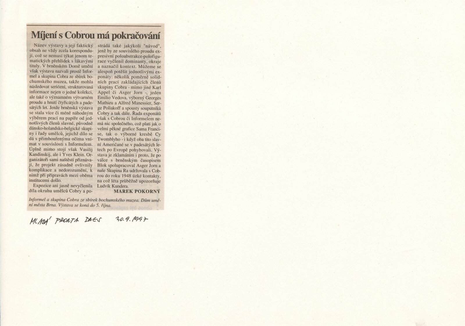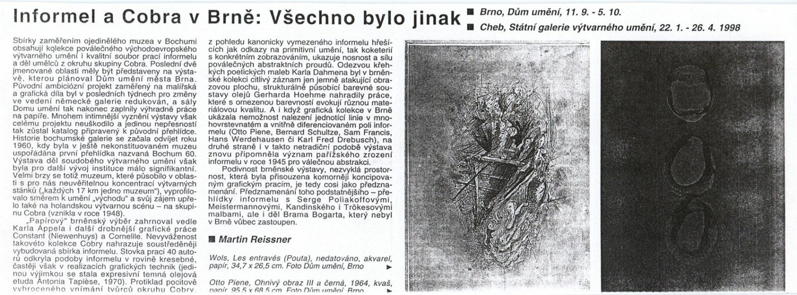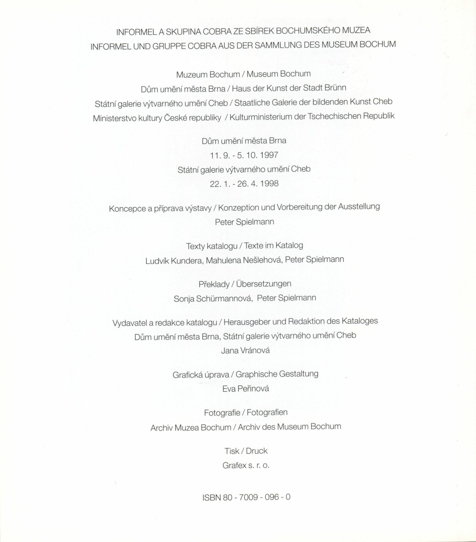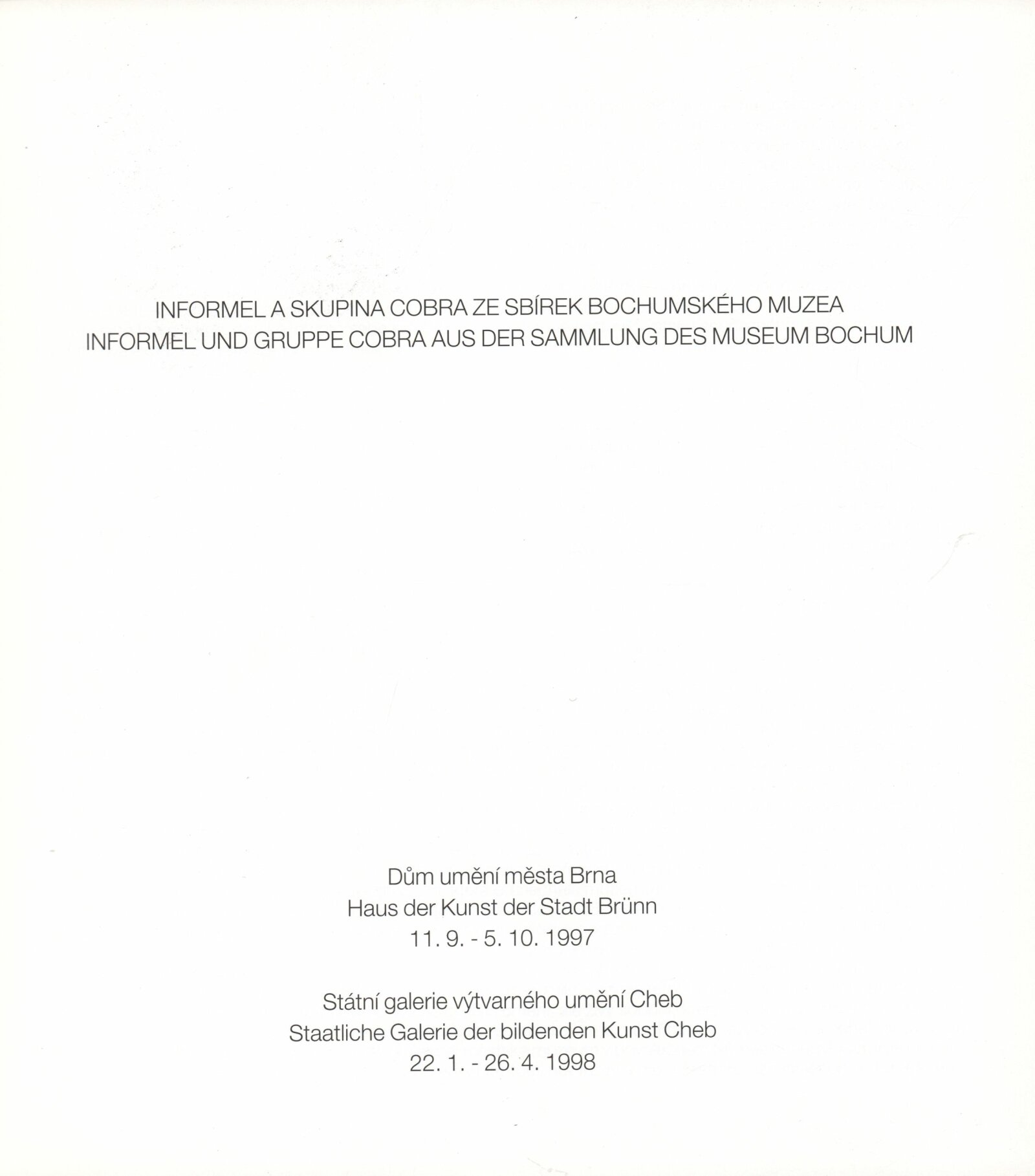Informel a skupina COBRA ze sbírek bochumského muzea: Dům umění města Brna, 11. 9. – 5. 10. 1997 / Text: Peter Spielmann, Mahulena Nešlehová, báseň Ludvik Kundera. – Brno: DUmB, 1997. – [56] s., obr., název a text též anglicky, DU 1061. – MZK