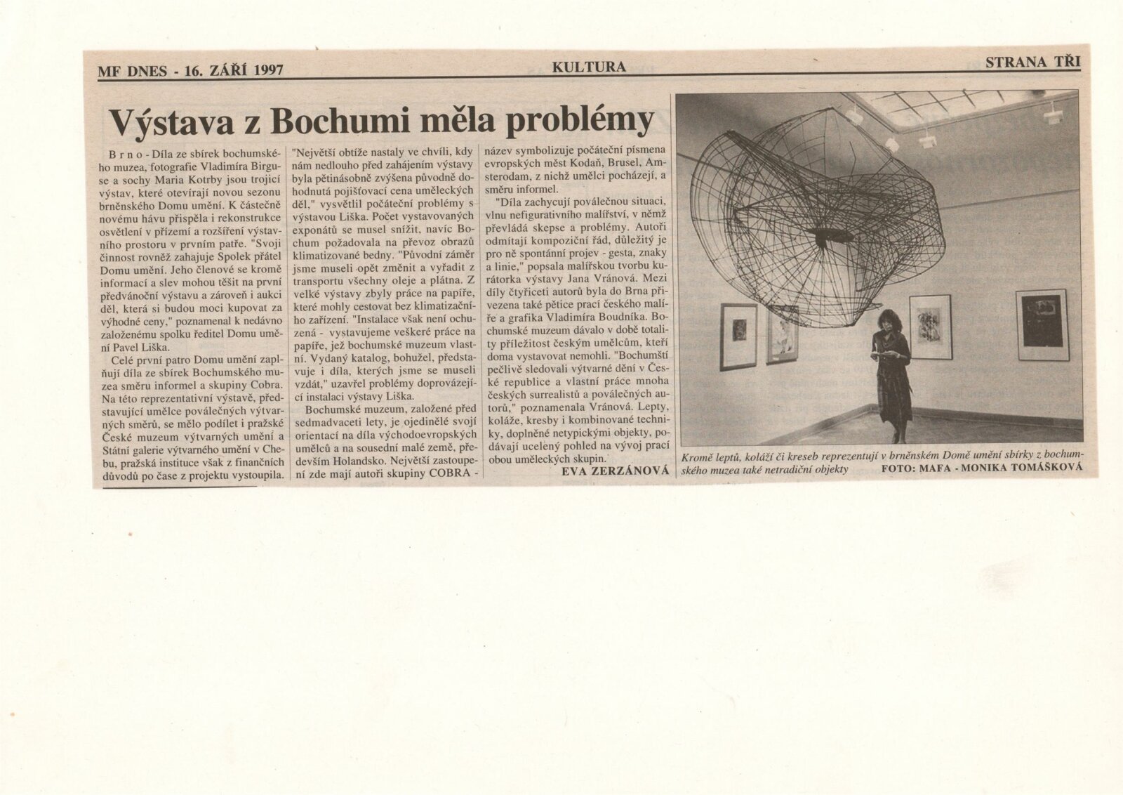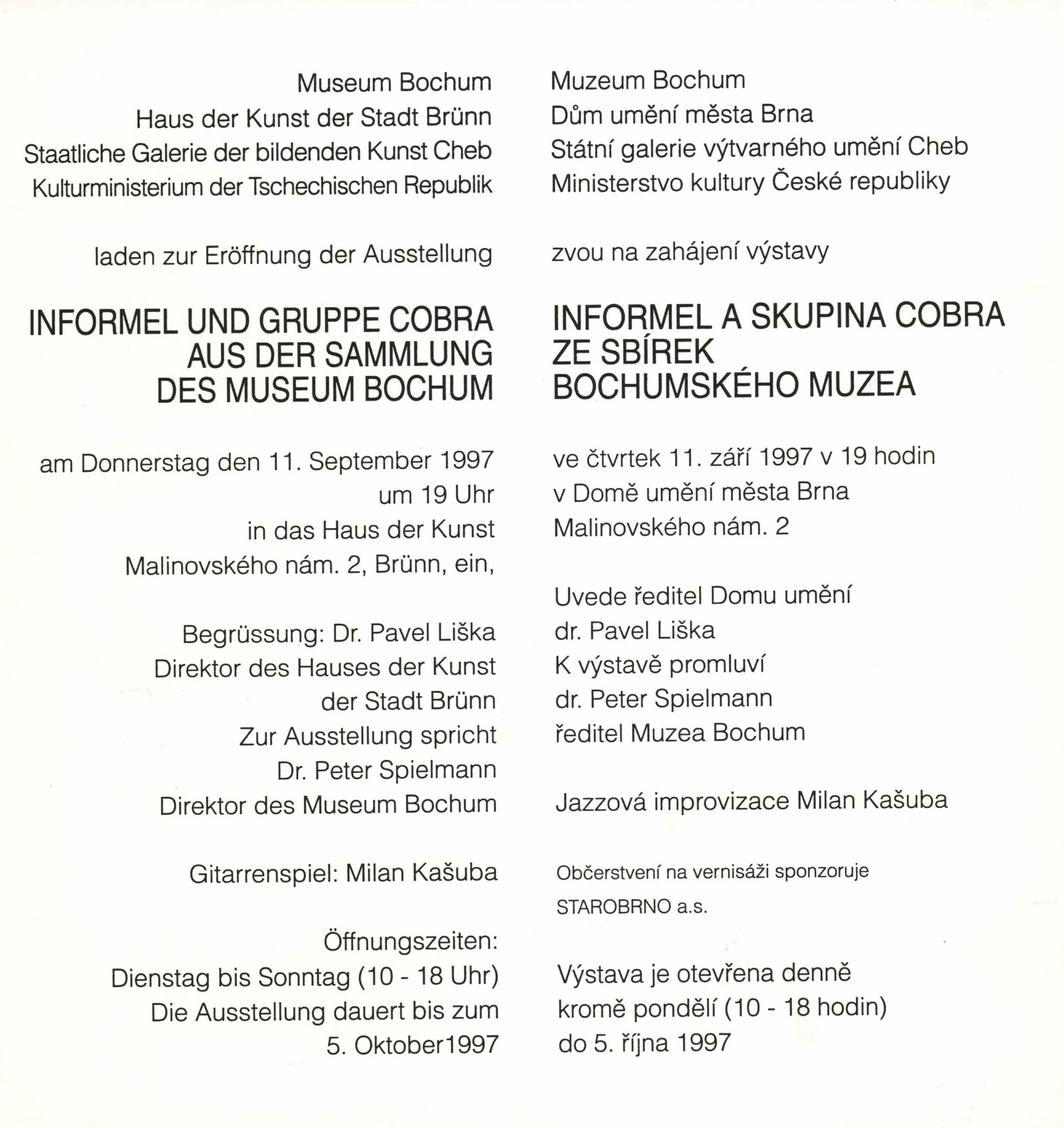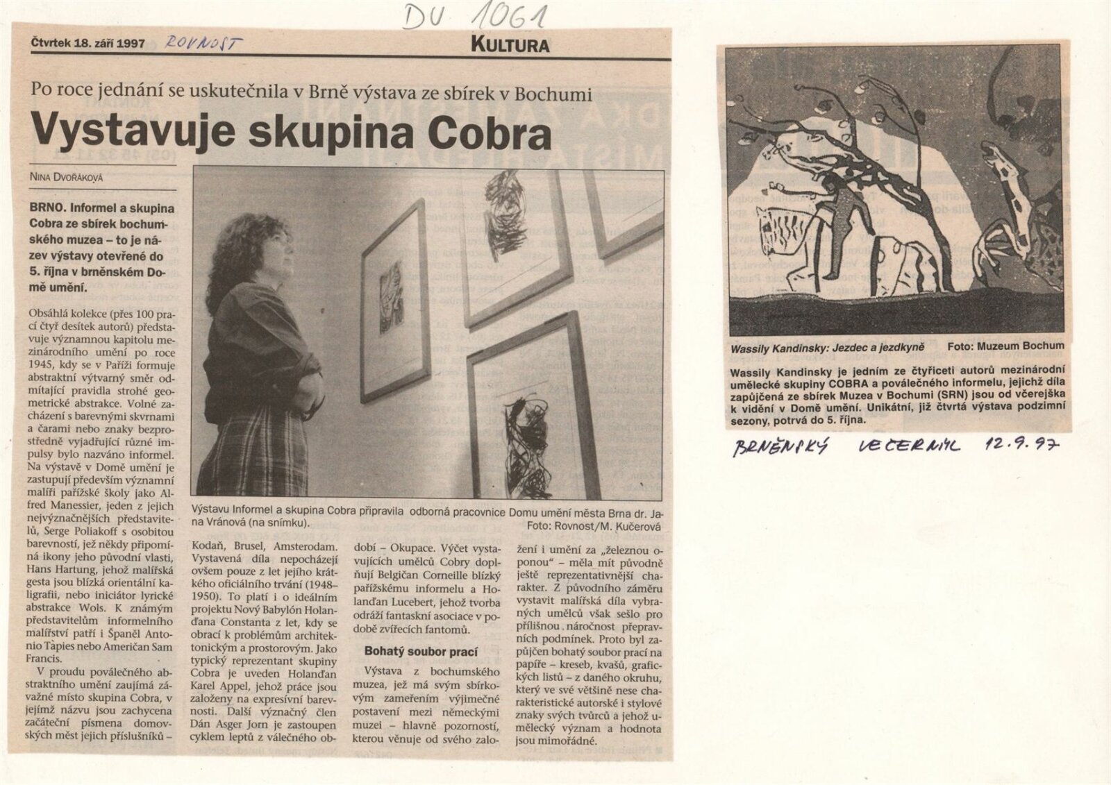 Informel a skupina COBRA ze sbírek bochumského muzea: Dům umění města Brna, 11. 9. – 5. 10. 1997 / Text: Peter Spielmann, Mahulena Nešlehová, báseň Ludvik Kundera. – Brno: DUmB, 1997. – [56] s., obr., název a text též anglicky, DU 1061. – MZK