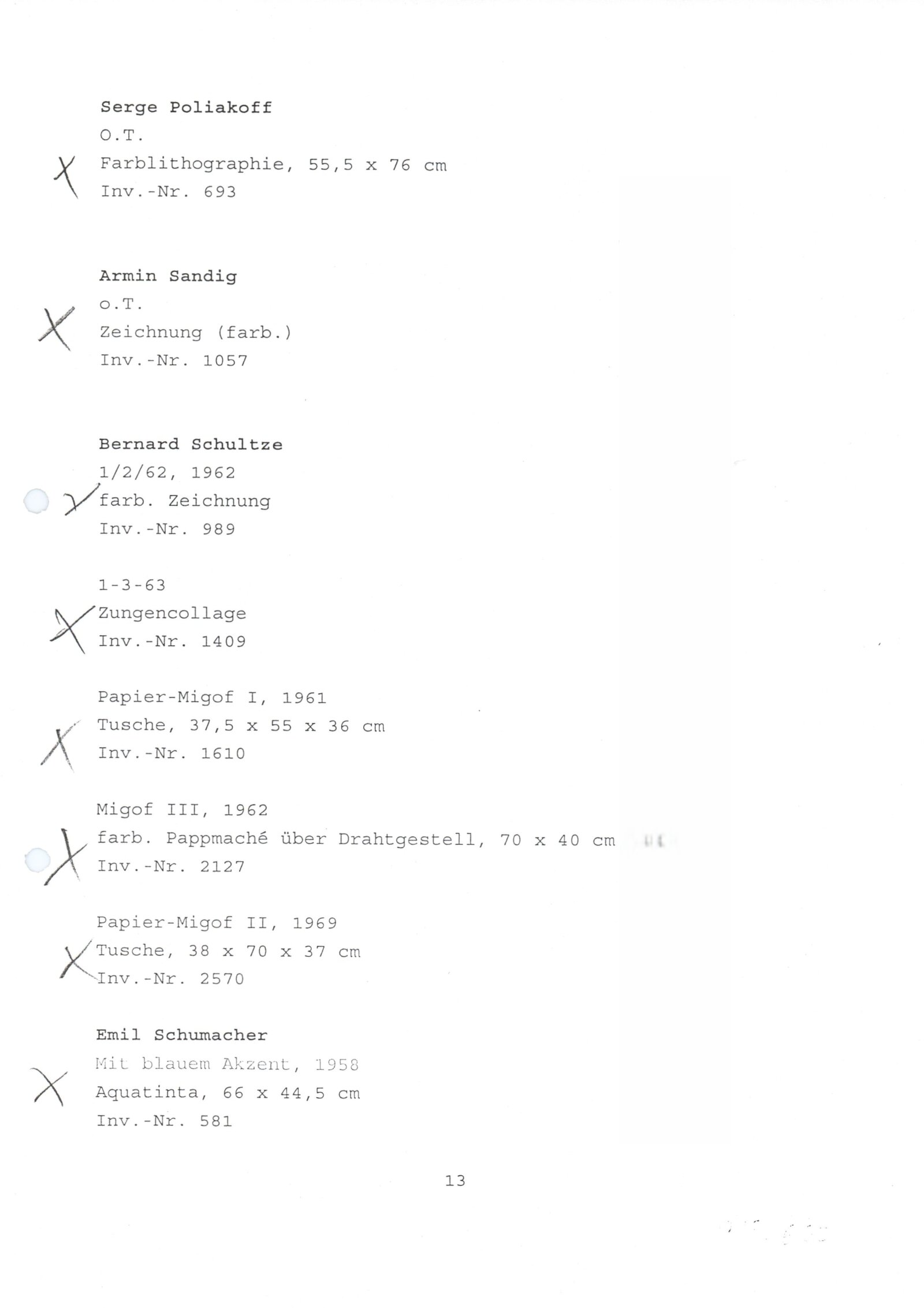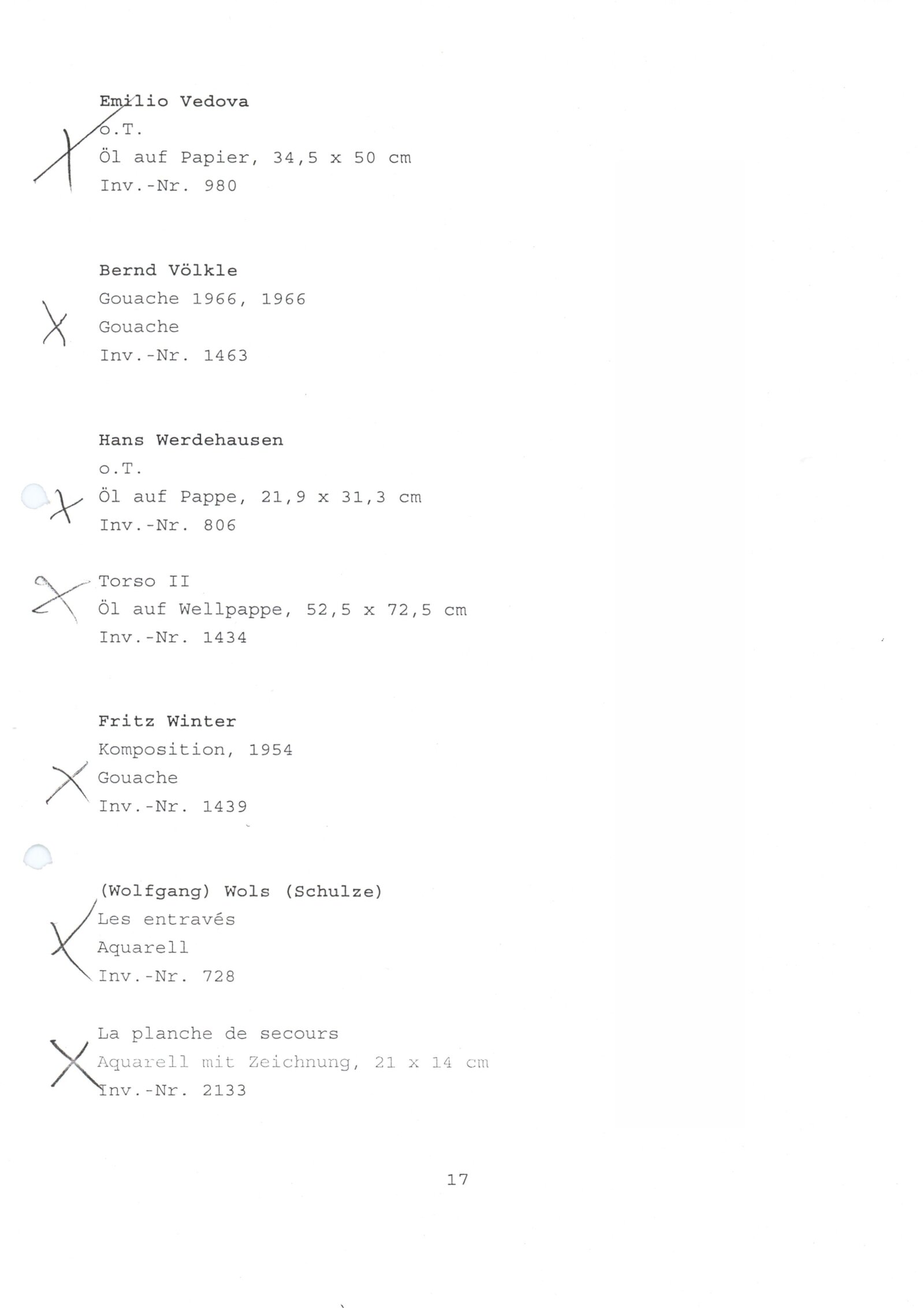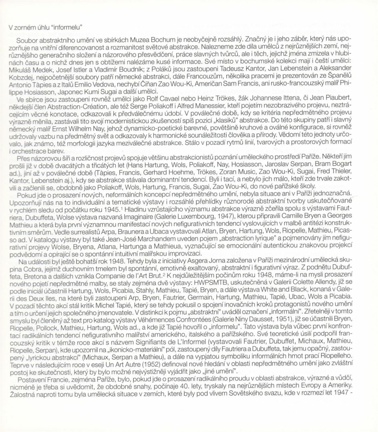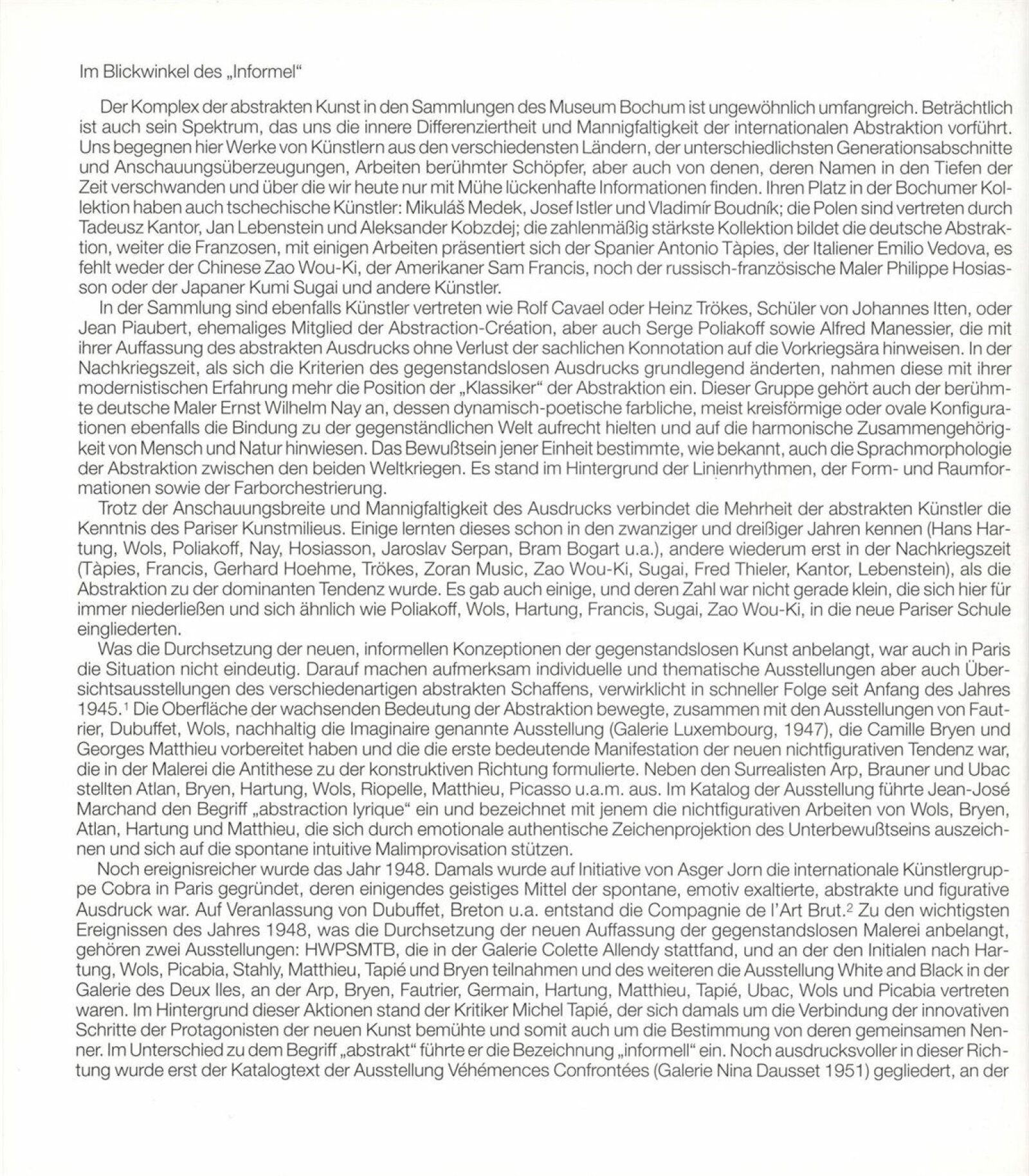 Carel Appel, Vladimír Boudník, Petr Brüning, Rolf Cavael, Constant (Nieuwenhuys), Corneille, Karl Fred Dahmen, Günter Drebusch, Jean Fautrier, Sam Francis, Johnny Friedländer, Thomas Grochowiak, Hans Hartung, Gerhard Hoehme, Asger Jorn, Horst Egon Kallinowski, Wassily Kandinsky, Yves Klein, Lucebert, Alfred Manessier, Georges Mathieu, Georg Meistermann, Ernst Wilhelm Nay, Otto Piene, Hans Platschek, Serge Poliakoff, Armin Sandig, Bernard Schultze, Emil Schumacher, Jaroslav Serpan, K. R. H. Sonderborg, Pierre Soulages, Kumi Sugai, Antonio Tapies, Heinz Trökes, Cy Twombly, Emilio Vedova, Bernd Völkle, Hans Werdehausen, Fritz Winter, Wolfgang Wols Schulze, Wou-Ki Zao