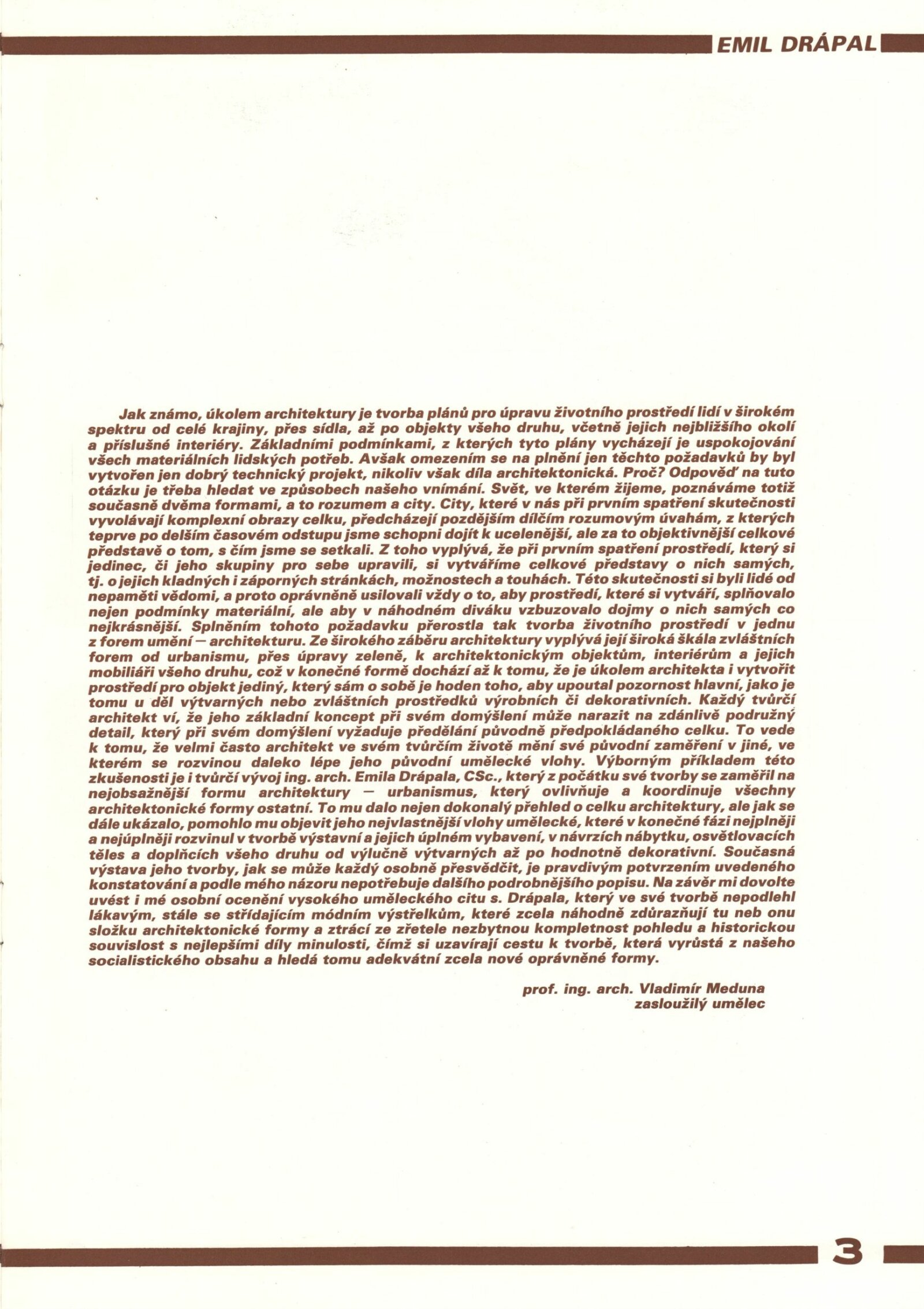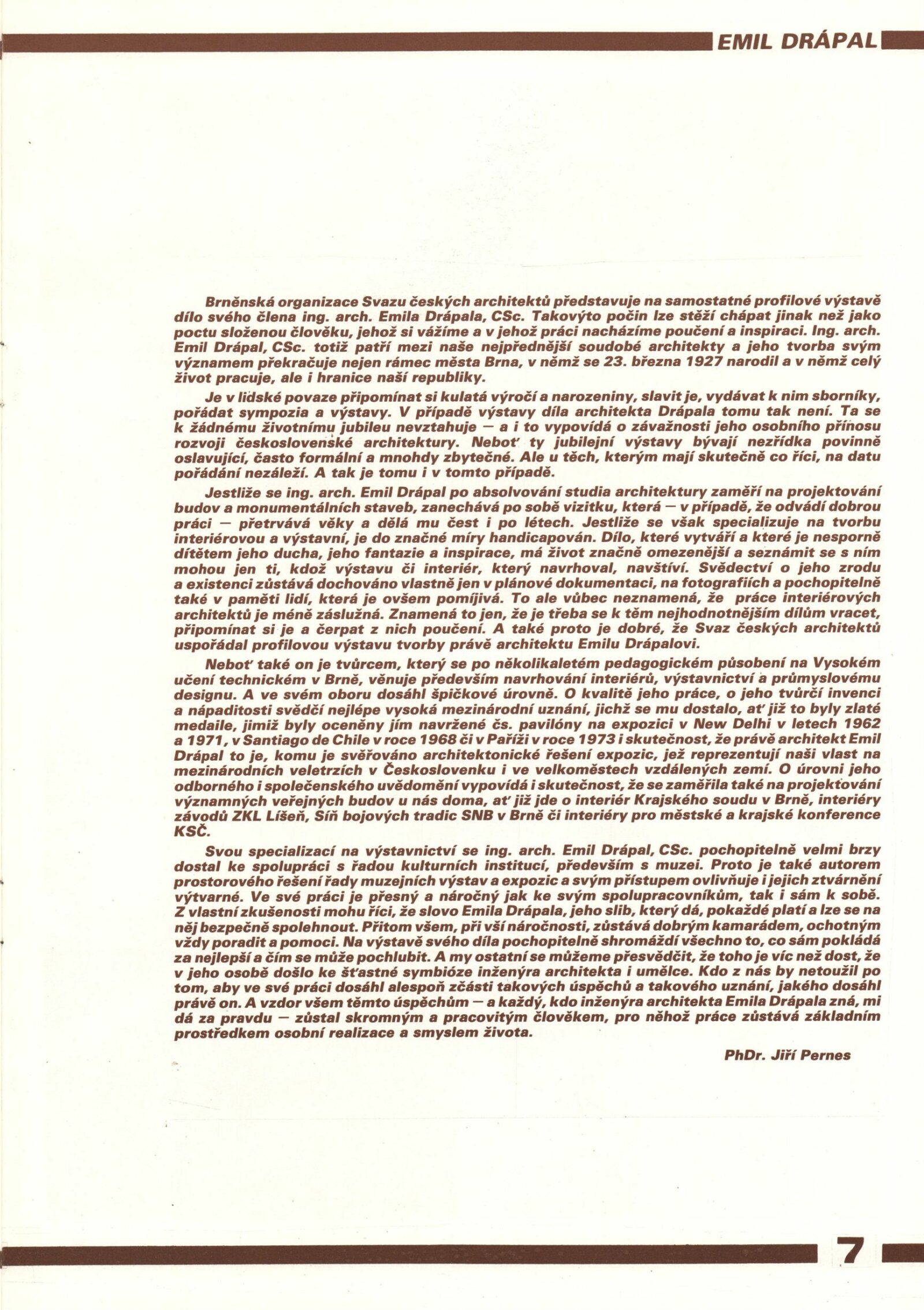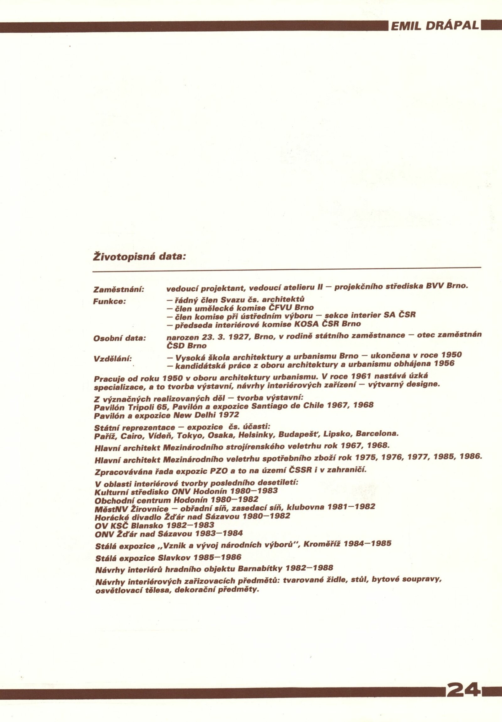 Ing. arch. Emil Drápal, CSc: Galerie Stará radnice, Kabinet architektury, 27. 4. – 29. 5. 1988 / Texty: Vladimír Meduna, Oldřich Hubáček, Jiří Pernes, Jaroslav Svoboda. – Brno: Svaz českých architektů, [1988.] – 24 s., obr., životopis, GSR 24