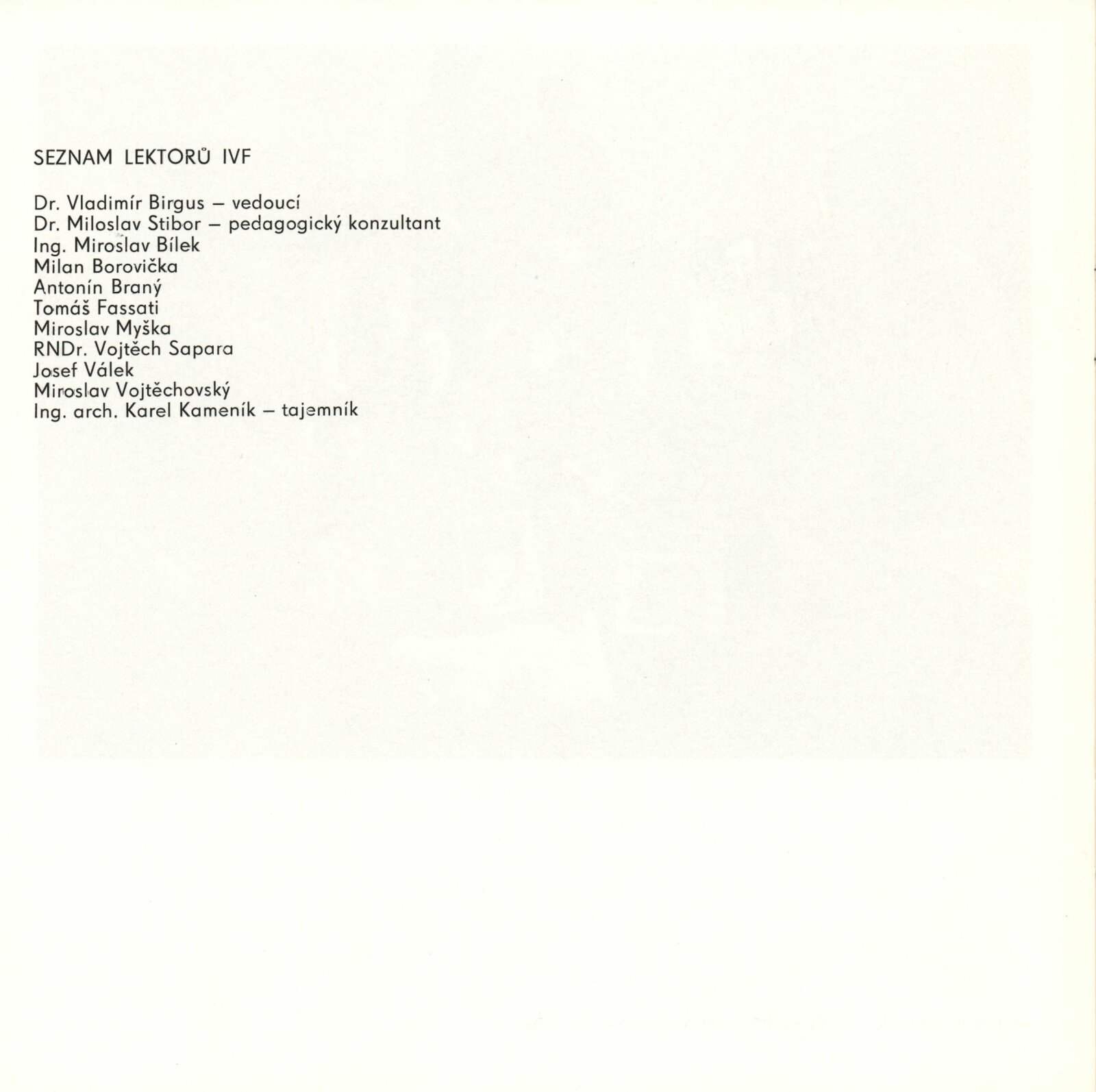 Michal Bartoš, Radovan Boček, Milan Bureš, Jiří Cajska, Jan Glozar, Slavomír Hanáček, Vladimír Houdek, Josef Husák, Rudolf Jung, Petr Kaňka, Michal Kolář, Ludmila Kubíková, Jiří Kudělka, Dušan Lanciger, Petr Lukáč, Alice Marková, Jiří Markovský, Aleš Mynář, Pavel Pech, Václav Podestát, Petr Prokopec, Stanislav Růžička, Ladislav Schäfer, Luboš Stiburek, Pavel Šešulka, Petr Šimra, Jaroslav Šindelka, Vladimír Štross