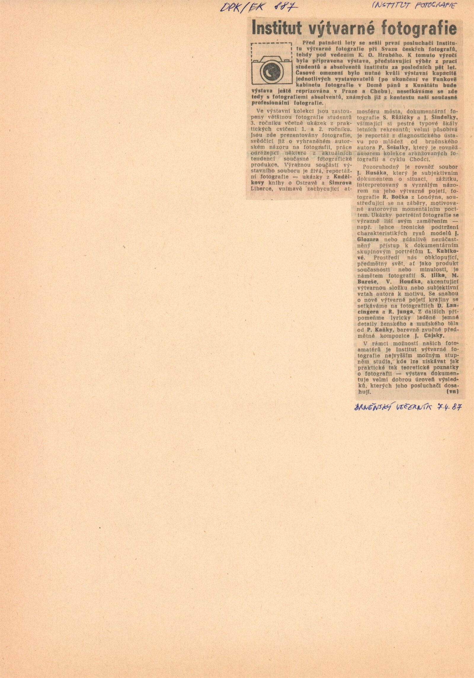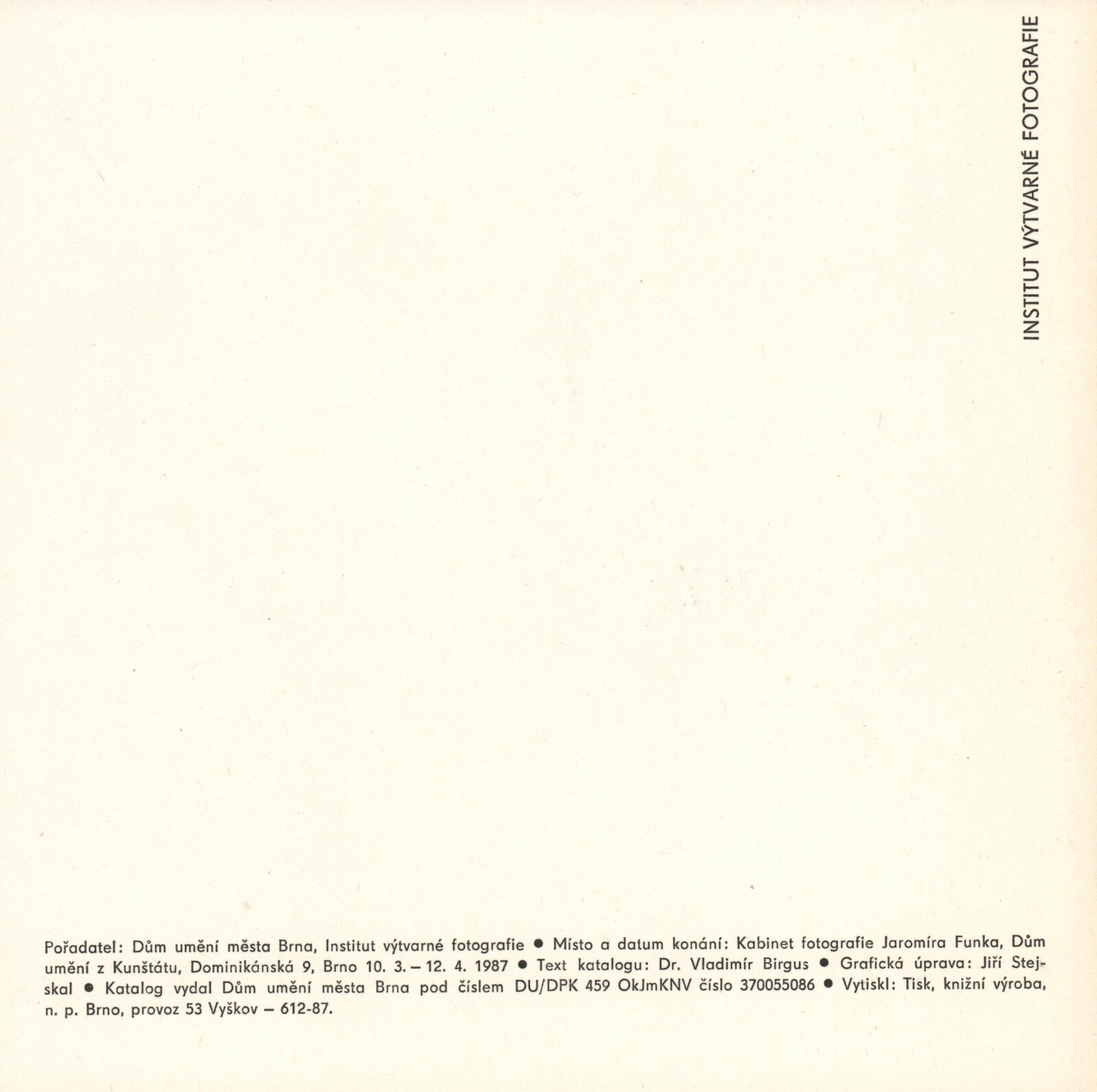 Institut výtvarné fotografie: Dům umění / Dům pánů z Kunštátu, Kabinet fotografie Jaromíra Funka, 10. 3. – 12. 4. 1987 / Text: Vladimír Birgus. – Brno: DUmB, 1987. – [16] s., obr., DPK 887. – MZK; MG; MMB