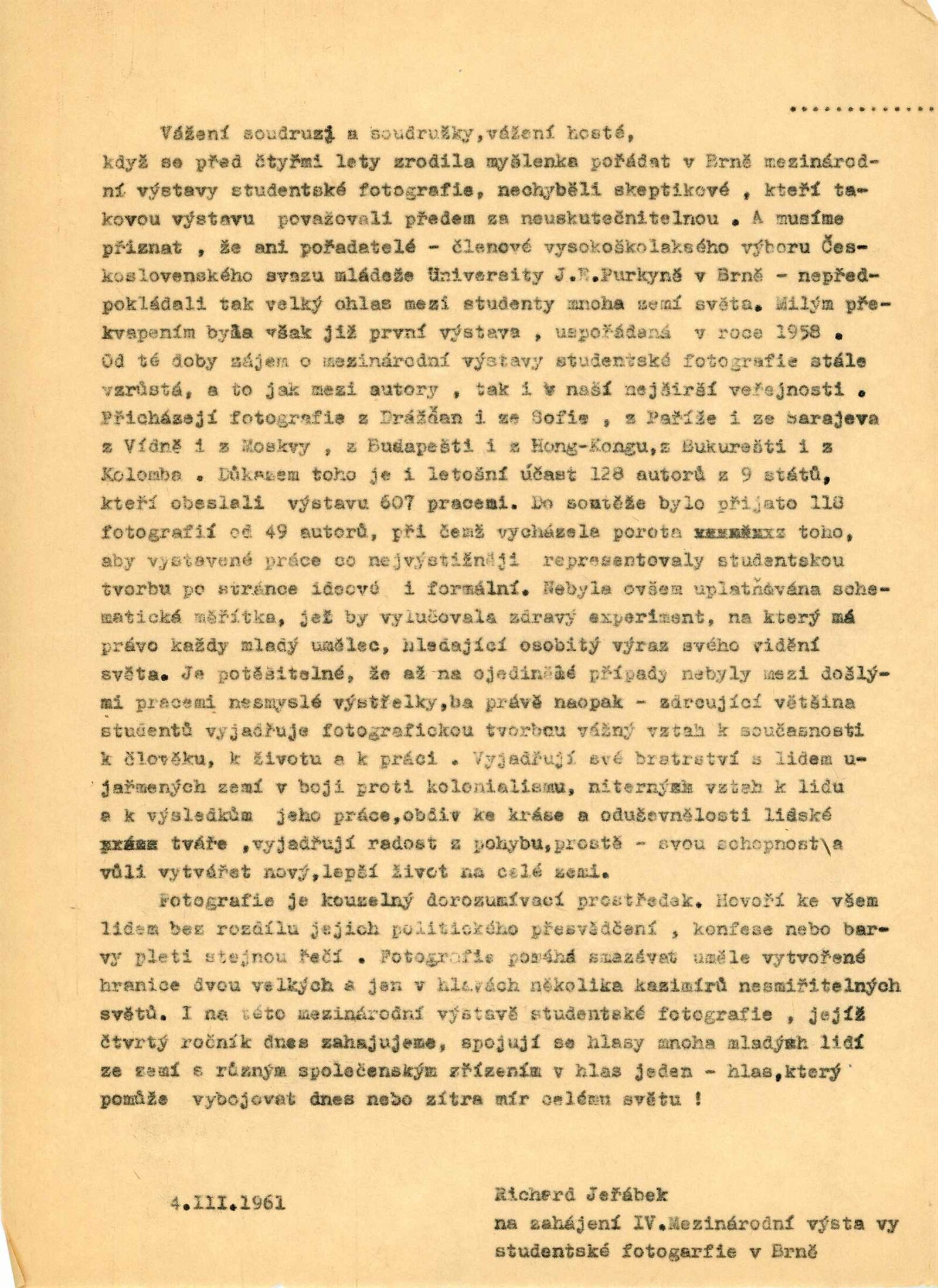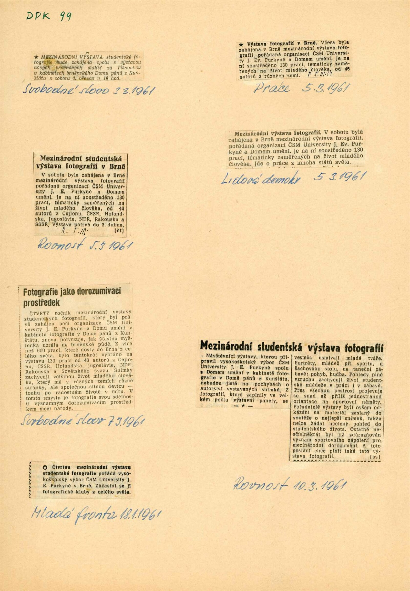 IV. mezinárodní studentská výstava fotografie: Dům umění města Brna / Dům pánů z Kunštátu, 21. výstava Kabinetu fotografie Jaromíra Funka, 4. 3. – 4. 4. 1961 / B. m. n. r. – skládačka, 6 s., DPK 99