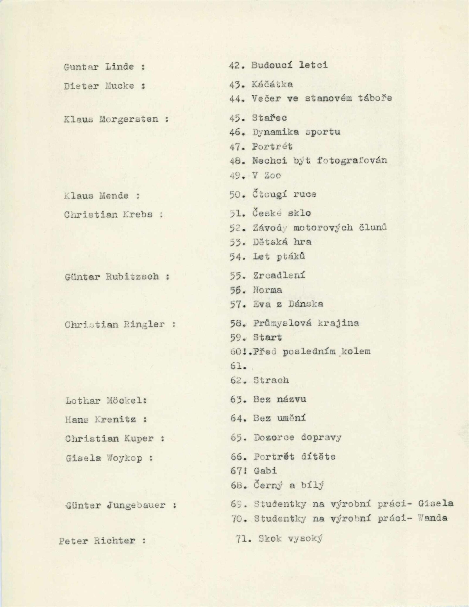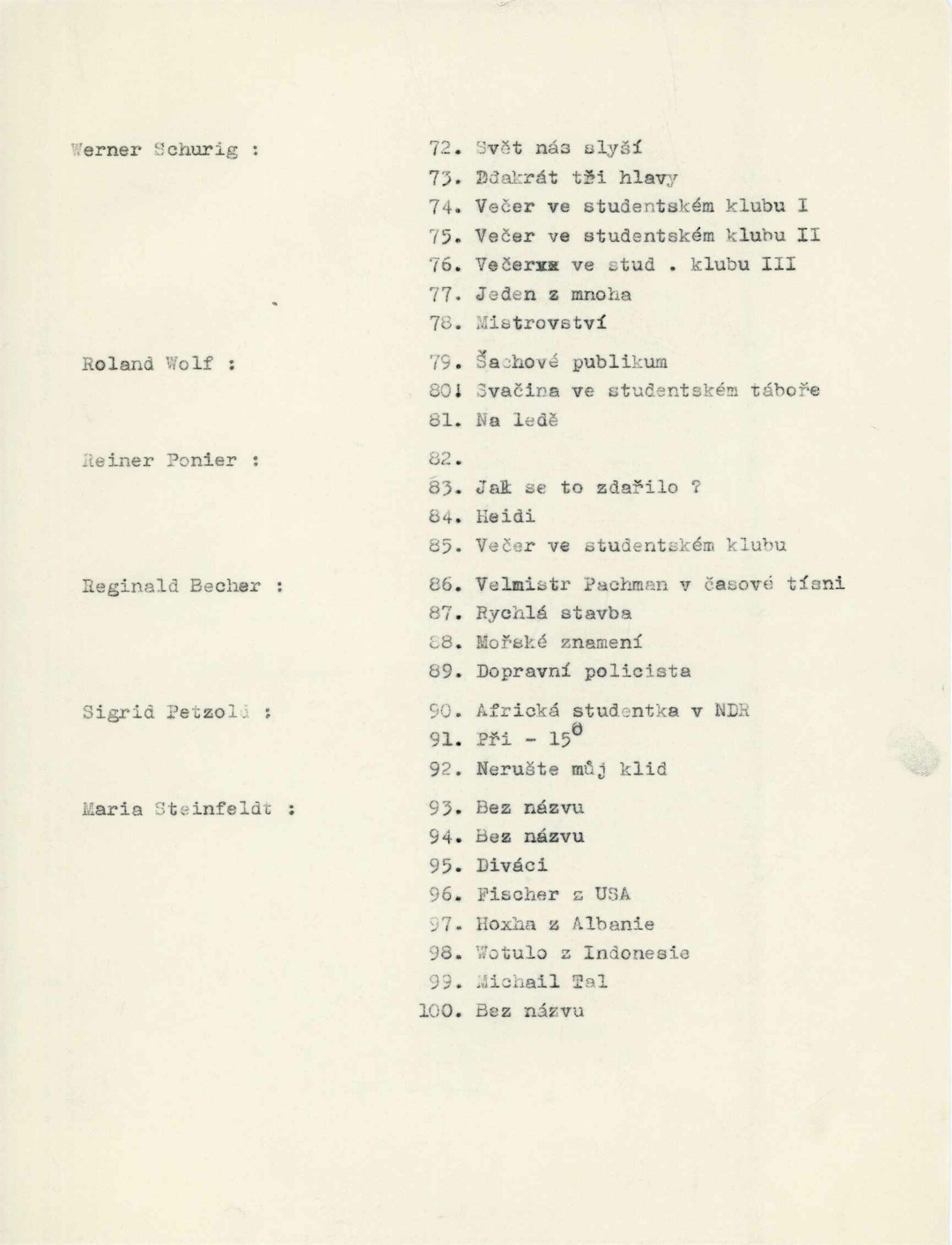 Pavel Dias, Zdeněk Kratochvíl, Pavel Lipovský, Jiří Menšík, Pavel Mikšovský, Hilda Misurová, Bohumil Puskailer, Václav Rupeš, Karol Stopka, Karel Šálek, T. M. Siriwarsene, Gamini Hemasiri, Dirk Wiersma, Radoslav Rankovič, Nedeljko Kurilič, Živadin Dimitrijevič, Vladimir Lapčevič, Milovan Simič, Božidar Outrata, Gisela Brandt, Klaus Fischer, Christine Brosch, Volkmar Billeb, Guntar Linde, Dieter Mucke, Klaus Morgersten, Klaus Mende, Christian Krebs, Günter Rubitzsch, Christian Ringler, Lothar Möcke, Hans Krenitz, Christian Kuper, Gisela Woykop, Günter Jungebauer, Peter Richter, Werner Schurig, Rolad Wolf, Reiner Ponier, Reginald Becher, Sigrid Petzold, Maria Steinfeldt, Hanno Rank, Ferdinand Karl