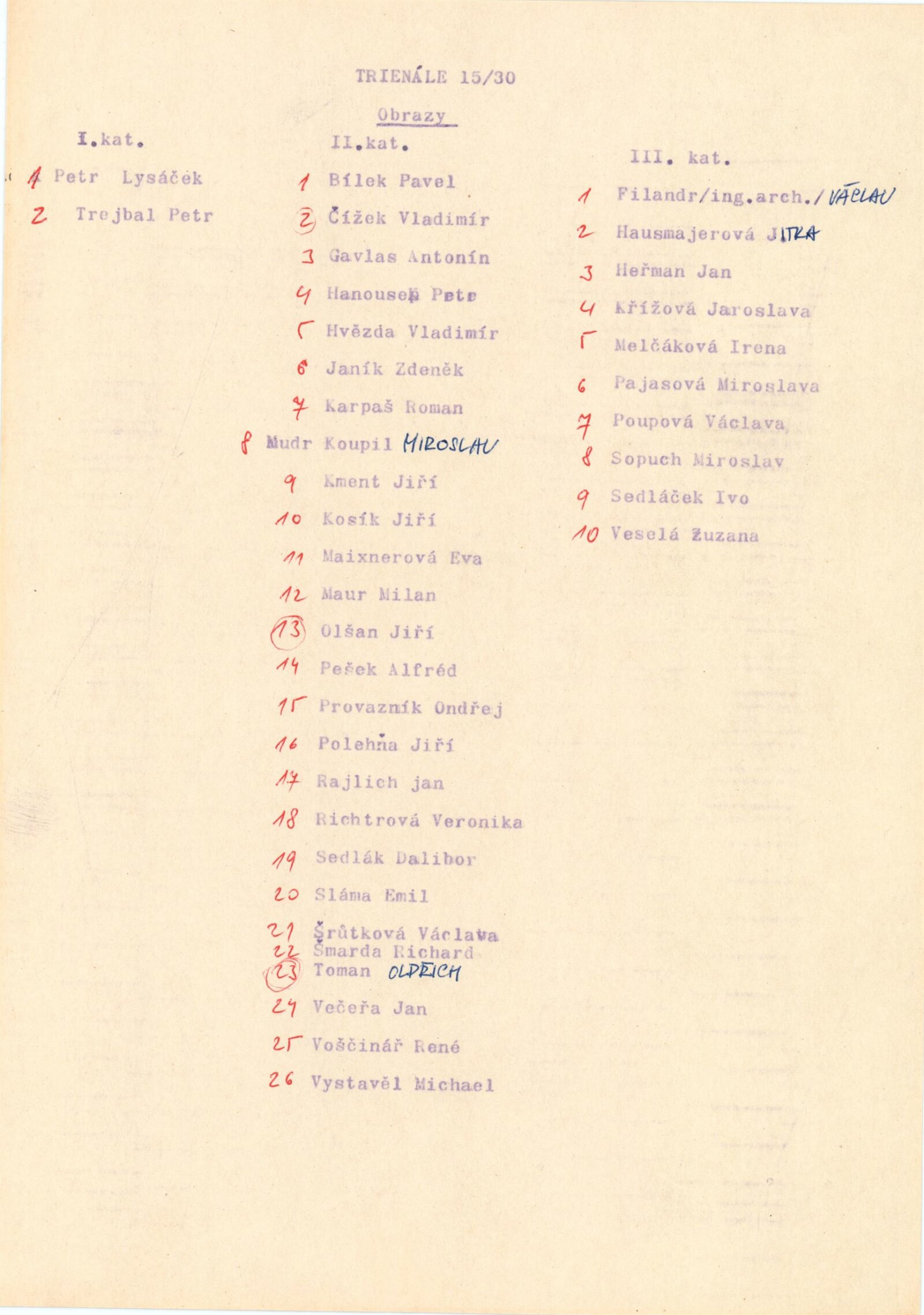 Pavel Bílek, Vladimír Čížek, Václav Filandr, Antonín Gavlas, Petr Hanousek, Jiřina Hausmajerová, Jan Heřman, Vladimír Hvězda, Zdeněk Janík, Roman Karpaš, Jaroslava Křížová, Jiří Kment, Jiří Kosík, Miroslav Koupil, Petr Lysáček, Eva Maixnerová, Milan Mour, Irena Melčáková, Jiří Olšan, Miroslava Pajasová, Stanislav Pata, Alfréd Pešek, Jiří Polehňa, Ondřej Provazník, Václava Poupová, Jan Rajlich, Veronika Richtrová, Dalibor Sedlák, Emil Sláma, Miroslav Sopuch, Richard Šmarda, Václava Šrůtková, Oldřich Toman, Petr Trejbal, Jan Večeřa, Zuzana Veselá, René Voščinár, Michael Vystavěl, Vladimír Ambroz, Jana Bělohradská, Kateřina Beranová, Viktor Blažek, Dušan Černý, Jindřiška Dlouhá, Světlana Dostálková, Petr Háj, Pavel Holouš, Radek Horáček, Dana Chatrná, Jiří Iliev, Petr Jochmann, Roman Karpaš, Ivo Koníček-Karen, Karol König, Olga Kopecká, Eva Krejčová, Ludvík Kuchař, Lydie Labská, Jana Lewczyszynová, Jana Magniová, Marie Mertová, Miloš Michálek, Milan Obenaus, Jiří Olšan, Věra Palečková, Jarmila Přibylová, Marie Rivolová, Ivo Sedláček, Kateřina Šecová, Ladislav Šikola, Miroslava Slámová, Sylvie Škrášková, Pavel Tejkal, Oldřich Toman, Olga Weidenthalerová, Jitka Zdražilová, Vladimír Čížek, Milan Exner, Boris Goldobin, Pavel Hanoušek, Jaroslava Heiderová, Miroslav Hudlička, Miroslav Kopecký, Jana Koutecká, Václav Plechatý, Alois Štauder, Oldřich Štěpánek, Eva Damborská, Emanuel Holek, Jiří Štros, Michael Vystavěl